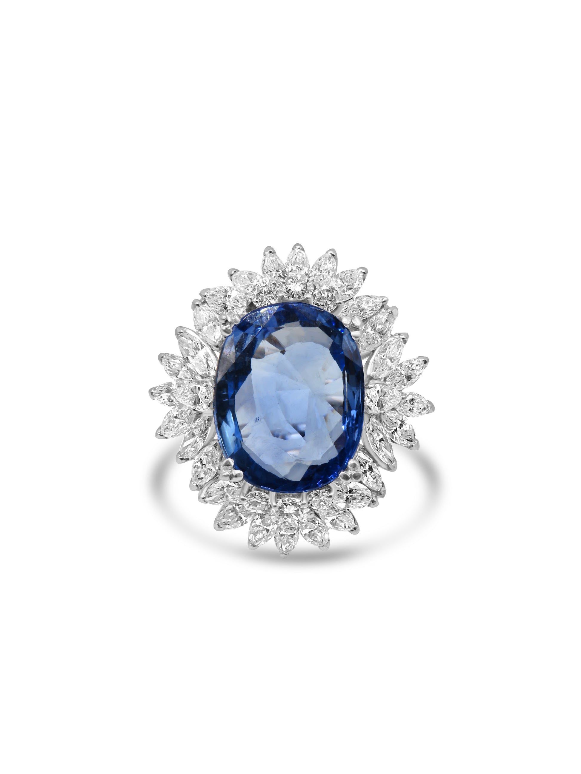 Mozafarian exquisite 18-karat white gold ring showcasing a natural Burmese sapphire of exceptional quality, untreated to preserve its authentic character. The oval-cut gemstone is elegantly framed by a constellation of marquise-cut diamonds, their brilliant facets amplifying the sapphire's deep, captivating hue.