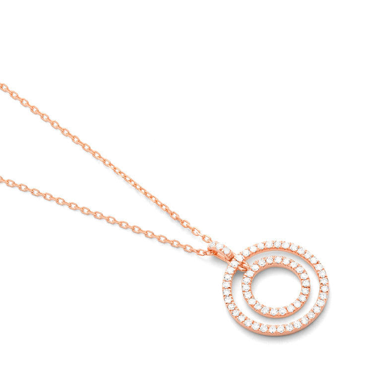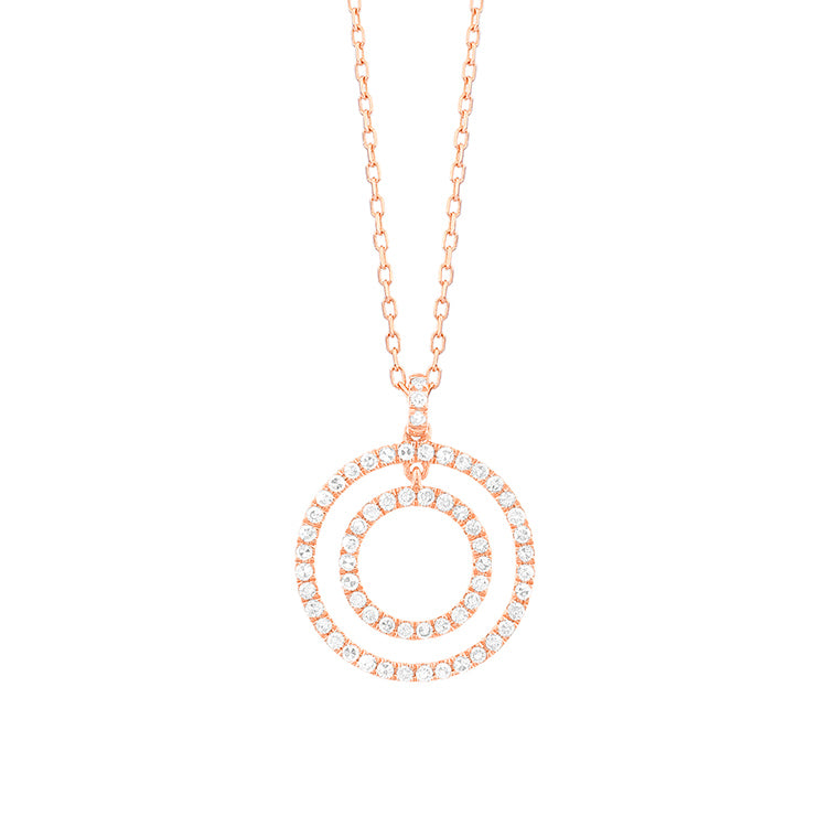 This elegant pendant is crafted in 18k rose gold and features two concentric circles set with brilliant-cut diamonds. The layered design creates a sense of harmony and movement, while the warm tone of the rose gold enhances the soft sparkle of each stone.
