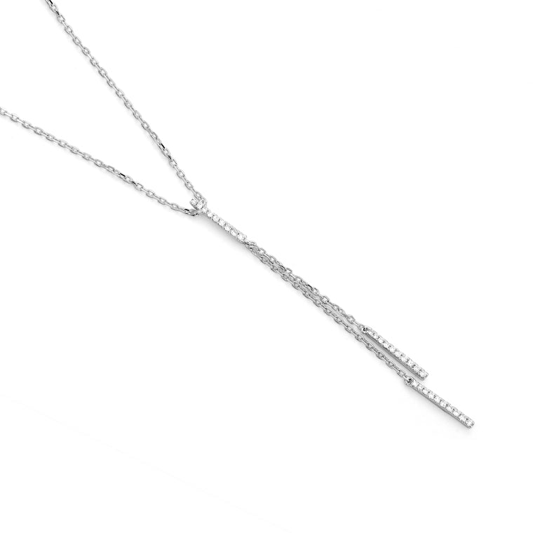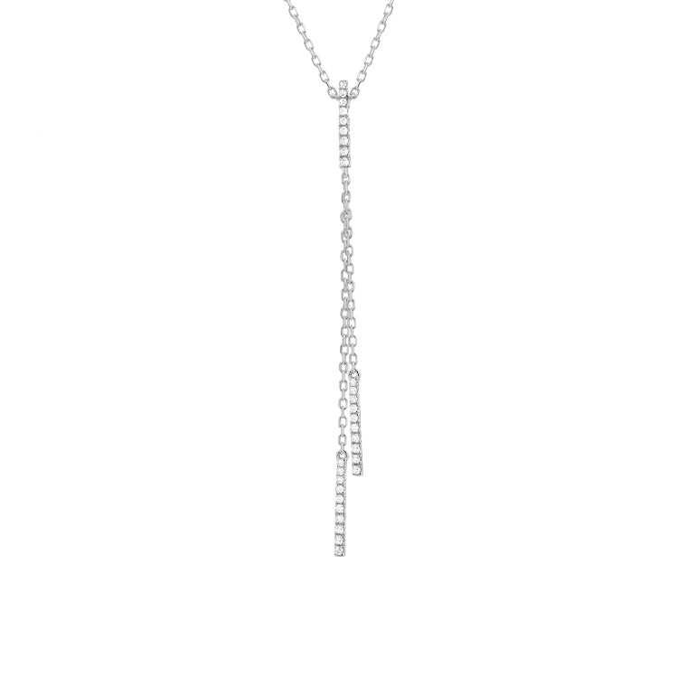 Sleek and contemporary, this necklace is crafted in 18k white gold and features a vertical drop design set with brilliant-cut diamonds. Two fine chains fall from a central pavé bar, creating fluid movement and elegant sparkle with every step.
