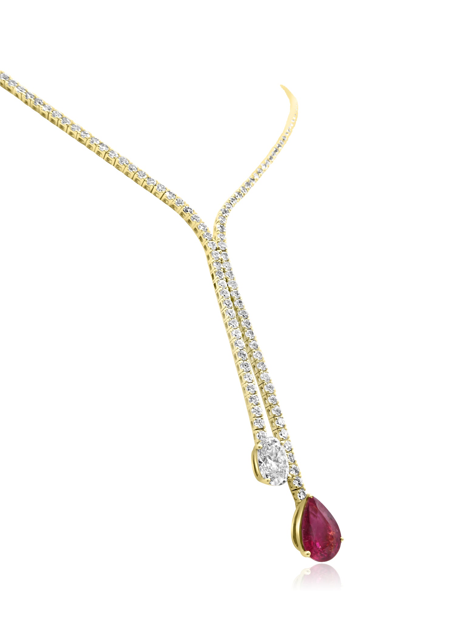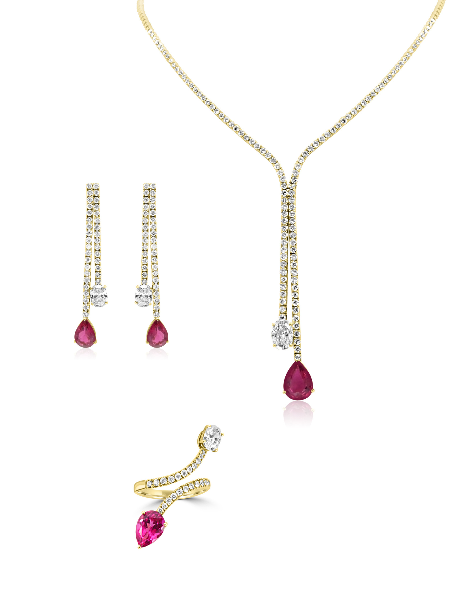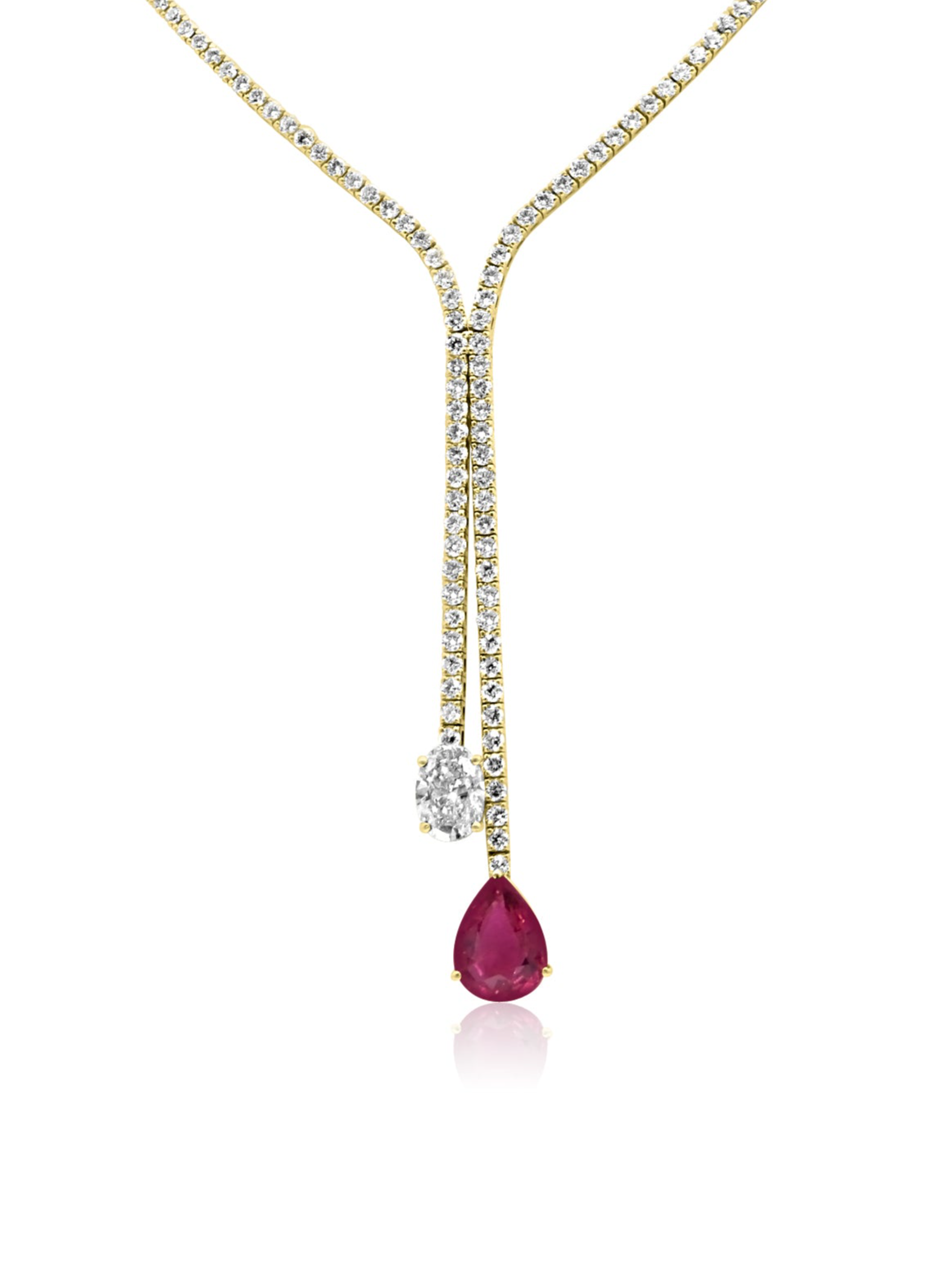18k gold necklace featuring a striking diamond and a rubellite as the main focal point. Adorned with smaller diamonds that run along the chain, this piece is a beautiful statement accessory. Matching earrings and ring also available at an additional cost.
