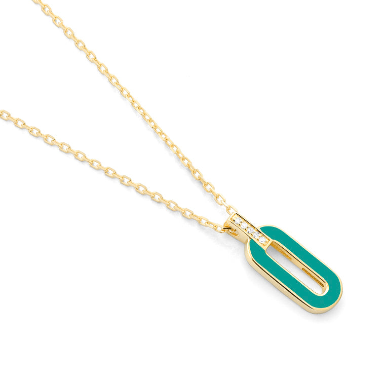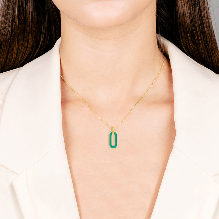 Playful yet polished, this 18k yellow gold necklace features an elongated oval pendant in vibrant turquoise enamel. A vertical line of brilliant-cut diamonds adds a hint of sparkle, creating a balanced contrast between color and light. Effortlessly modern, it's perfect for layering or adding a pop of color to everyday looks.
