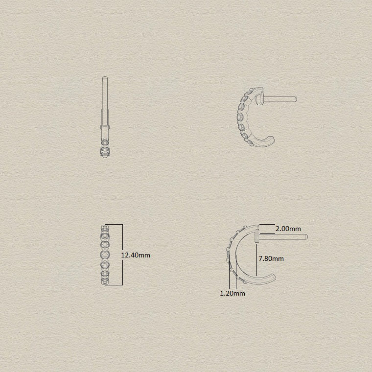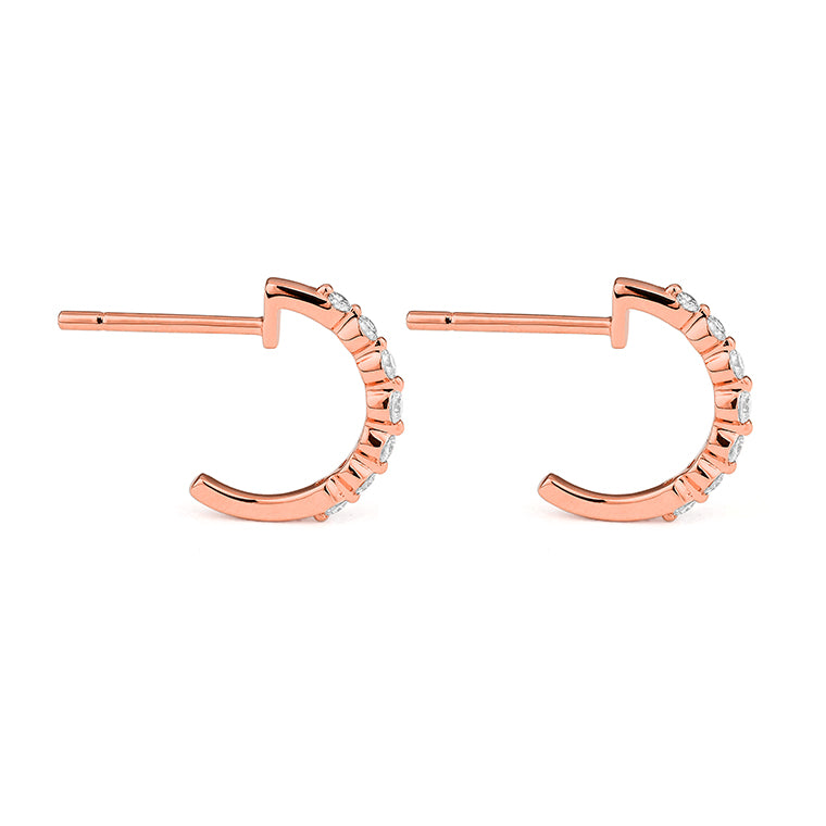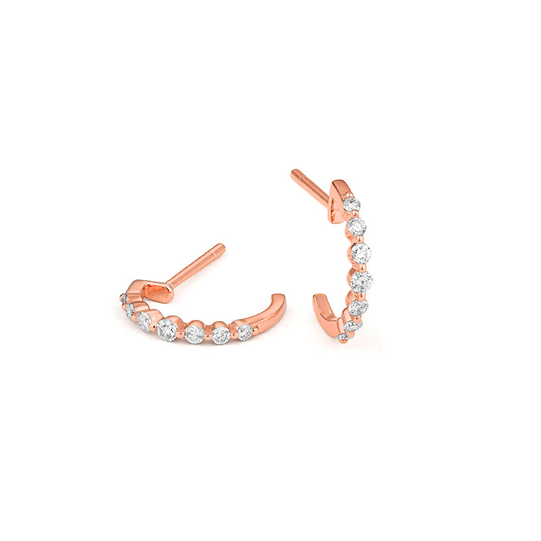 Graceful and sparkling, these 18k rose gold earrings feature a refined arc of 14 round brilliant diamonds. With a soft curve that gently hugs the lobe, they offer a modern alternative to traditional hoops — delicate yet striking.