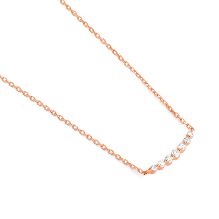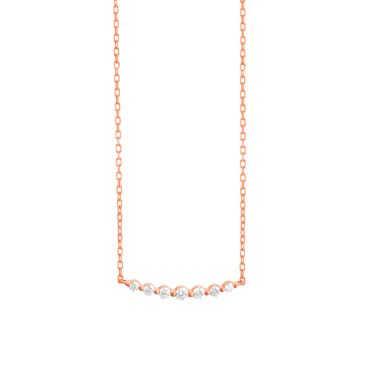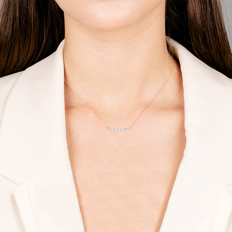 Understated and refined, this necklace is crafted in 18k rose gold and features a graceful arc of seven brilliant-cut diamonds. Graduating gently in size, the stones create a soft, natural curve that flatters the neckline and adds just the right touch of sparkle.