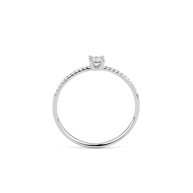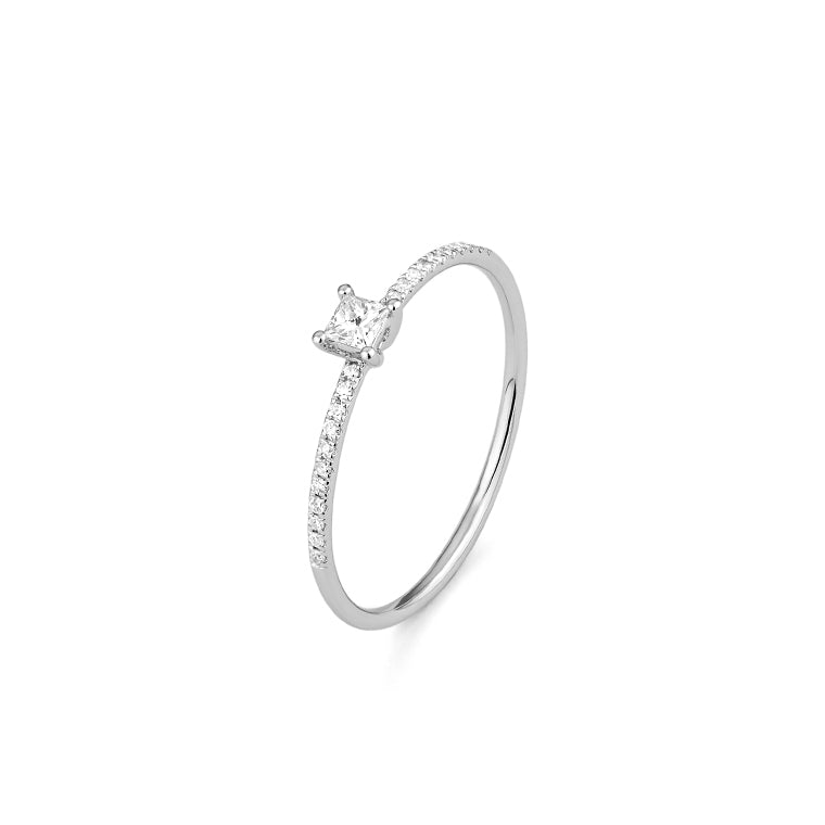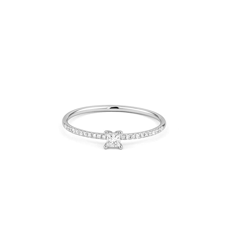 This delicate diamond ring is crafted in 18k white gold and features a refined silhouette designed for effortless elegance. A princess-cut diamond sits at the center, elevated on a fine band paved with brilliant-cut diamonds that shimmer with quiet sophistication.