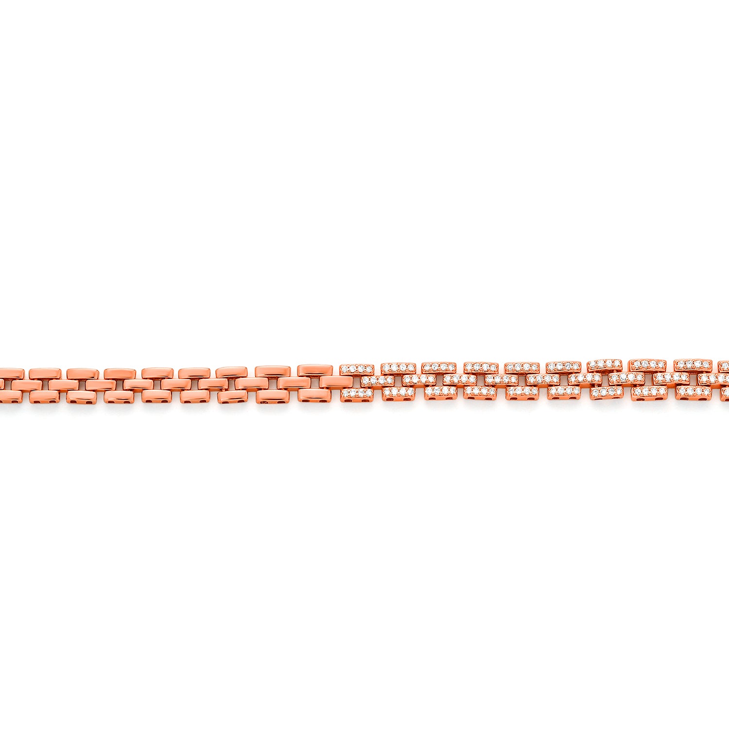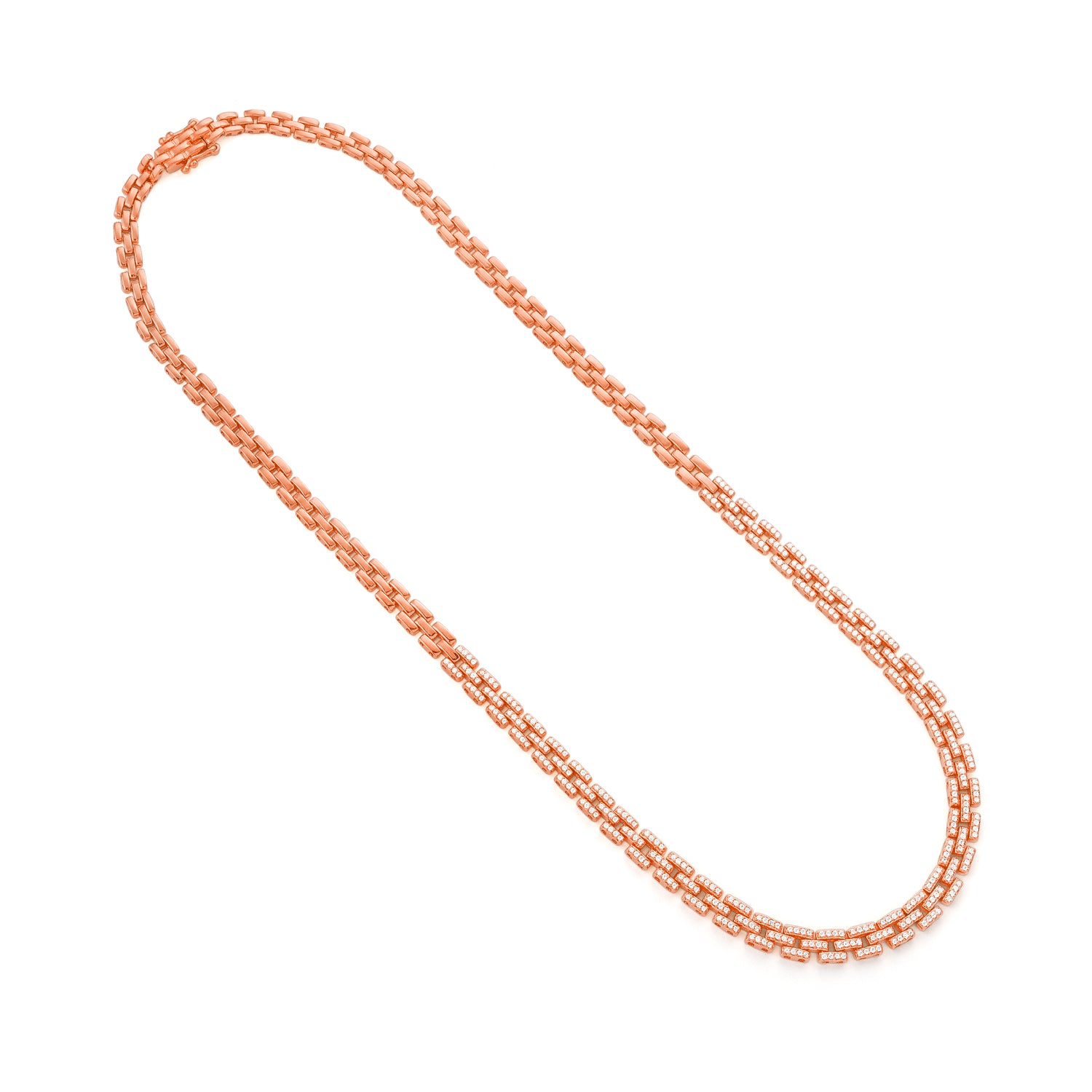 A bold expression of craftsmanship and elegance - this 18k rose gold necklace is composed of interlinked diamond-set elements that echo a classic chain silhouette. With 404 precisely placed diamonds, it radiates light from every angle while offering a structured, contemporary profile.