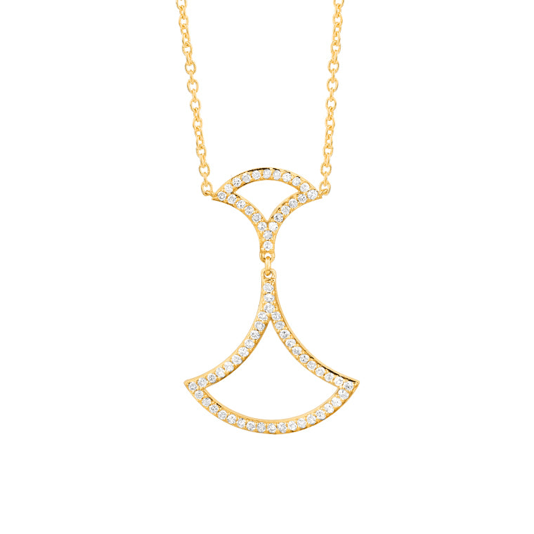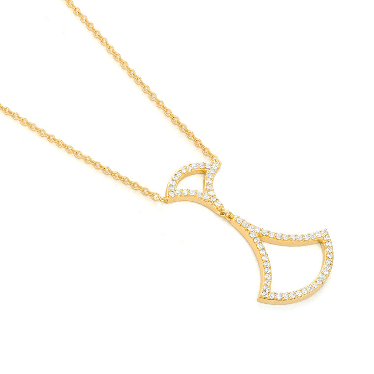 This striking pendant in 18k yellow gold showcases a bold open fan-shaped design, delicately accented with pavé-set diamonds along the curves. The balanced composition and sculptural detail create an effortlessly sophisticated statement.