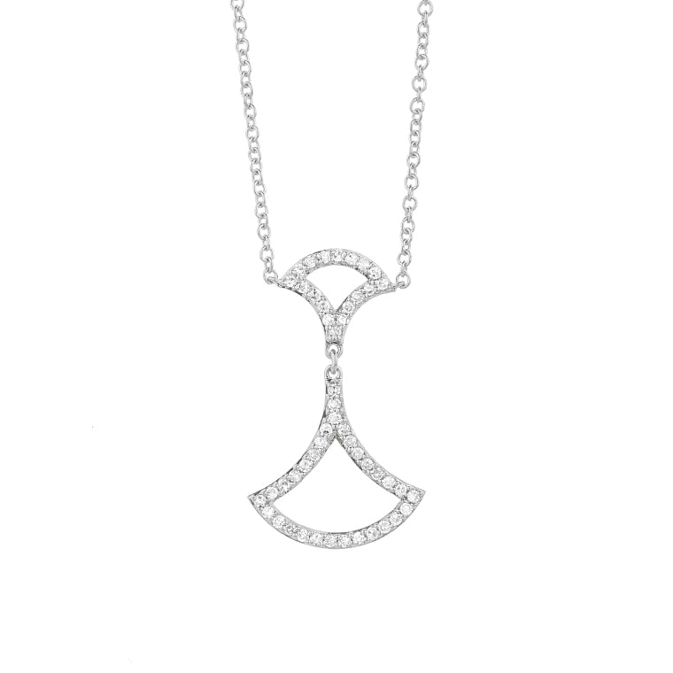 Crafted in 18k white gold, this sculptural pendant features an elegant openwork fan motif, accentuated with a dazzling array of pavé-set diamonds. The piece balances refined geometry with radiant brilliance, perfect for elevated daily wear or evening allure.