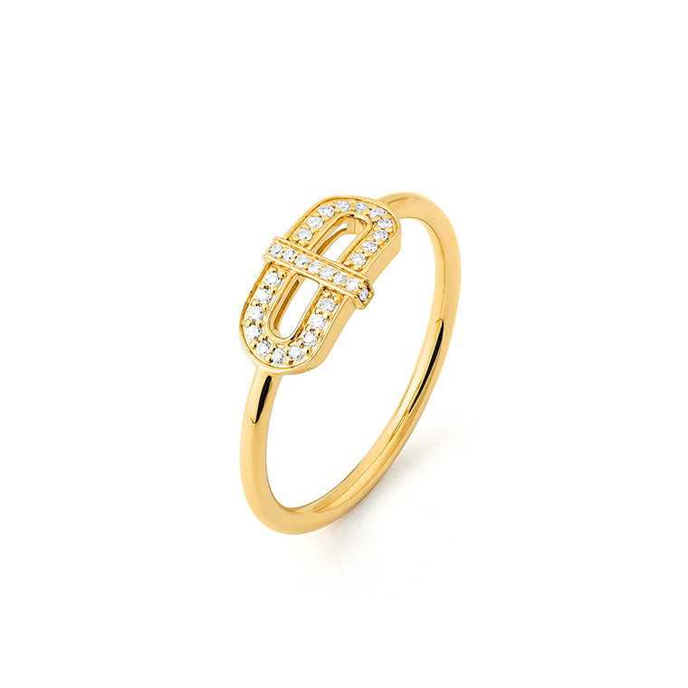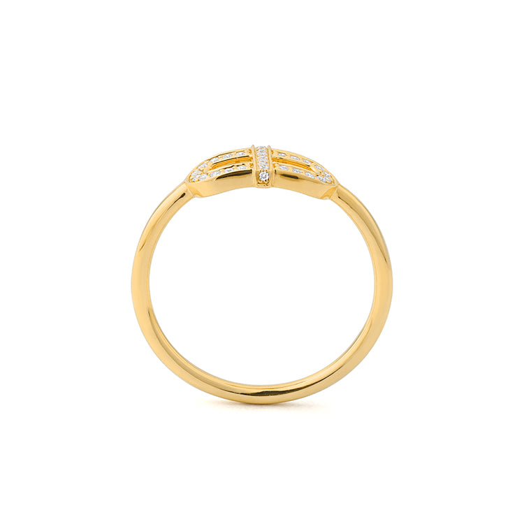 A bold yet graceful ring crafted in 18k yellow gold, featuring a double-loop belt motif traced with brilliant-cut diamonds. Its structured silhouette and sparkling curves lend a contemporary edge, ideal for adding a chic statement to your everyday style.