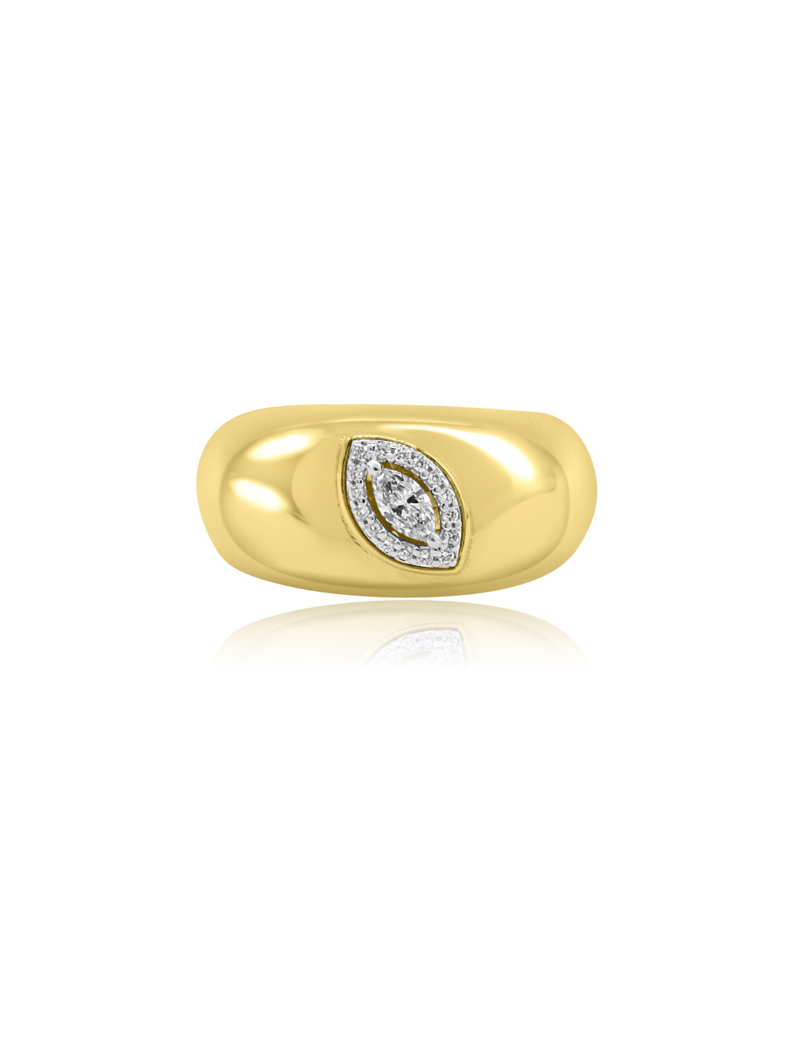 Mozafarian's breathtaking 18 karat gold ring featuring small round cut diamonds arranged in a marquise shape at the centre, while additional diamonds adorn the edges of the ring. The inside of the band showcases intricately carved art. Perfect statement piece.