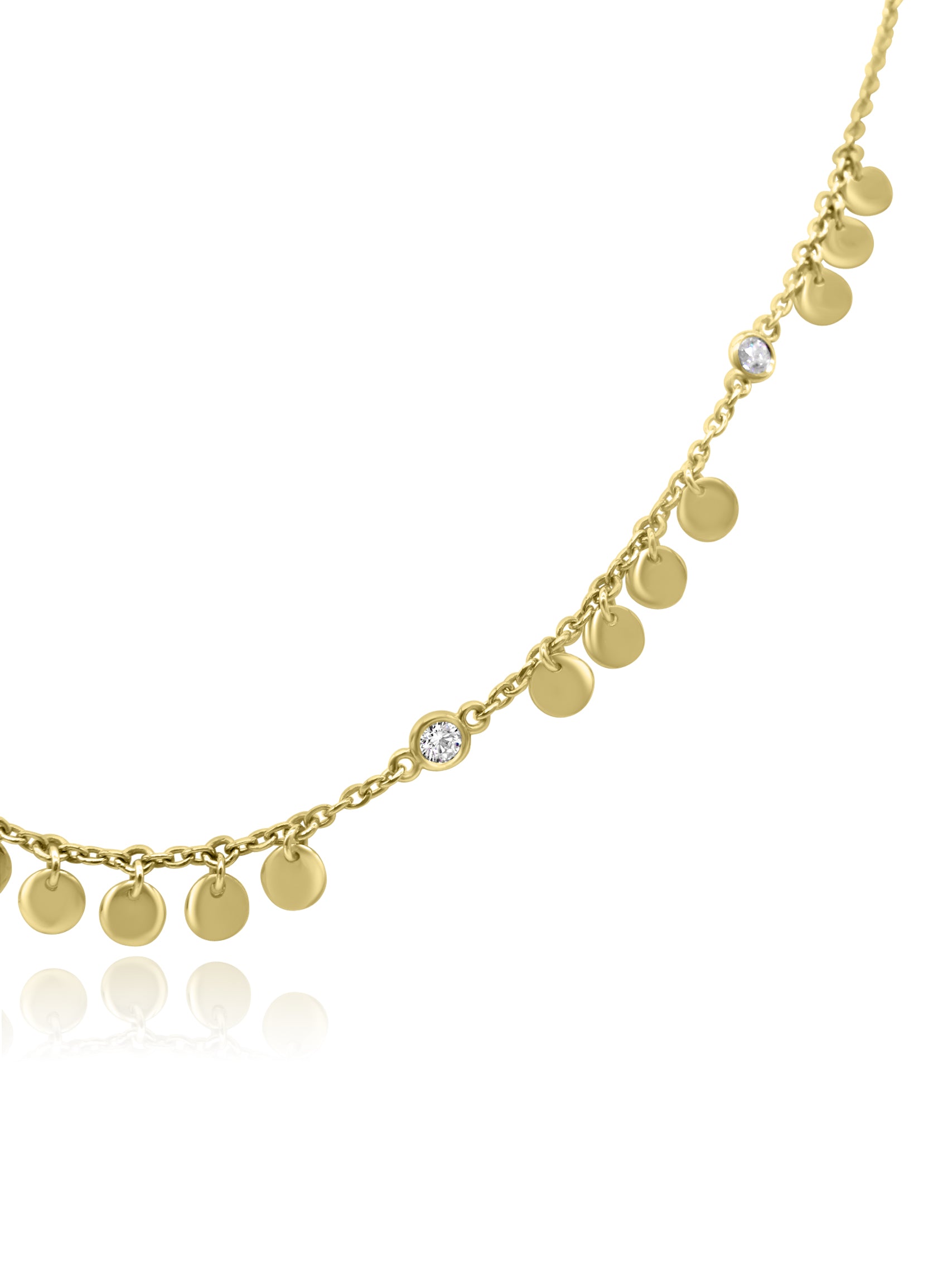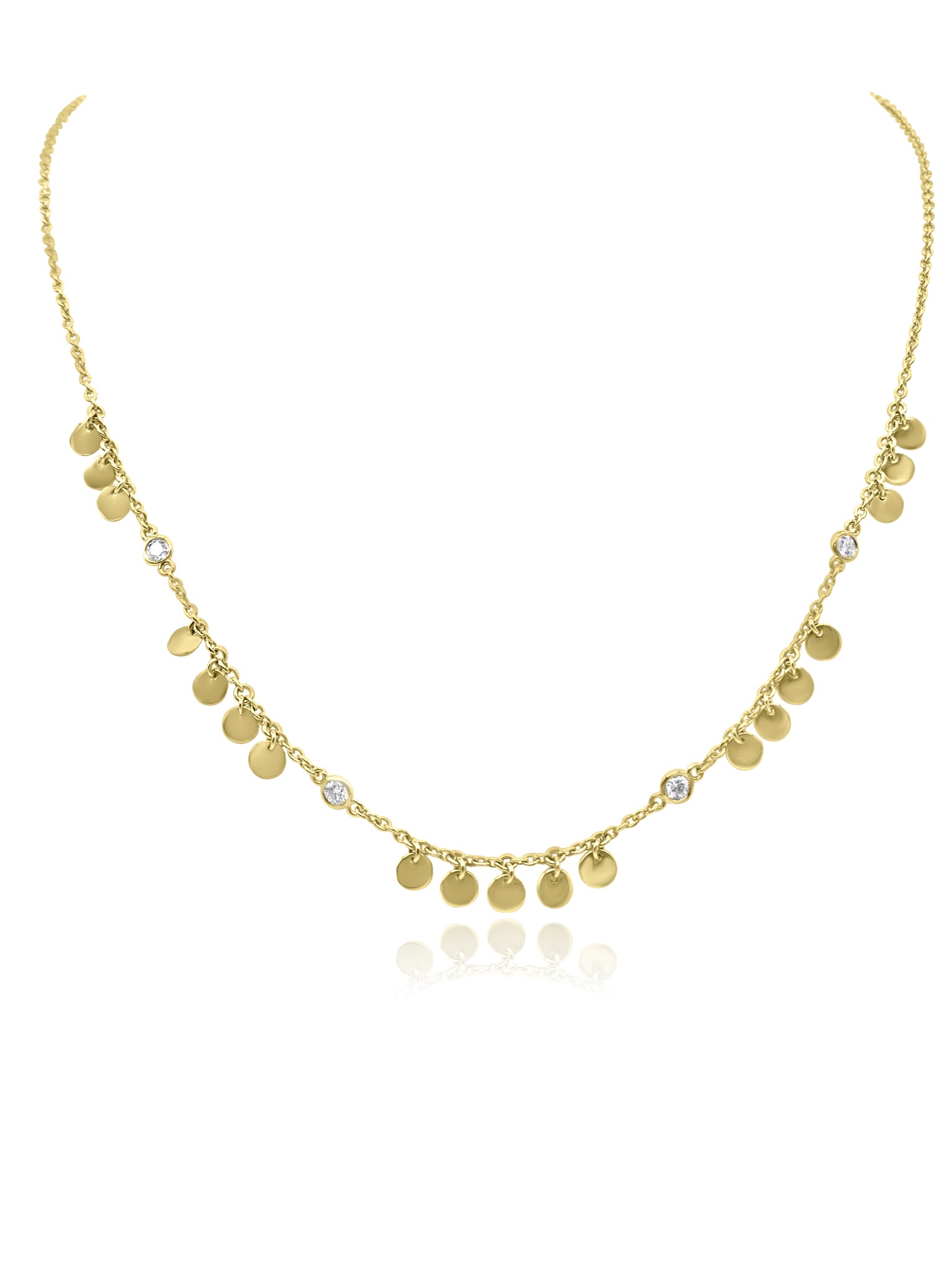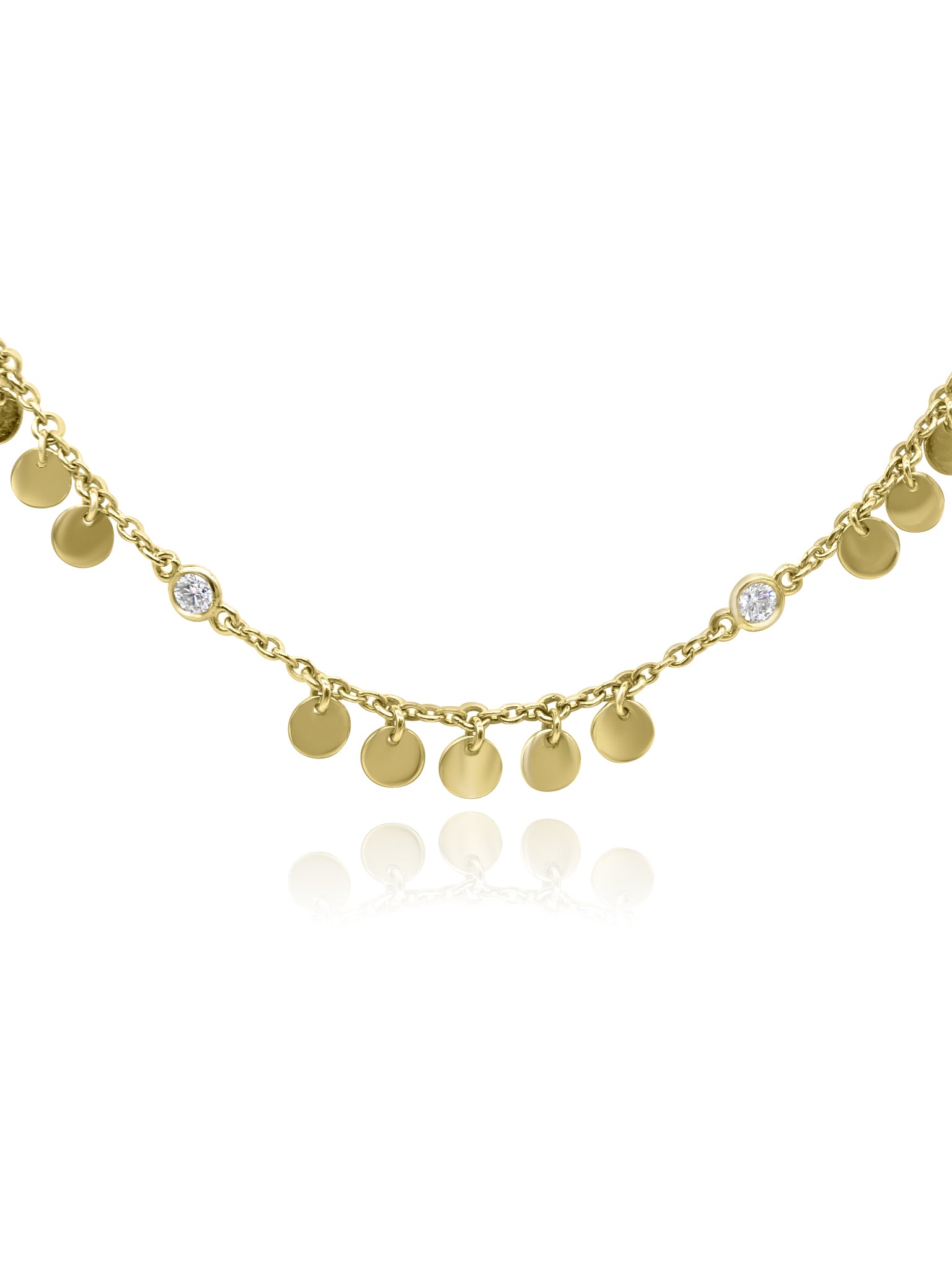 Elegant necklace crafted from 18-karat rose gold featuring a delicate chain adorned with small, polished gold discs that dangle gracefully. Interspersed among the discs are sparkling diamonds. The combination of rose gold and diamonds creates a sophisticated yet understated look, perfect for those who appreciate subtle elegance.
