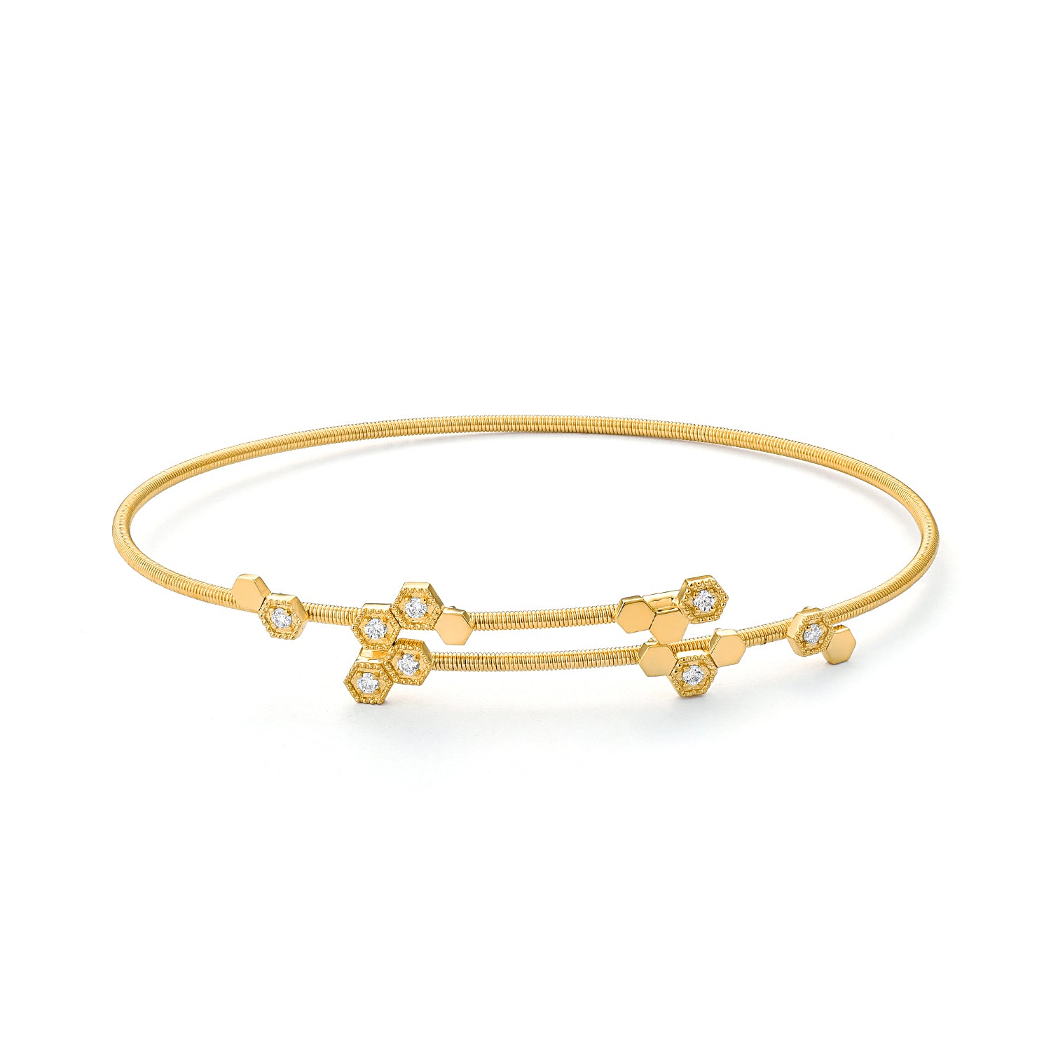 Geometric charm meets refined detail - this 18k yellow gold bangle features a scattering of hexagonal motifs accented with brilliant-cut diamonds. The honeycomb-inspired design offers a clean, contemporary silhouette with subtle texture and depth.