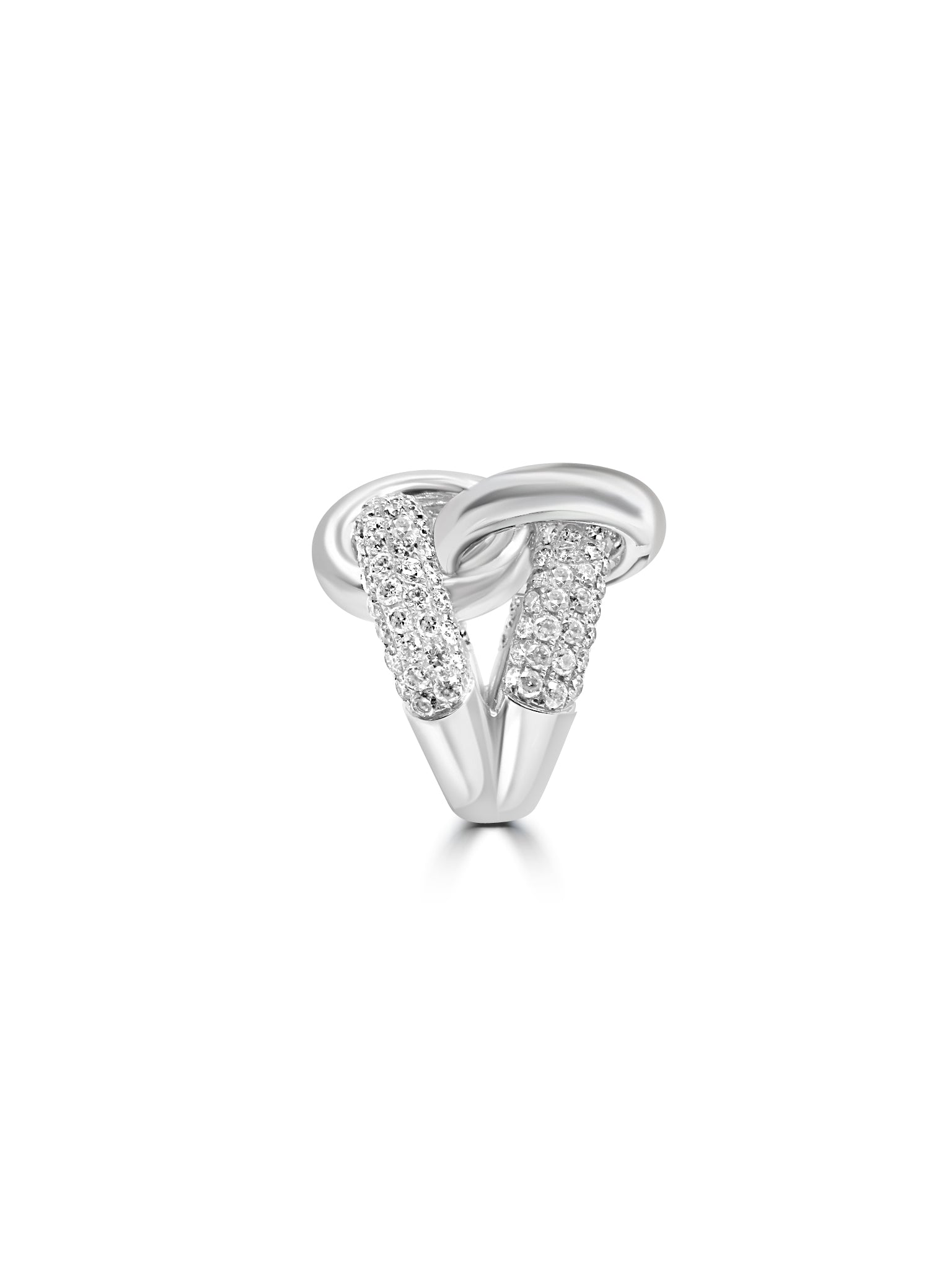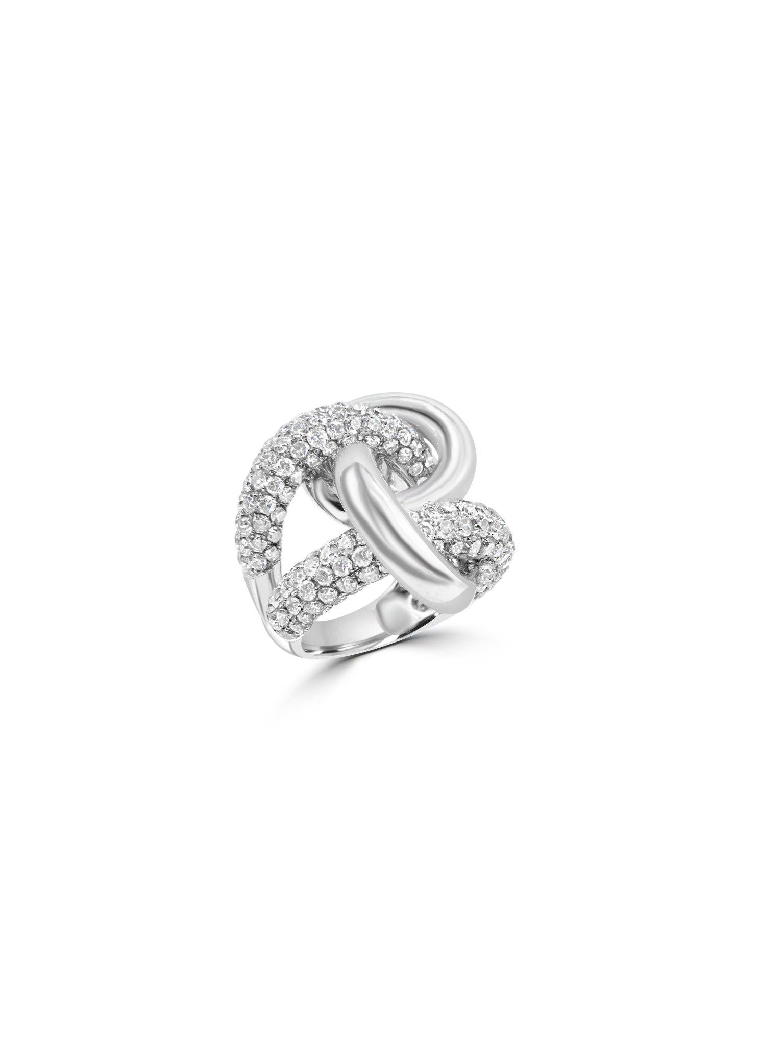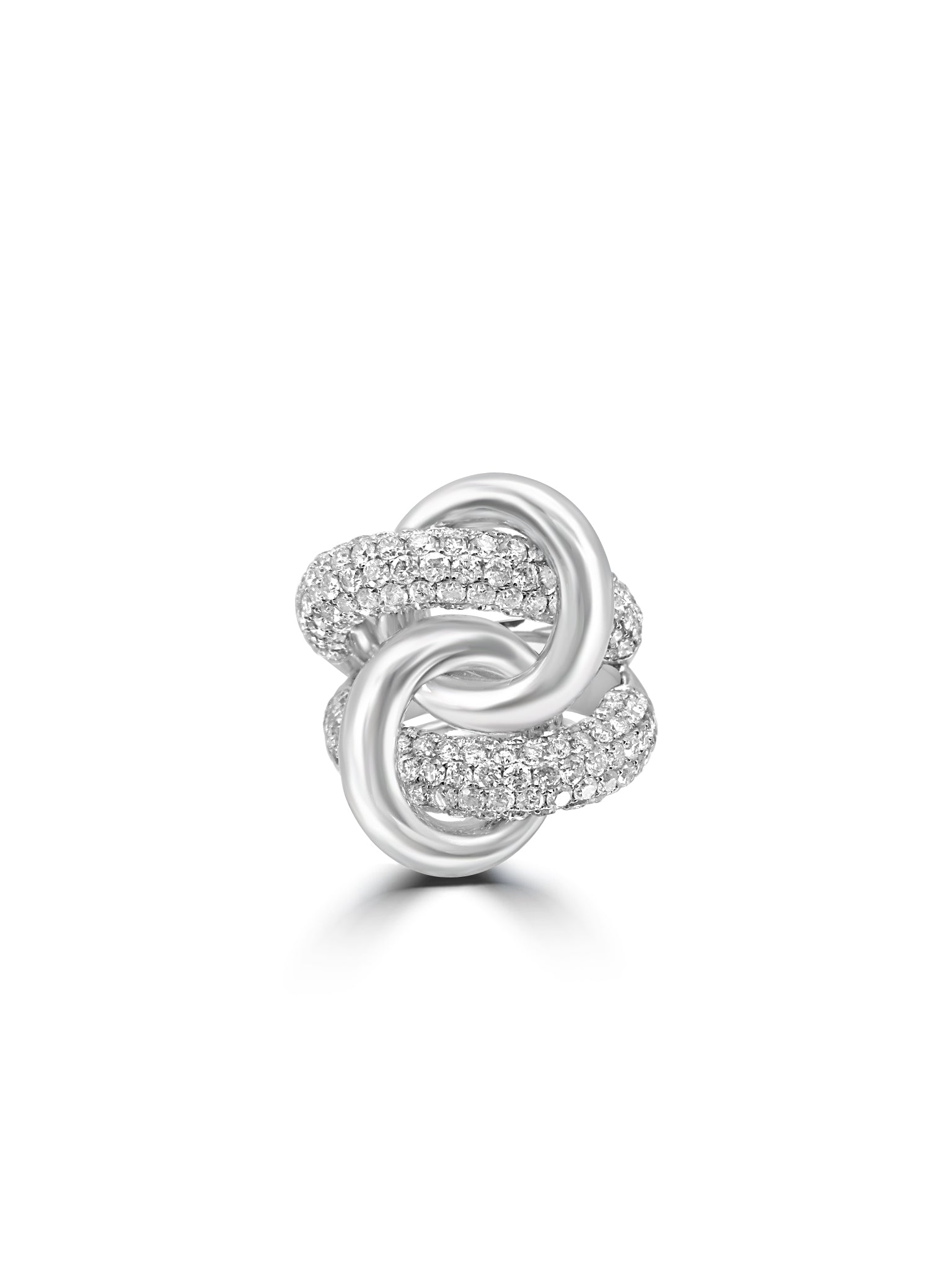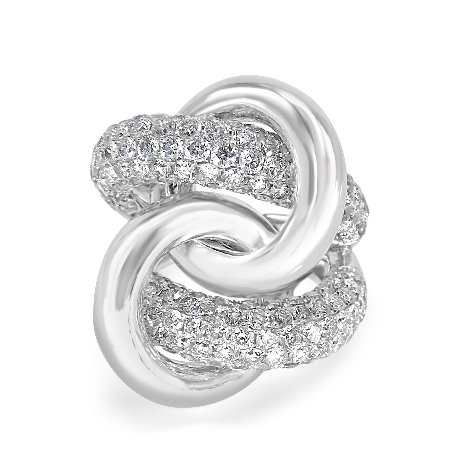 This exquisite platinum ring showcases an elegant love knot design, symbolizing timeless connection and unity. The ring is meticulously encrusted with sparkling white diamonds that create a brilliant shimmer from every angle. Its intricate, intertwined bands bring a bold yet refined sophistication, making it a truly standout piece. Perfect for adding a touch of luxury to any occasion, this ring is a stunning representation of enduring beauty and craftsmanship.