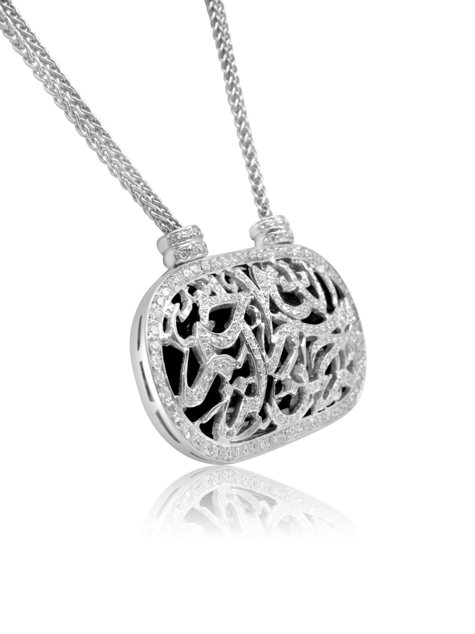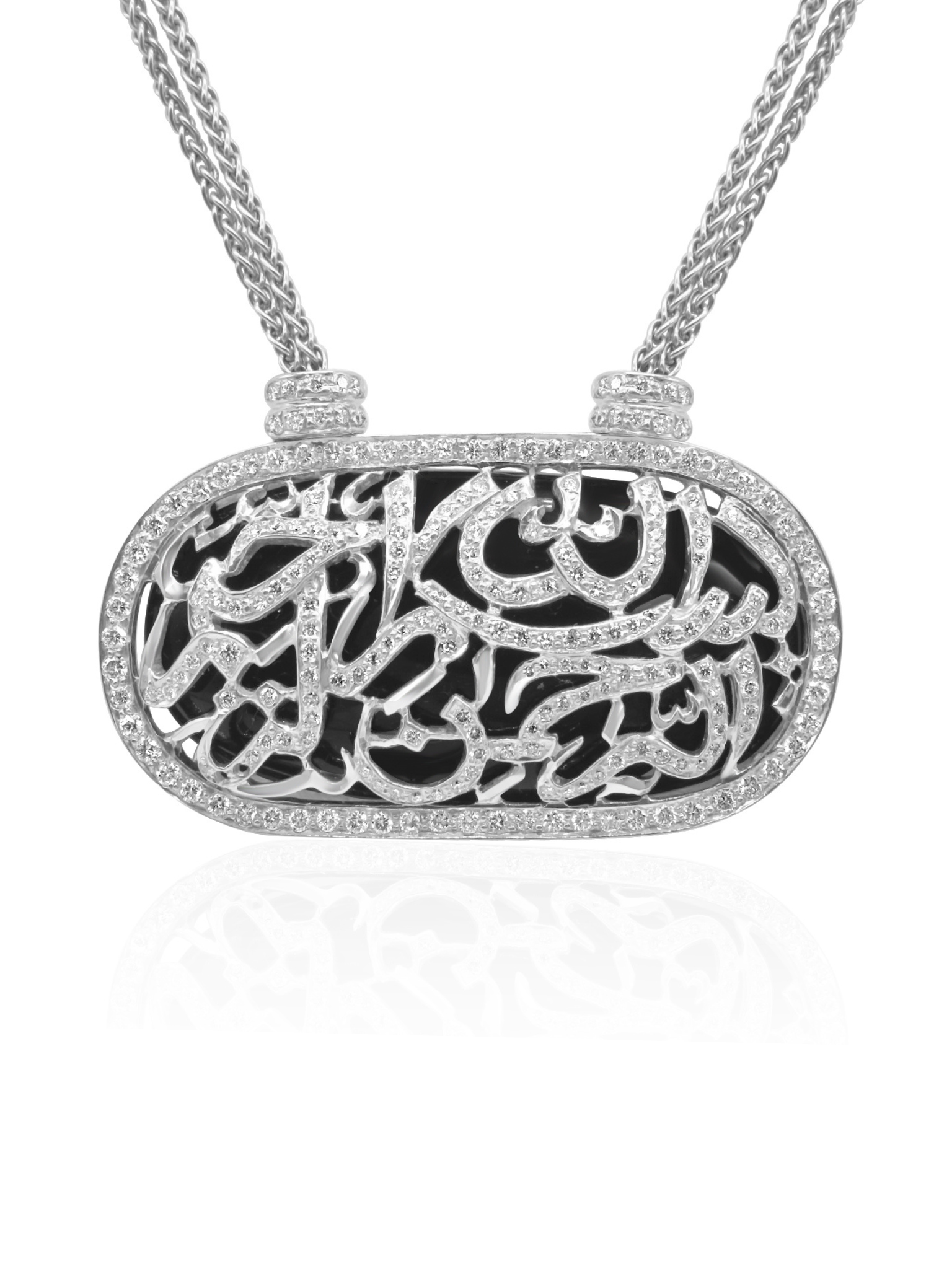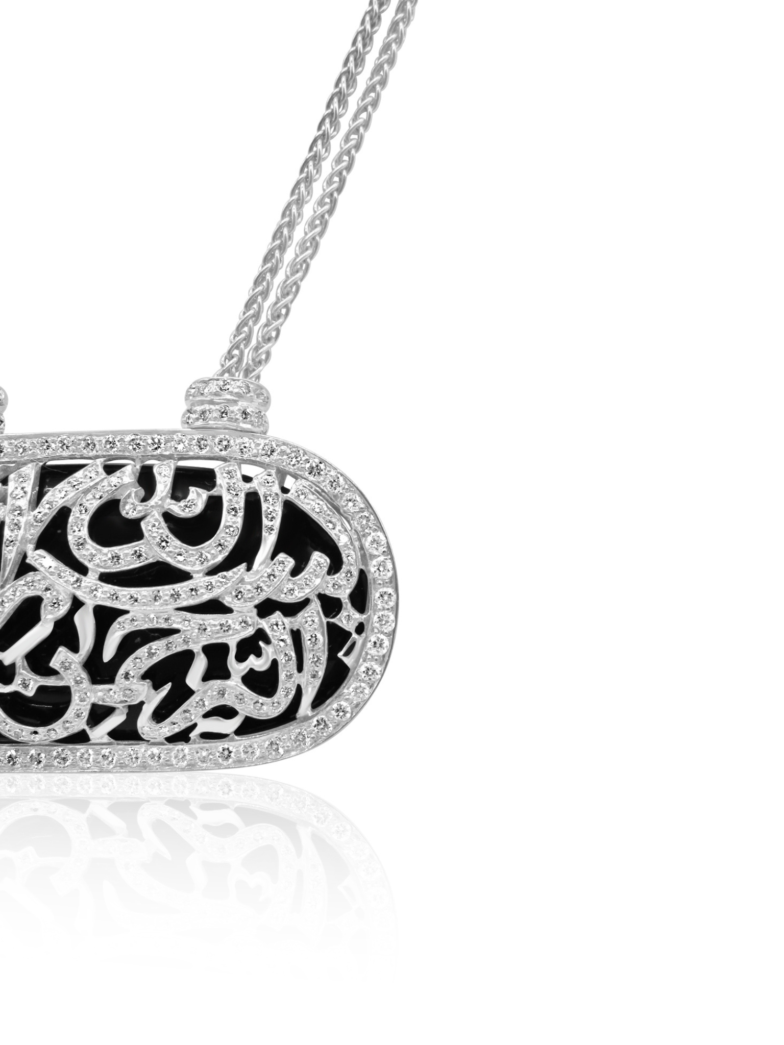 Mozafarian necklace featuring an 18-karat white gold double-chain with a diamond-studded pendant. A polished black onyx centre adds a bold contrast, making it a timeless statement piece.
