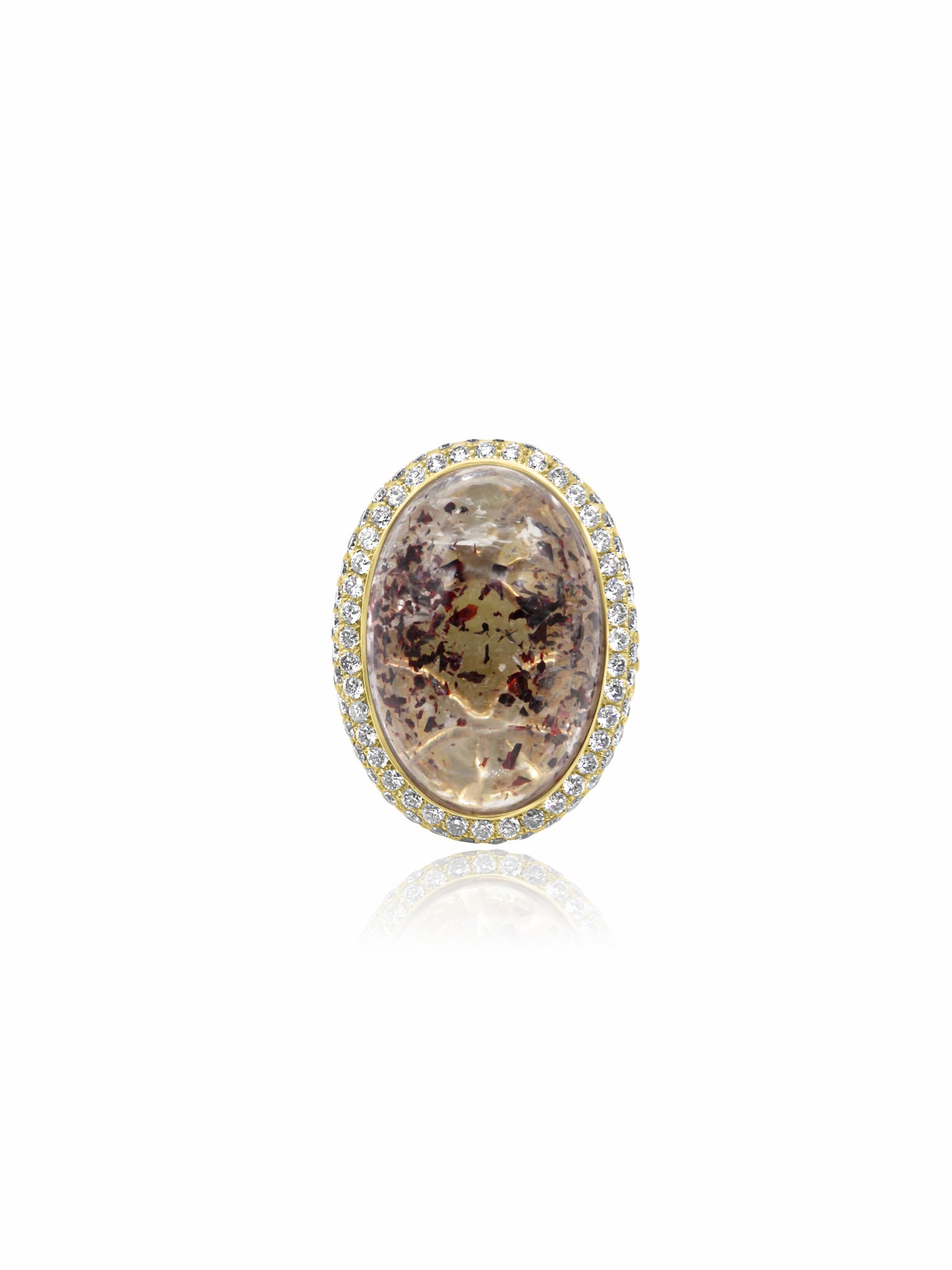 Breathtaking 18 karat gold band, perfectly encasing a large, oval rotalitte quartz that exudes natural beauty with its unique, earthy inclusions. The centrepiece is elegantly framed by a halo of dazzling diamonds that enhance the overall brilliance and luxury of the piece. The intricate design and exquisite craftsmanship make this ring a true statement piece, ideal for those who appreciate both the raw beauty of nature and the timeless allure of fine jewellery.