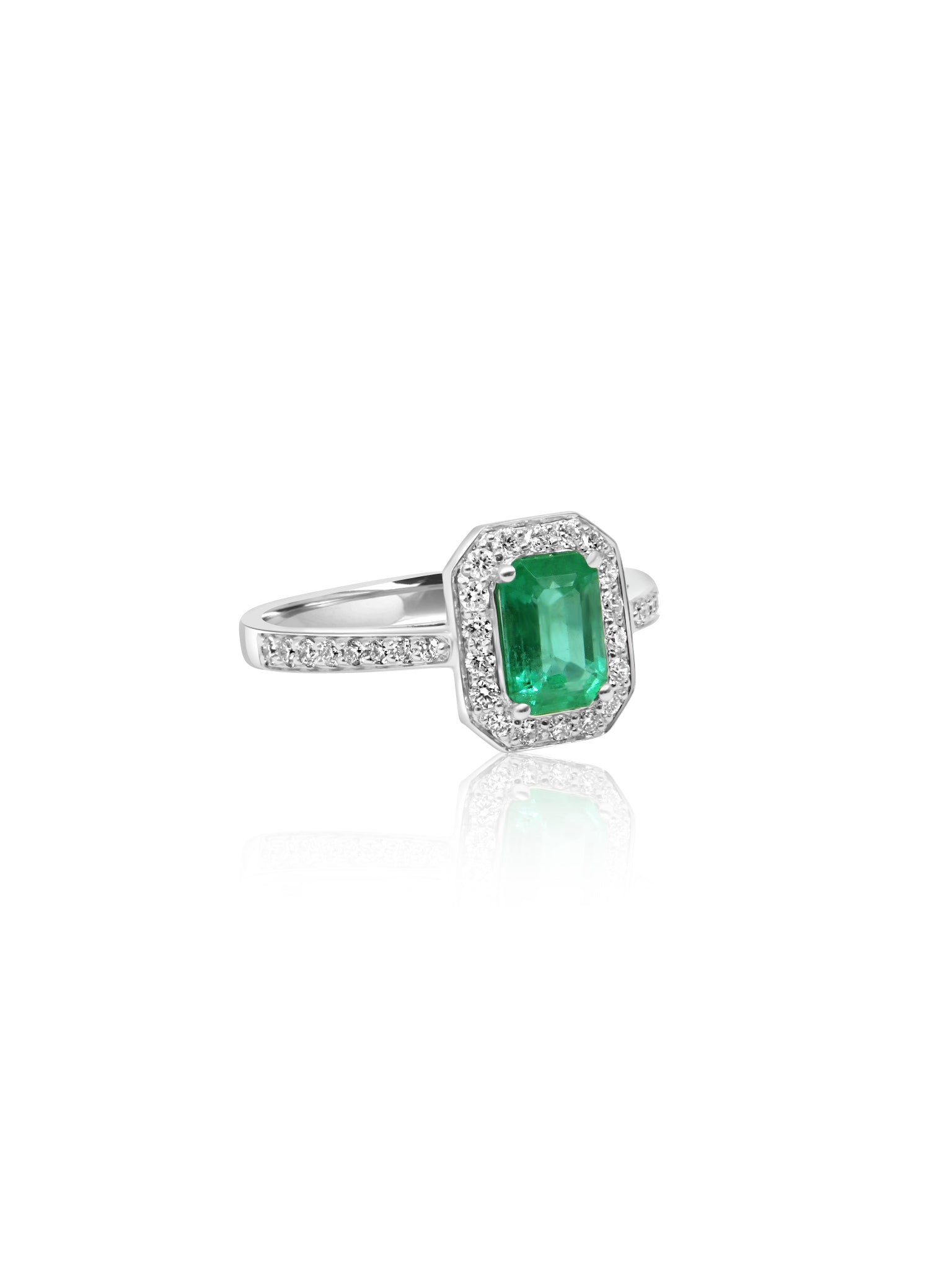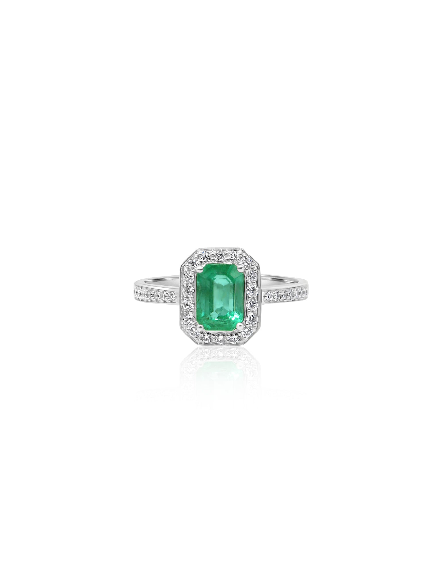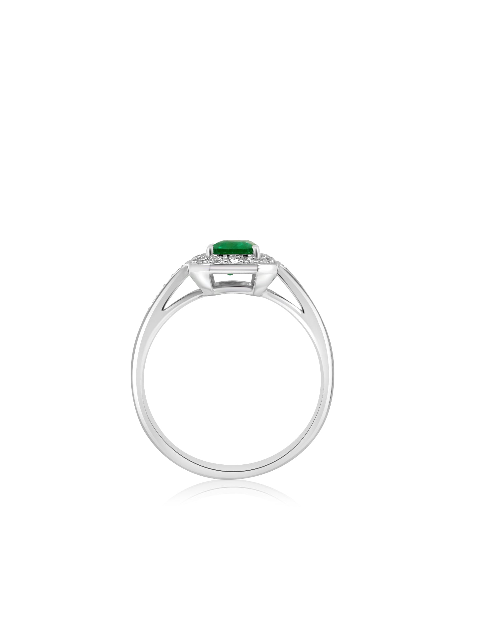 Mozafarian emerald ring adorned with sparkling diamonds along the sides and crafted in 18 karat white gold.