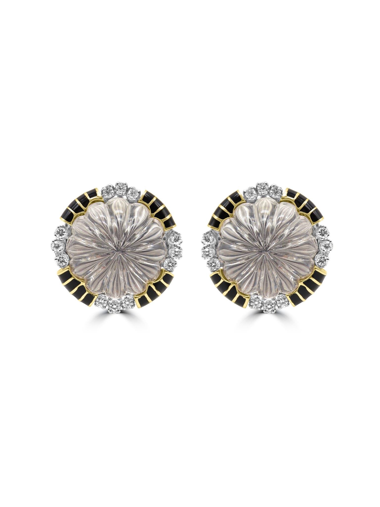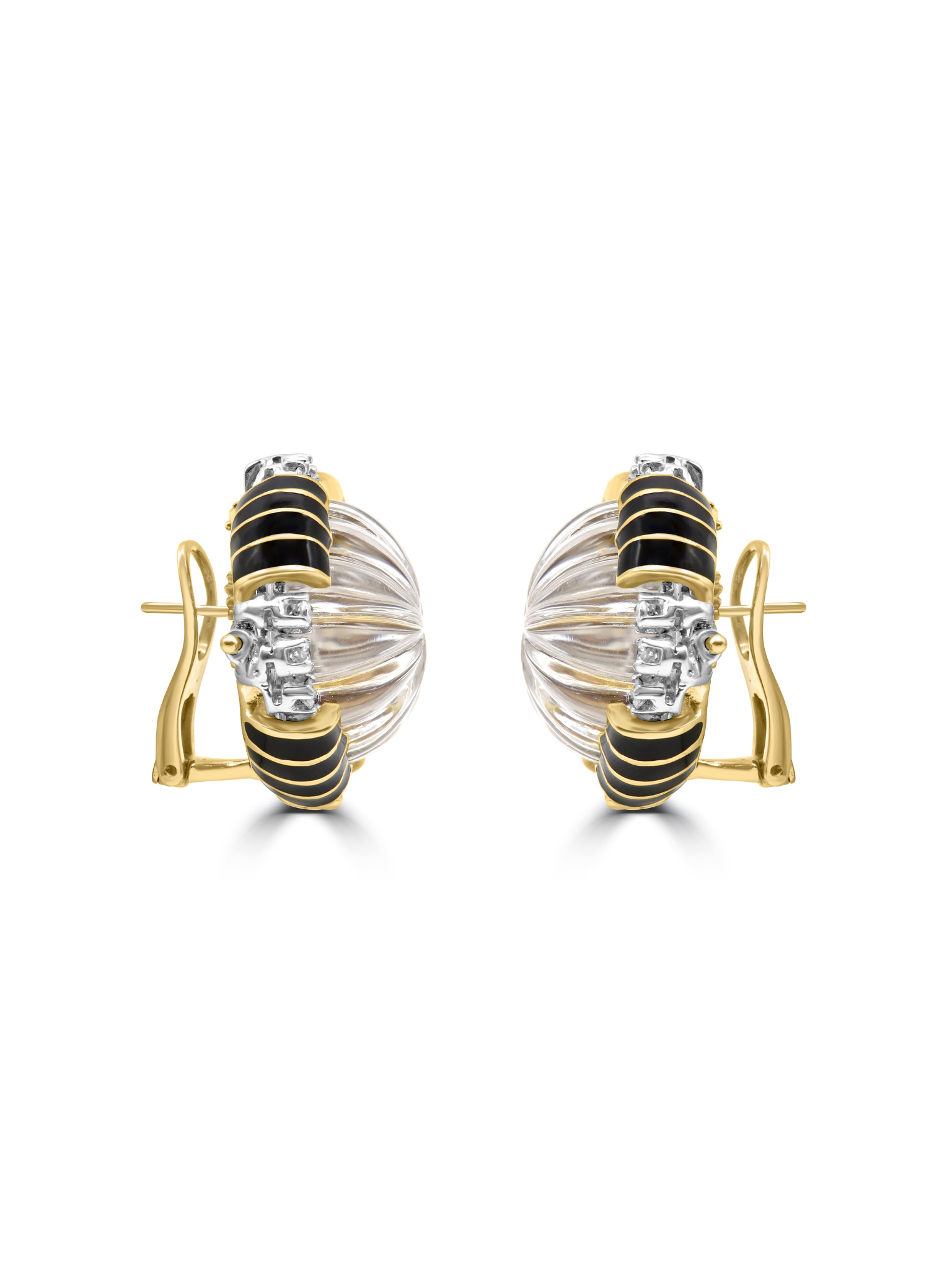 Mozafarian 18-karat gold distinctive earrings showcasing a luminous glass centrepiece framed by brilliant diamonds. The sophisticated interplay of black enamel detailing elevates the design, creating a refined aesthetic that commands attention. A masterfully executed statement piece.
