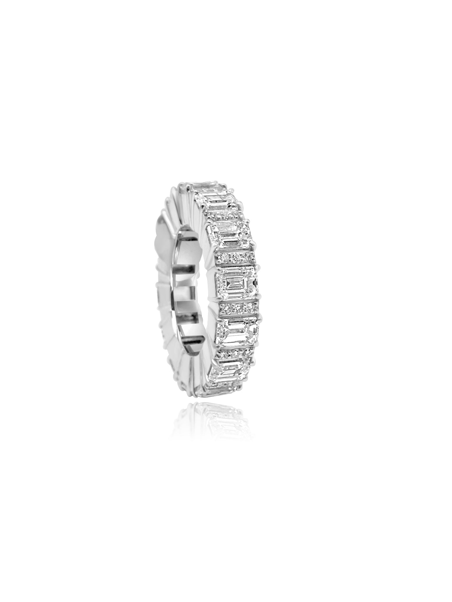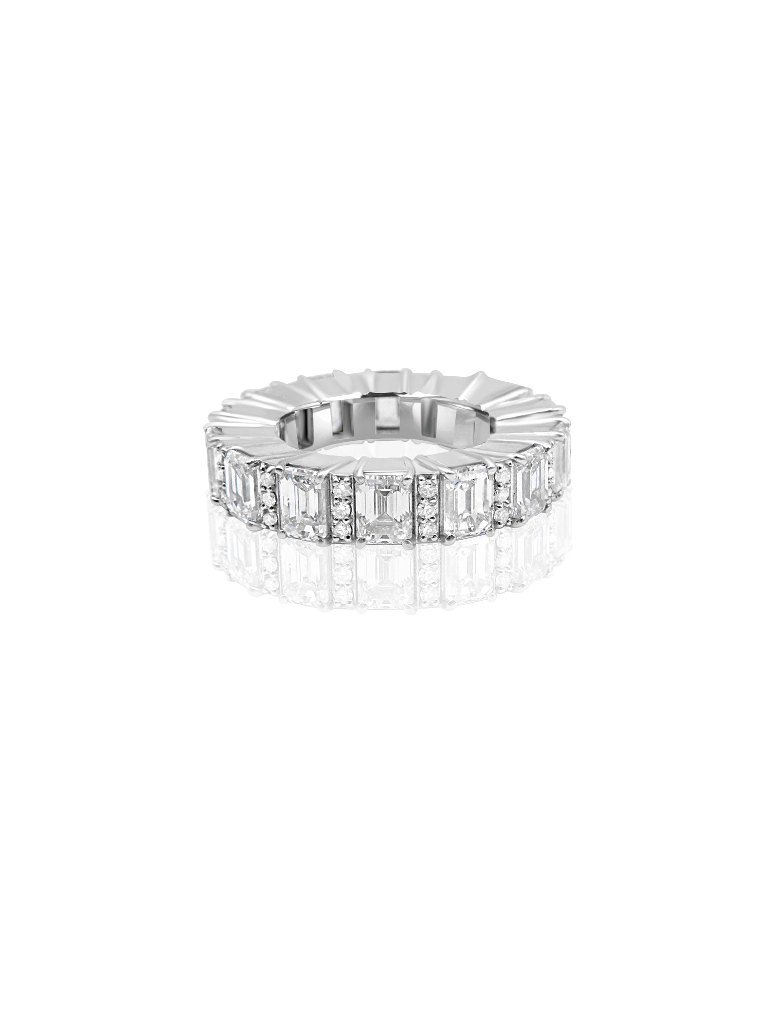 Sophisticated eternity ring made from 18-karat white gold. It features alternating emerald-cut and round-cut diamonds, arranged in a continuous band that wraps around the entire ring. The emerald-cut diamonds provide a sleek, elongated sparkle, while the round-cut diamonds add a touch of brilliance and contrast. The combination of these two diamond shapes, set against the lustrous white gold, creates a timeless and elegant piece that symbolises everlasting love and commitment.