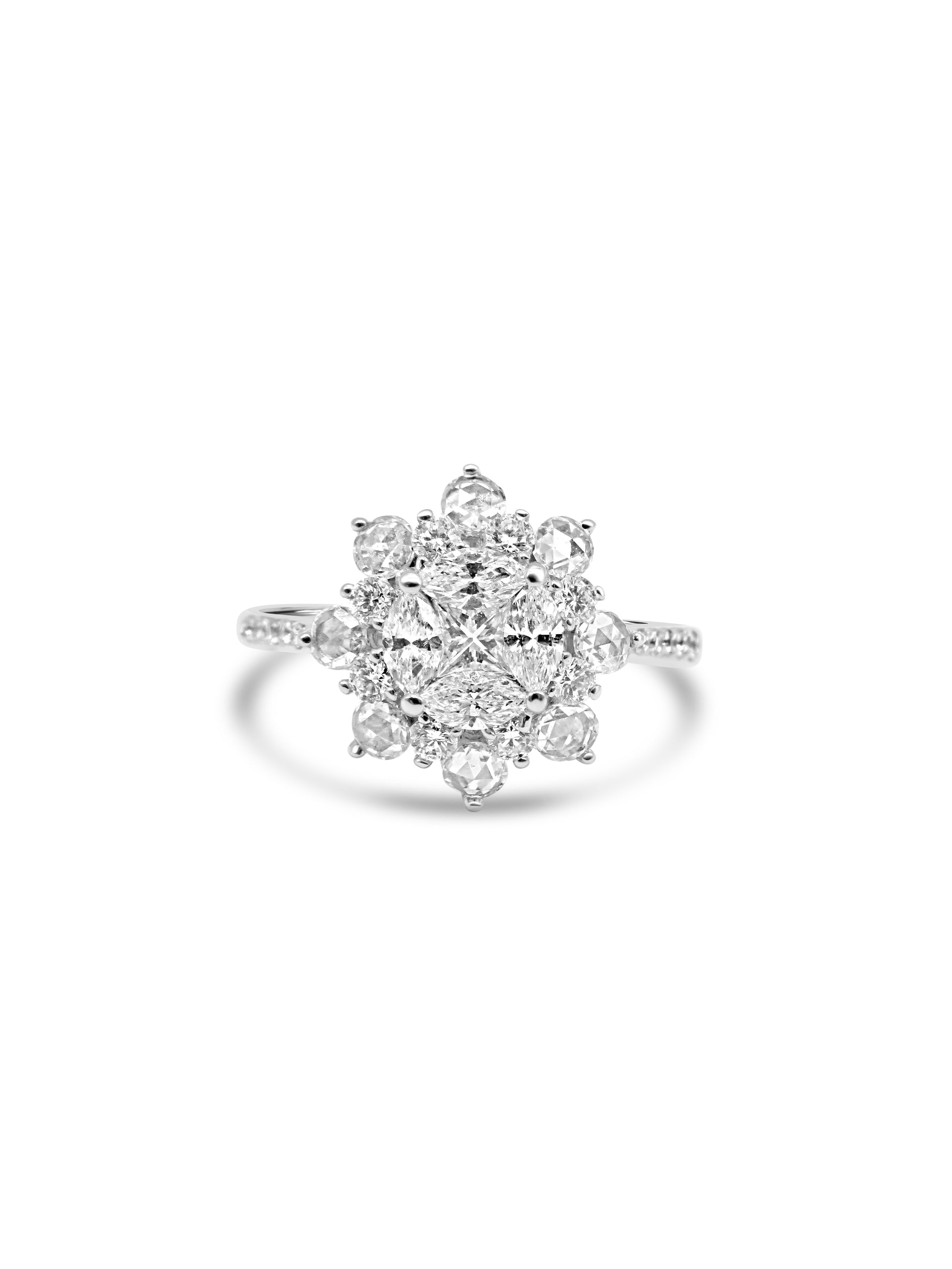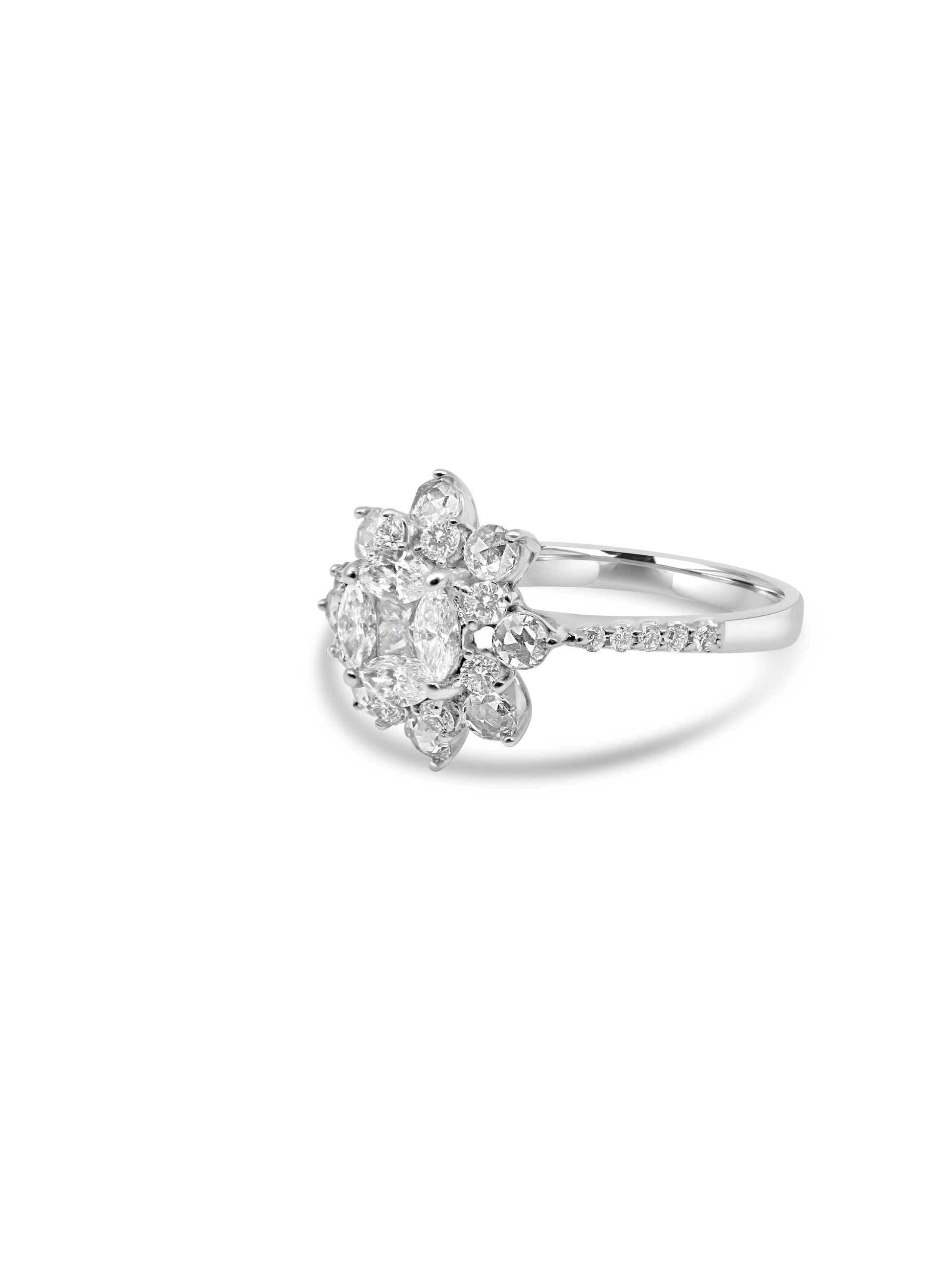 Mozafarian luminous 18 karat white gold ring featuring a dazzling cluster of marquise and round brilliant-cut diamonds arranged in an elegant, floral-inspired design. Diamond-set shoulders add extra sparkle, creating a timeless yet distinctive piece that catches the light beautifully from every angle.