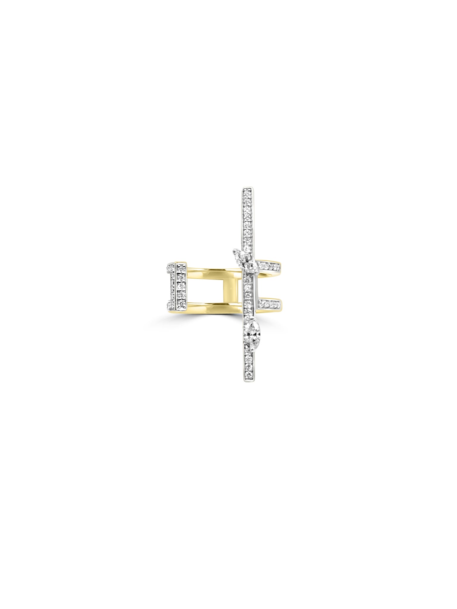 18 karat gold and diamond ring with a minimalist, modern design, featuring geometric shapes and two main diamonds as the focal point. Sparkling diamonds throughout complete this stunning piece