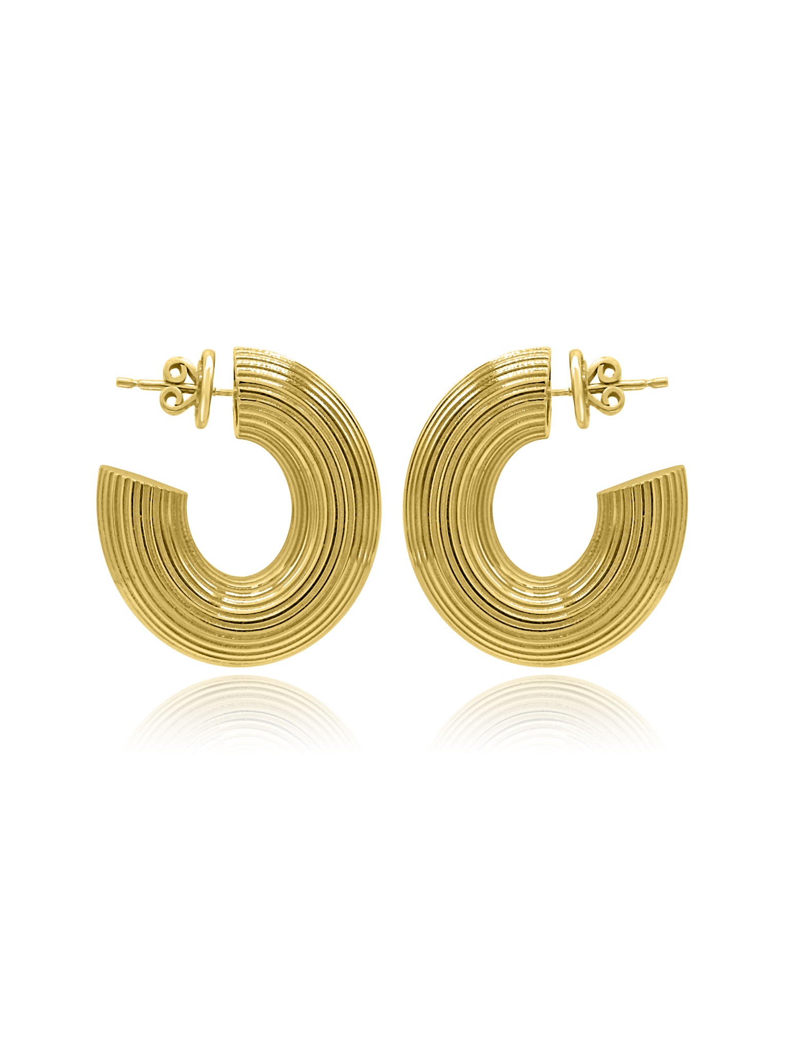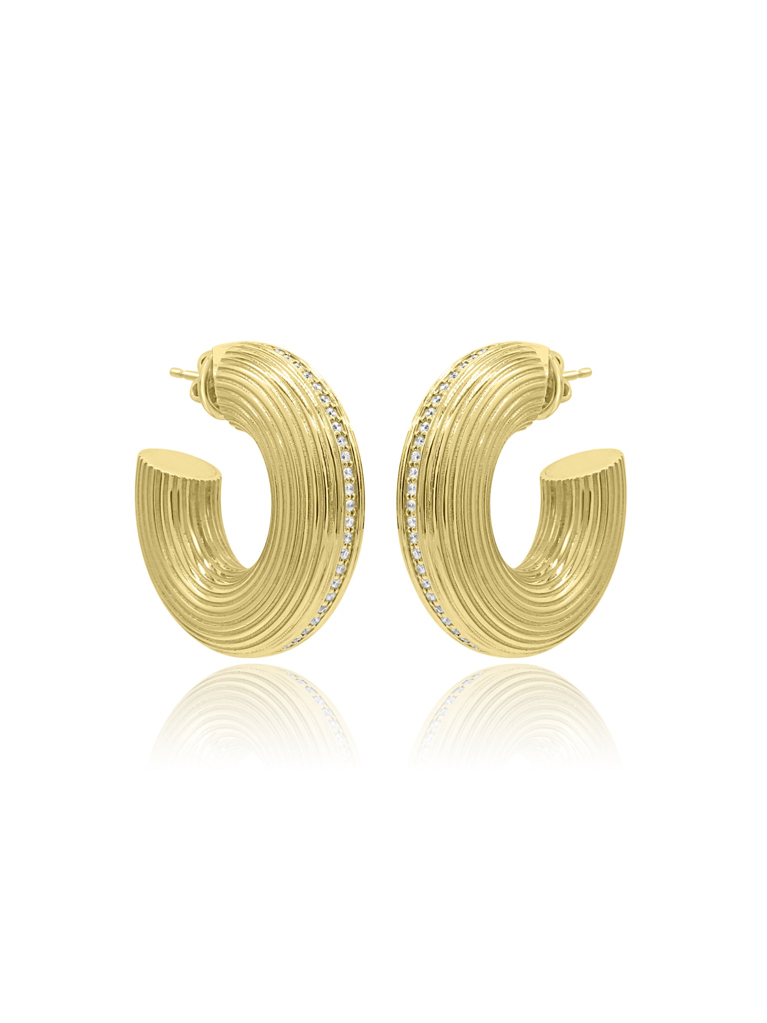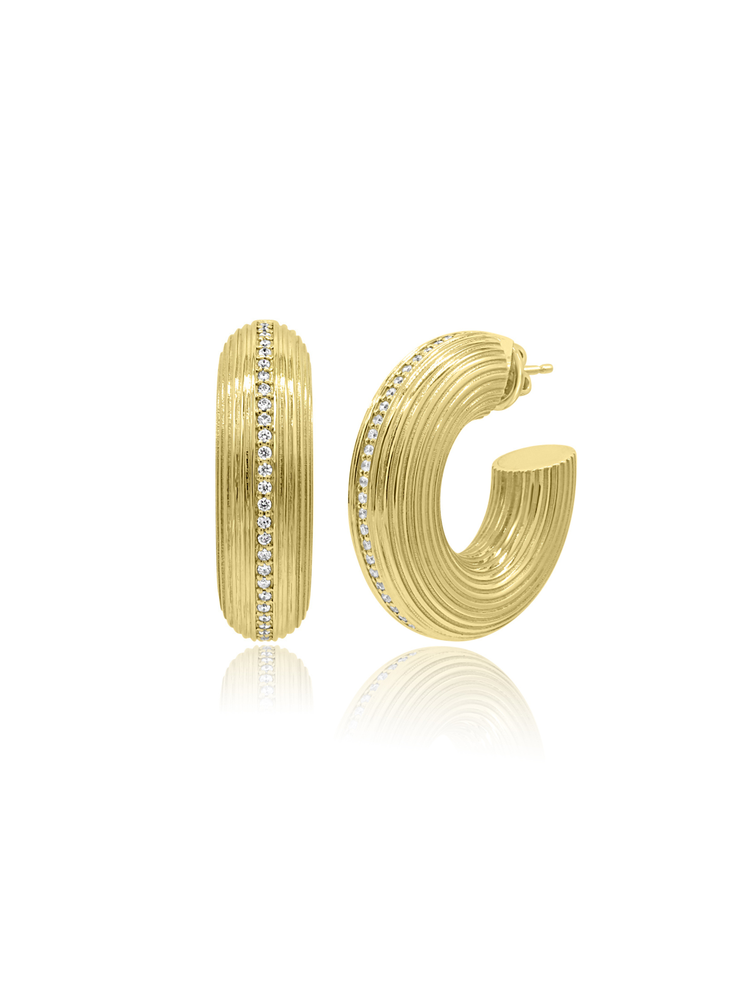 Mozafarian's stylish 18 karat gold chunky hoop earrings adorned with a row of shimmering diamonds.
