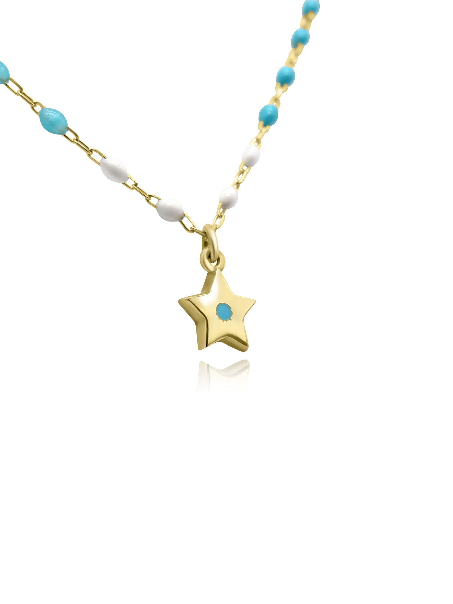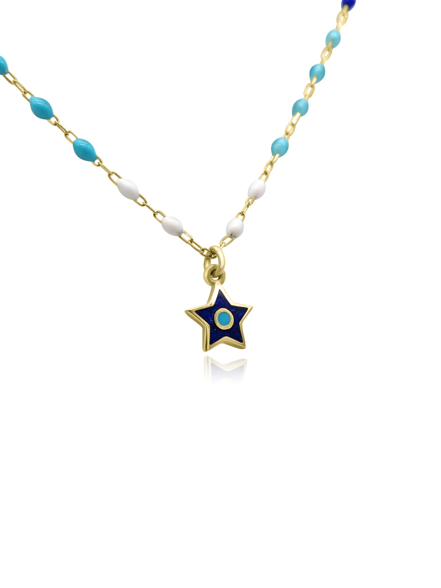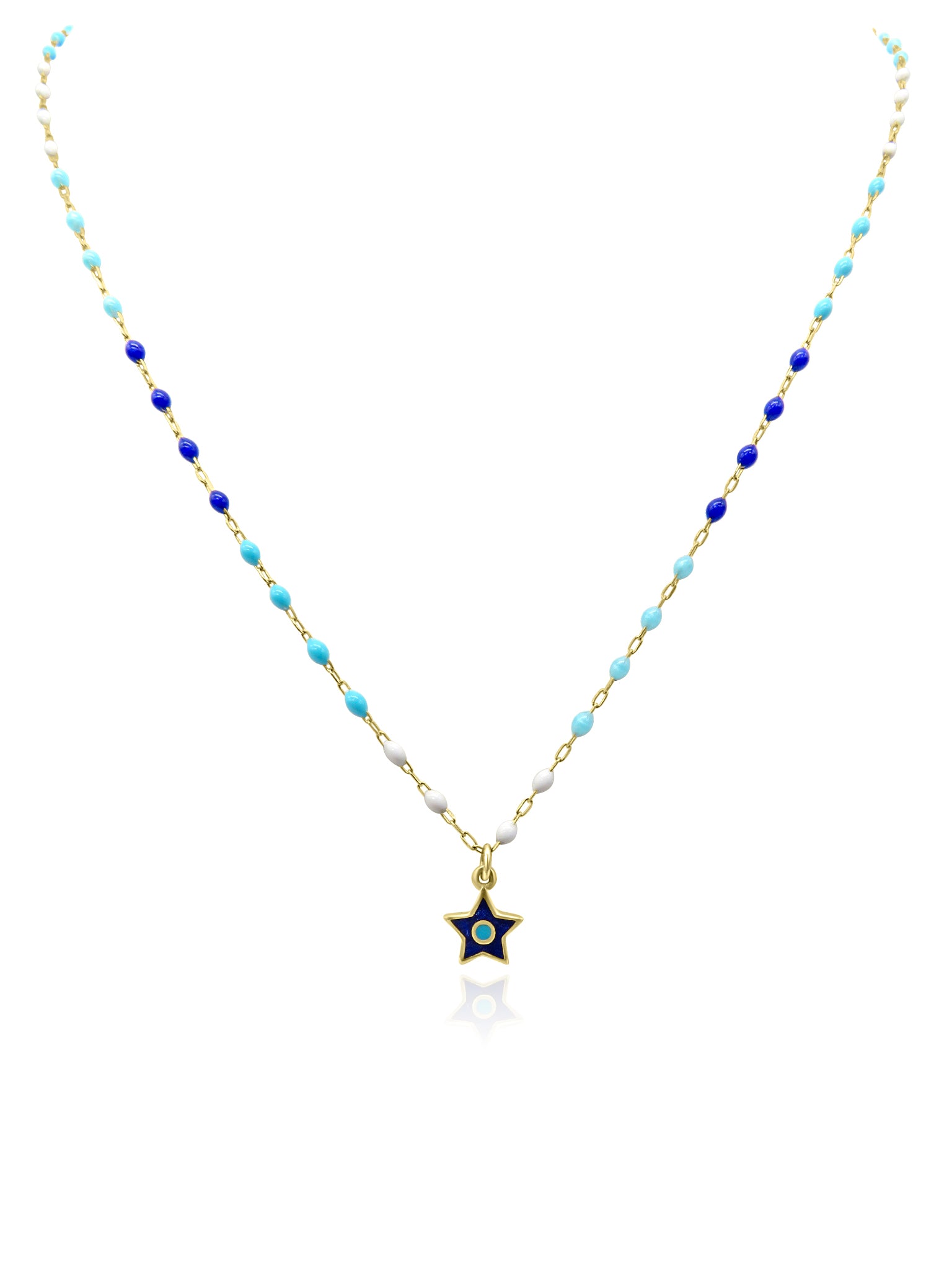 Mozafarian's beautiful 18 karat gold beaded necklace featuring various shades of blue. The focal point is a star pendant with two sides - a navy glittery side and a gold side. This is a one-of-a-kind statement piece that is sure to stand out.