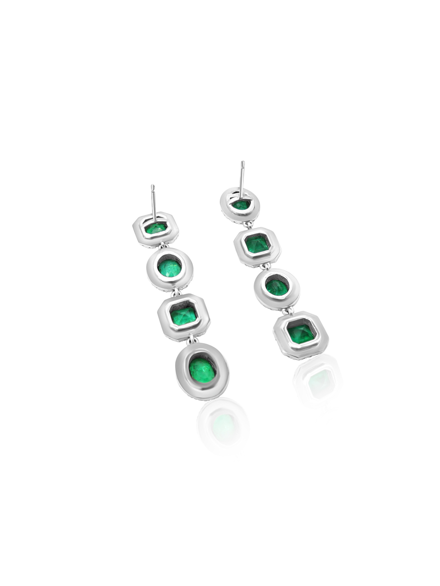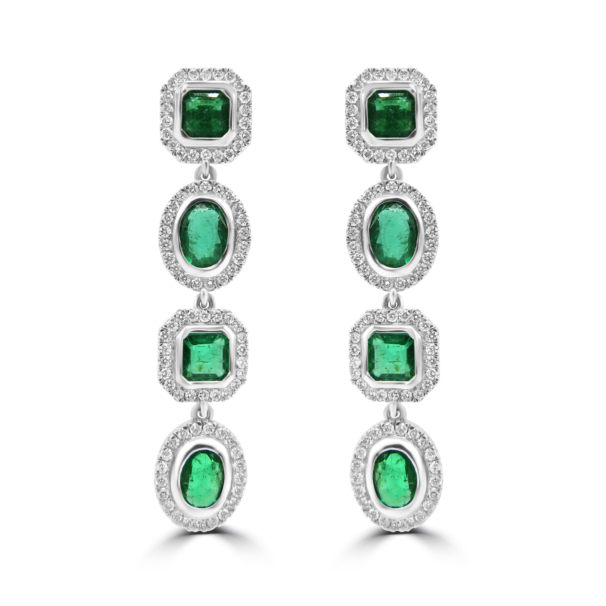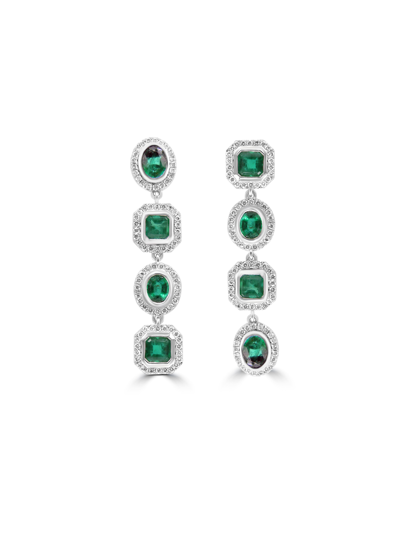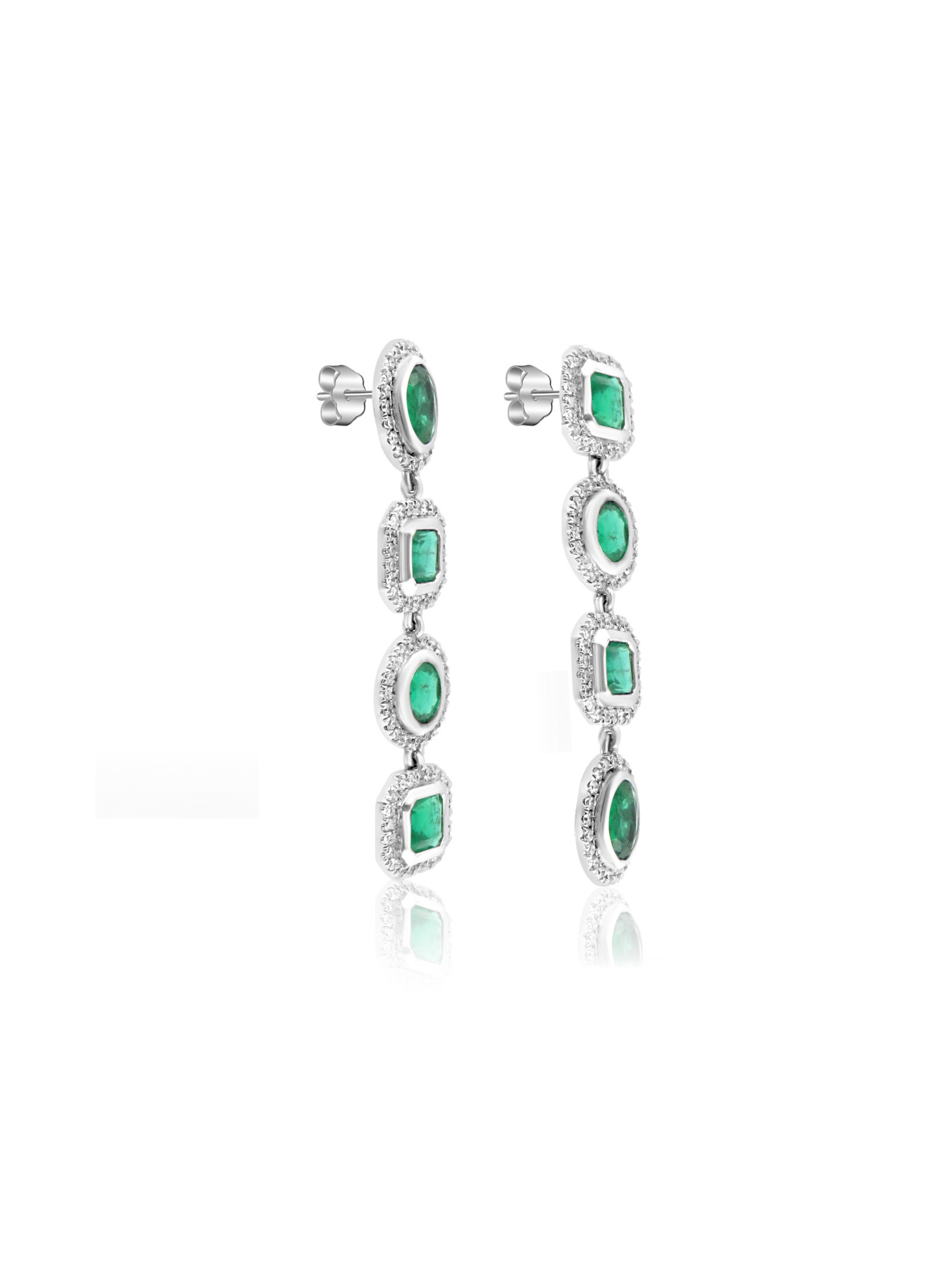 These 18 karat white gold drop earrings feature a graceful arrangement of emeralds and diamonds in a cascading design. Each emerald is framed by a delicate halo of diamonds, adding a subtle sparkle that complements the vibrant green tones. A refined accessory, these earrings add an elegant touch to any outfit.