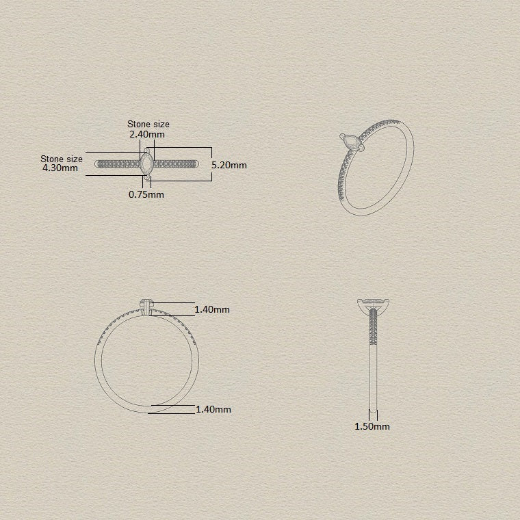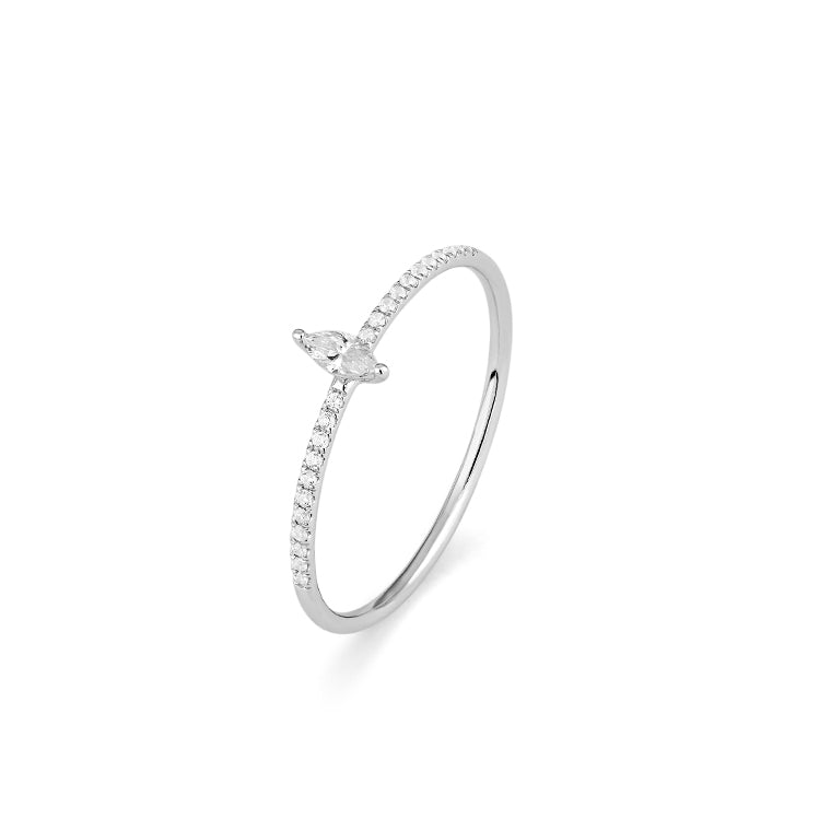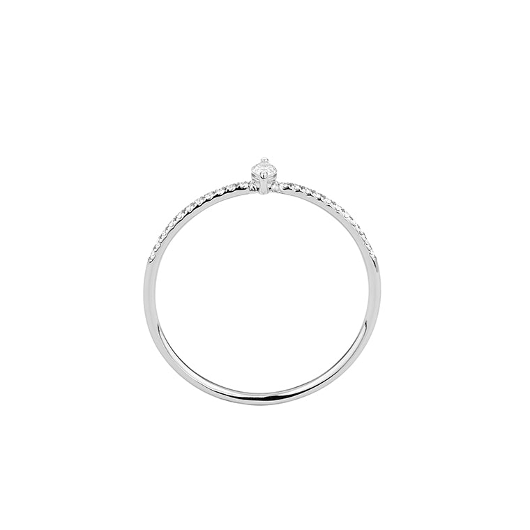 Elegant and modern, this ring is crafted in 18k white gold and features a marquise-cut diamond set at the center of a fine diamond-set band. The elongated silhouette of the marquise adds a distinctive touch, while the surrounding diamonds bring subtle brilliance to the minimal design.