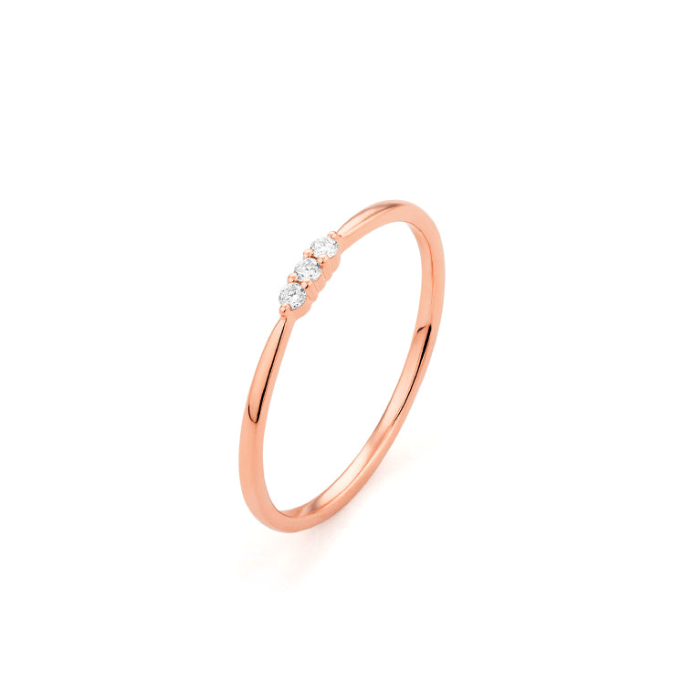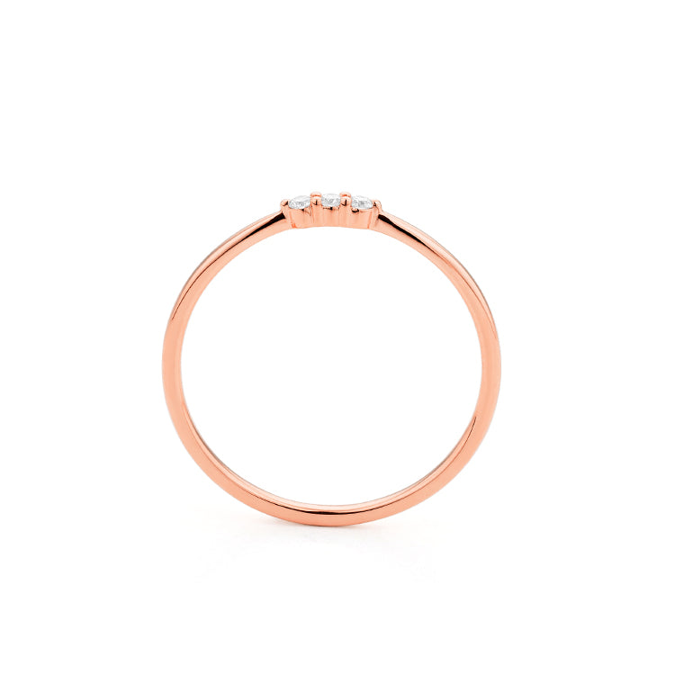 Delicate and minimal, this ring is crafted in 18k rose gold and features three brilliant-cut diamonds set in a fine, polished band. Subtle yet full of charm, its simplicity makes it perfect for stacking, gifting, or wearing as a quiet everyday signature.