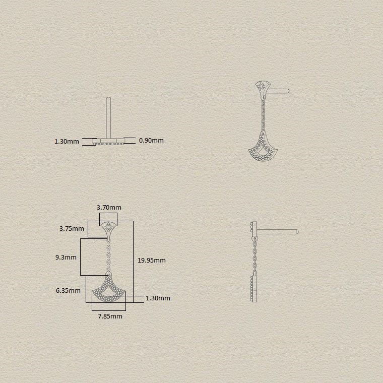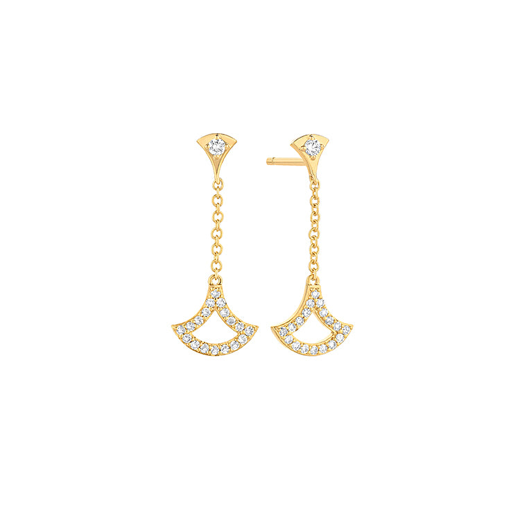 Light and full of movement, these 18k yellow gold earrings reinterpret the fan motif with a delicate drop silhouette. A fine chain connects the top to the pavé-set fan, allowing subtle motion that catches the light with every turn. Understated yet expressive, they add charm and grace to any look.