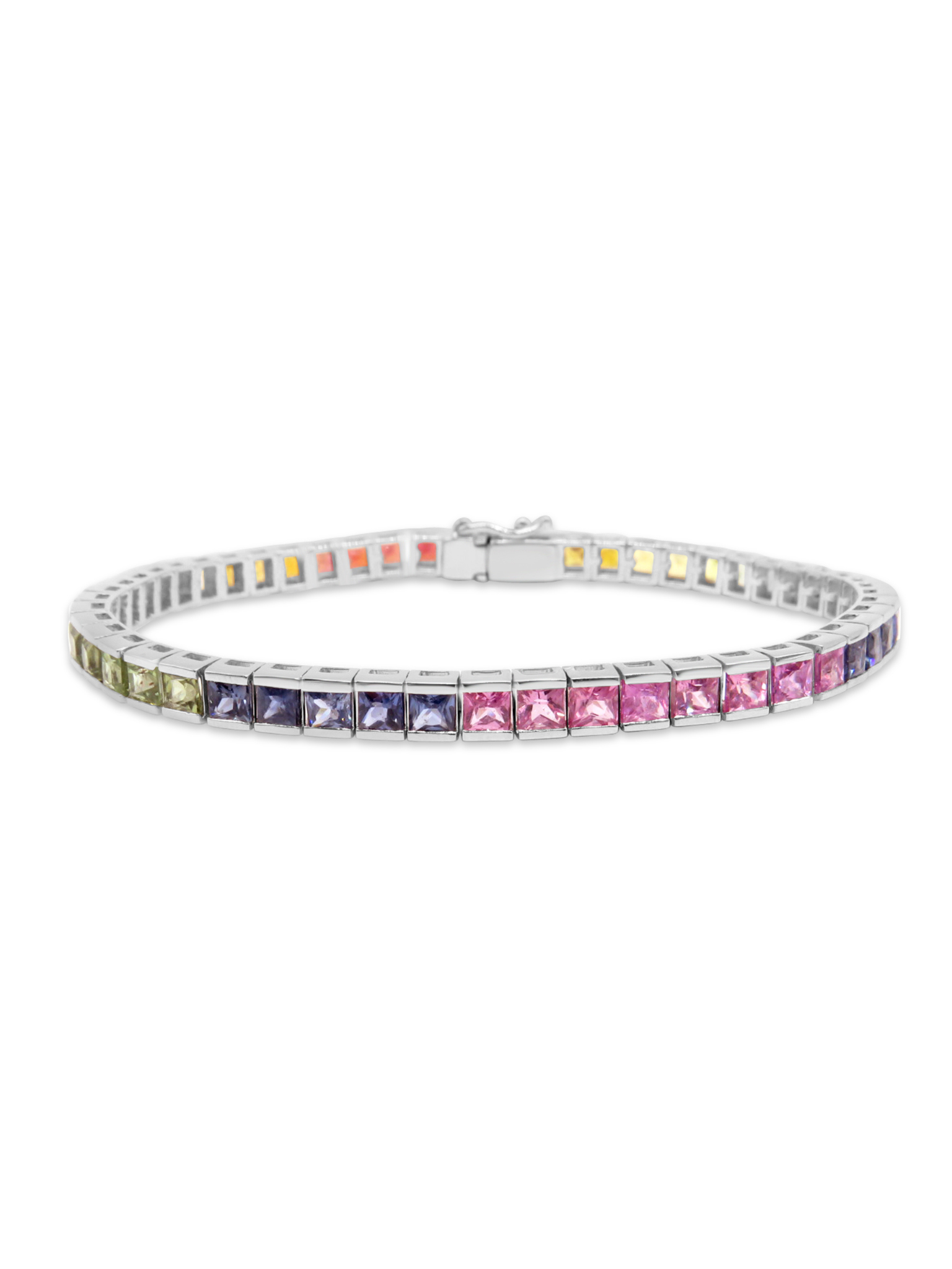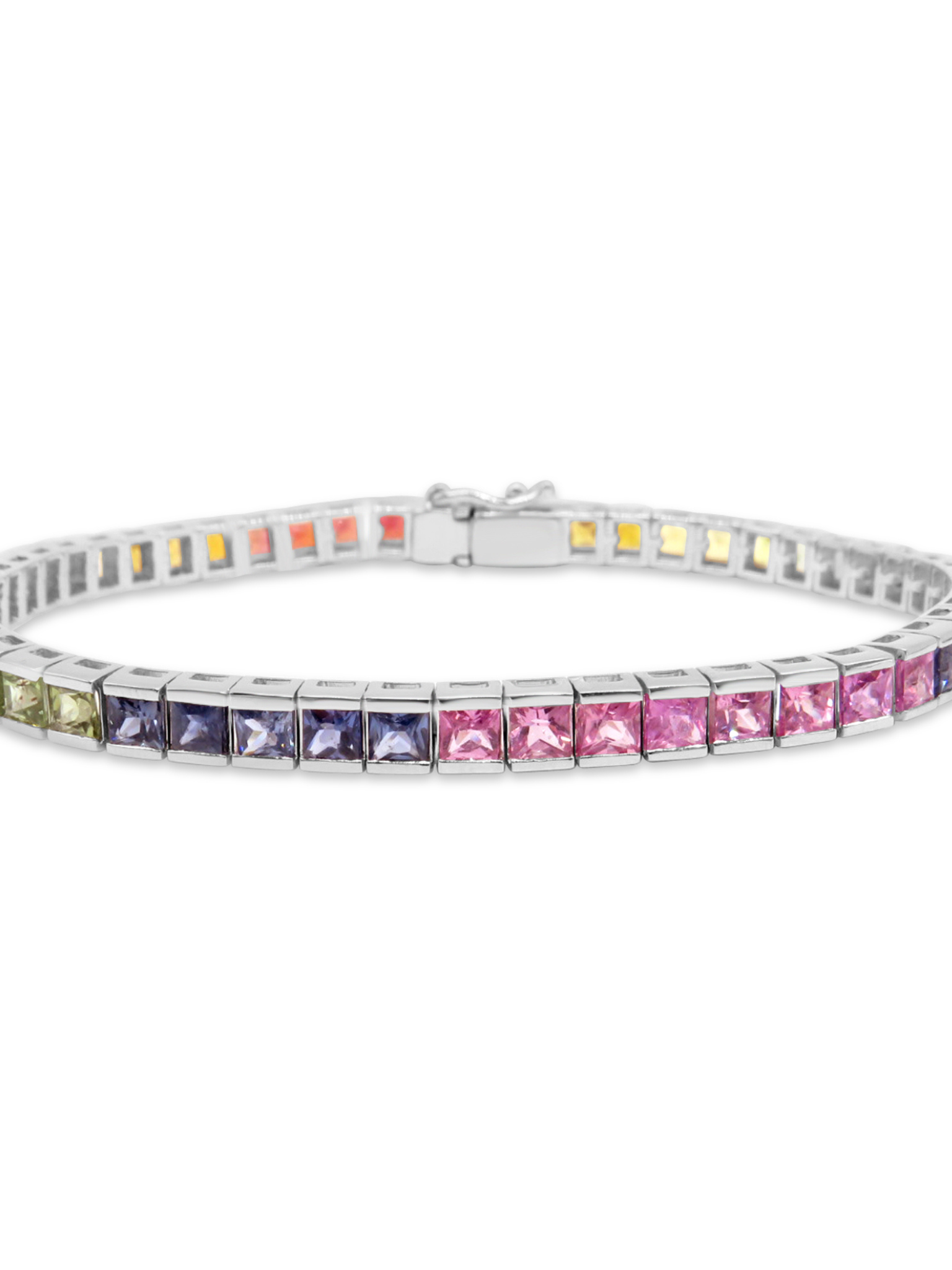 Mozafarian 18 karat white gold multi-coloured tennis bracelet adorned in natural sapphires.