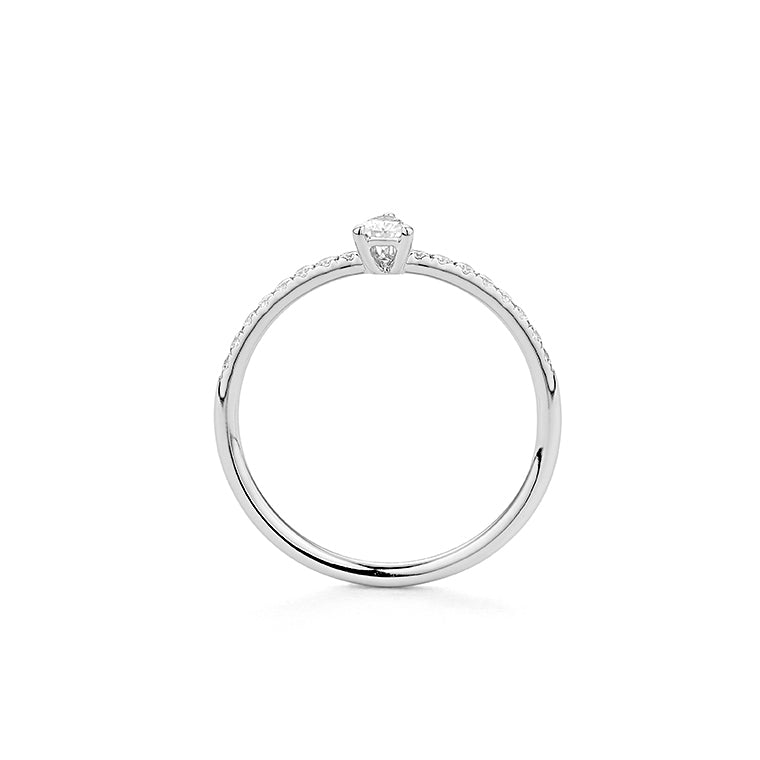 This elegant ring is crafted in 18k white gold and features a pear-cut diamond at its center, set on a fine diamond-set band for added brilliance. The teardrop silhouette adds a touch of softness and individuality, while the clean lines keep the design timeless and modern.