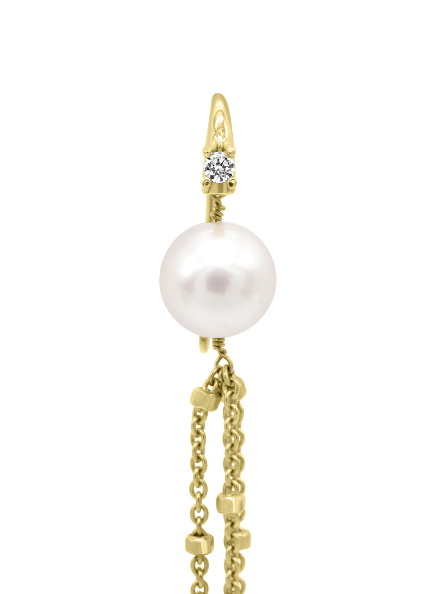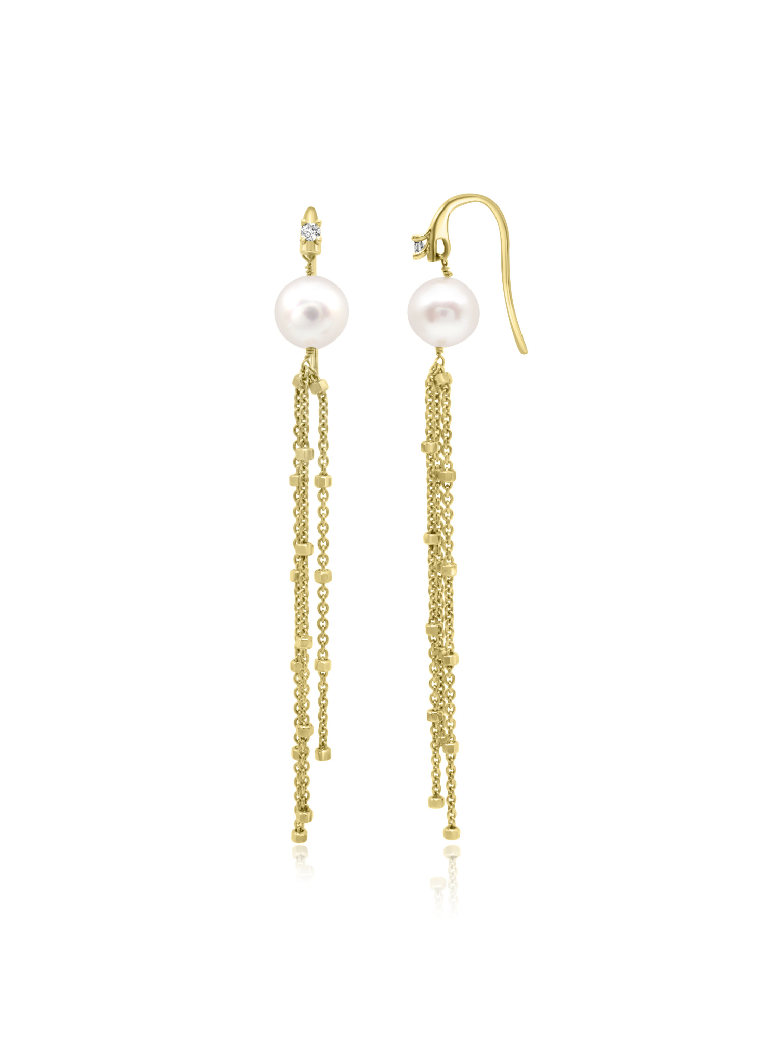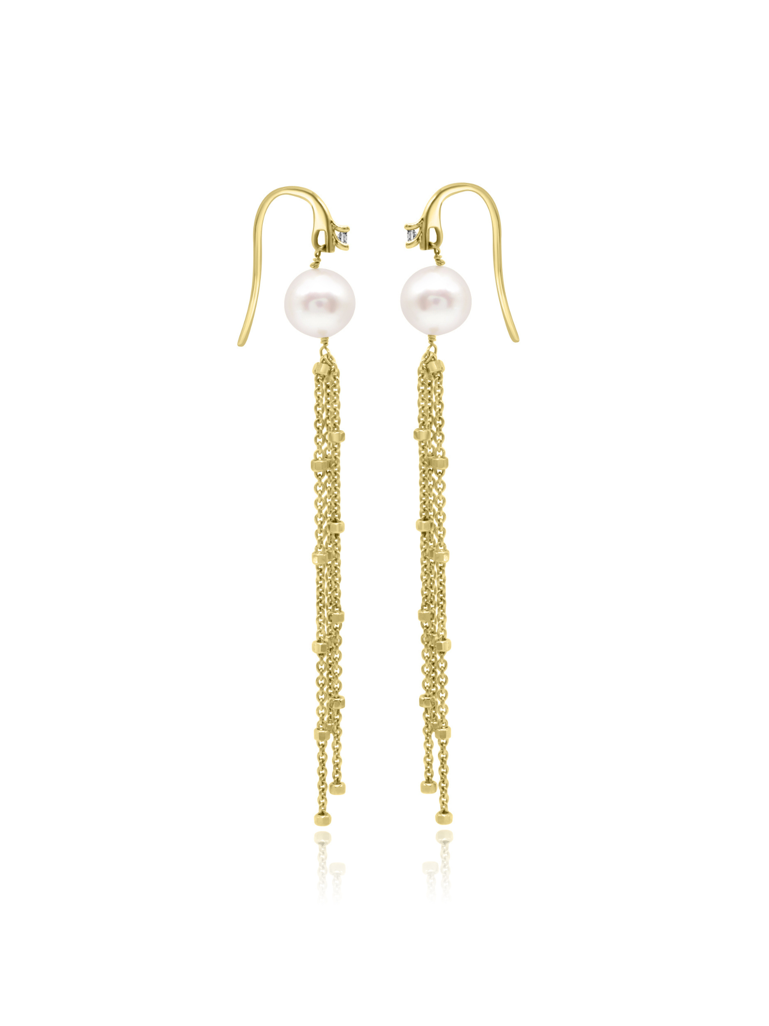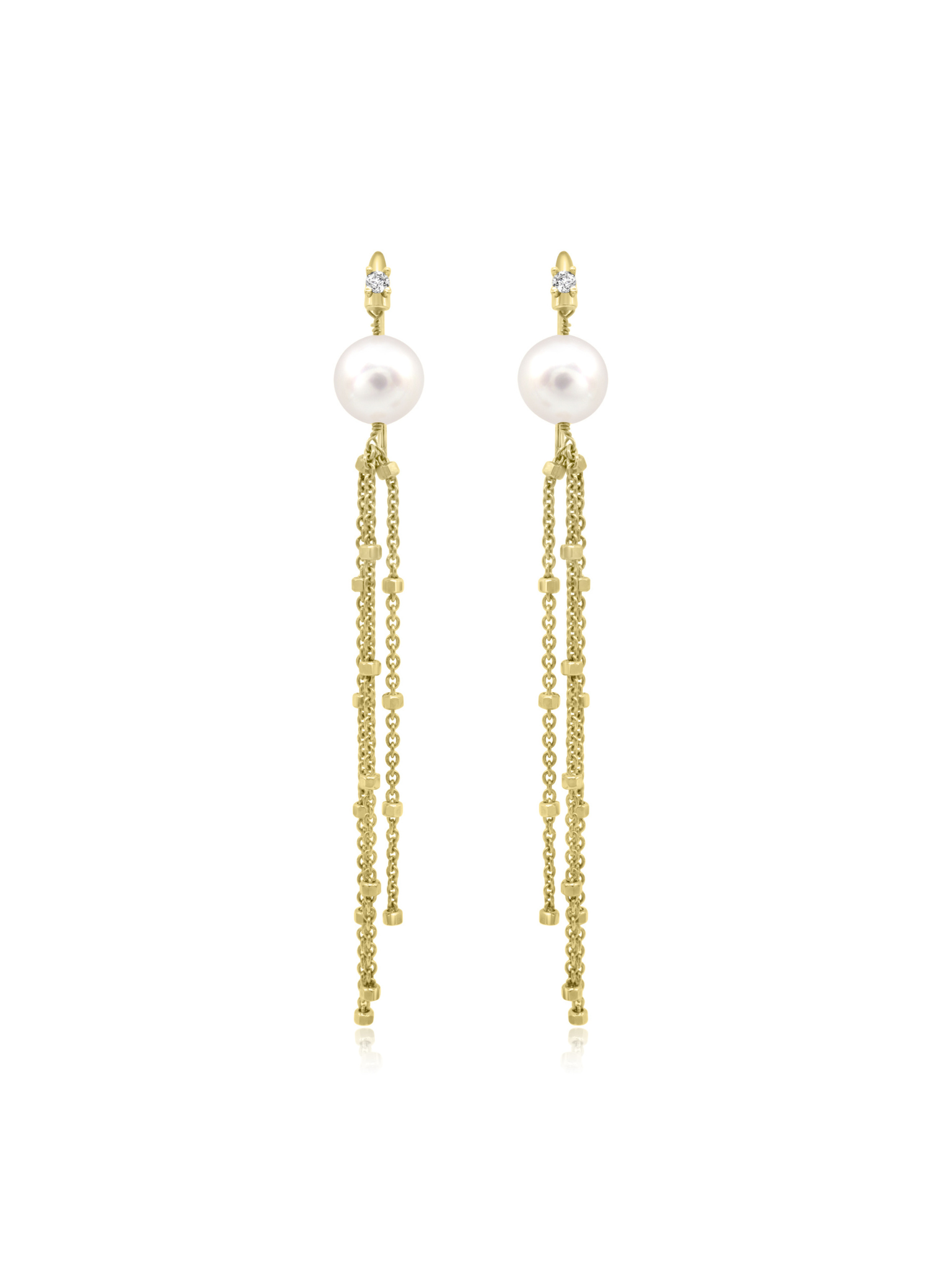Luxurious 18 karat gold earrings with diamonds and pearls. The design features a single pearl at the top with delicate gold chains and diamond accents. Elegant and versatile for formal events and special occasions.