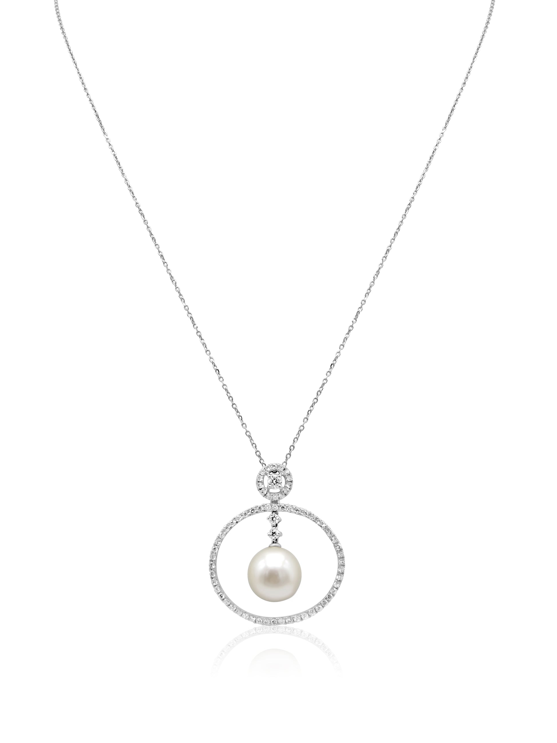 Constructed with 18 karat white gold, the Mozafarian necklace is adorned with a delicate pearl pendant encircled by sparkling diamonds, making it the perfect statement piece.