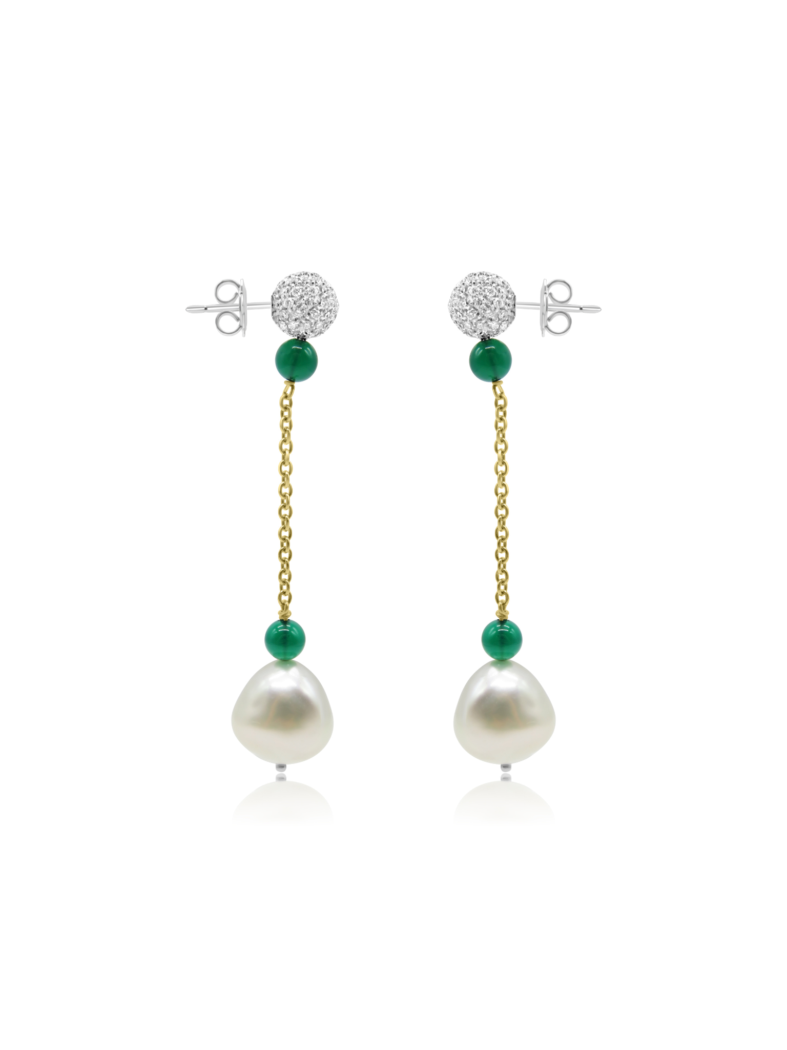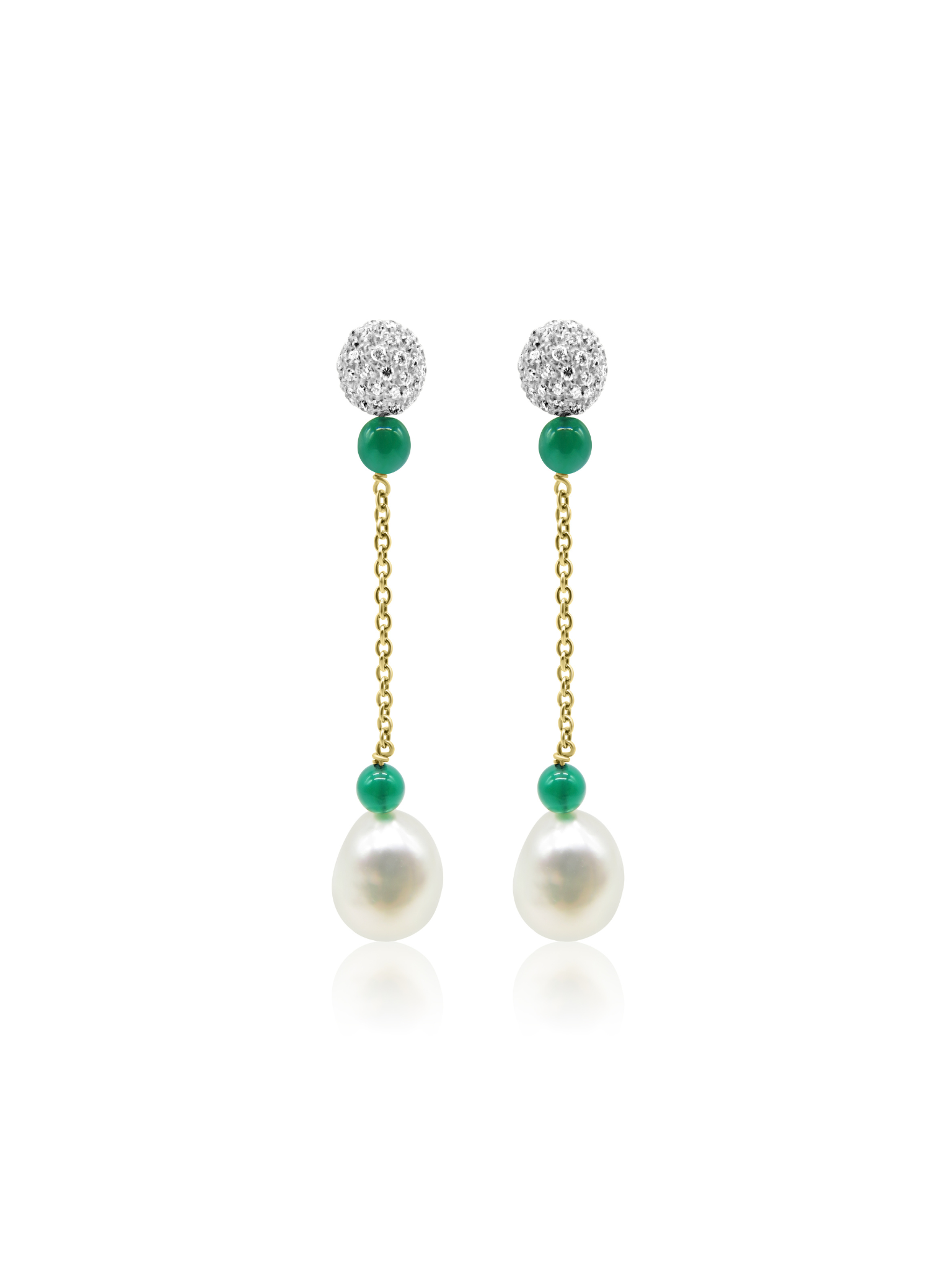 Mozafarian pearl drop earrings crafted in 18 karat gold feature diamonds embellishing the upper section, complemented by green beads that introduce a vibrant contrast.