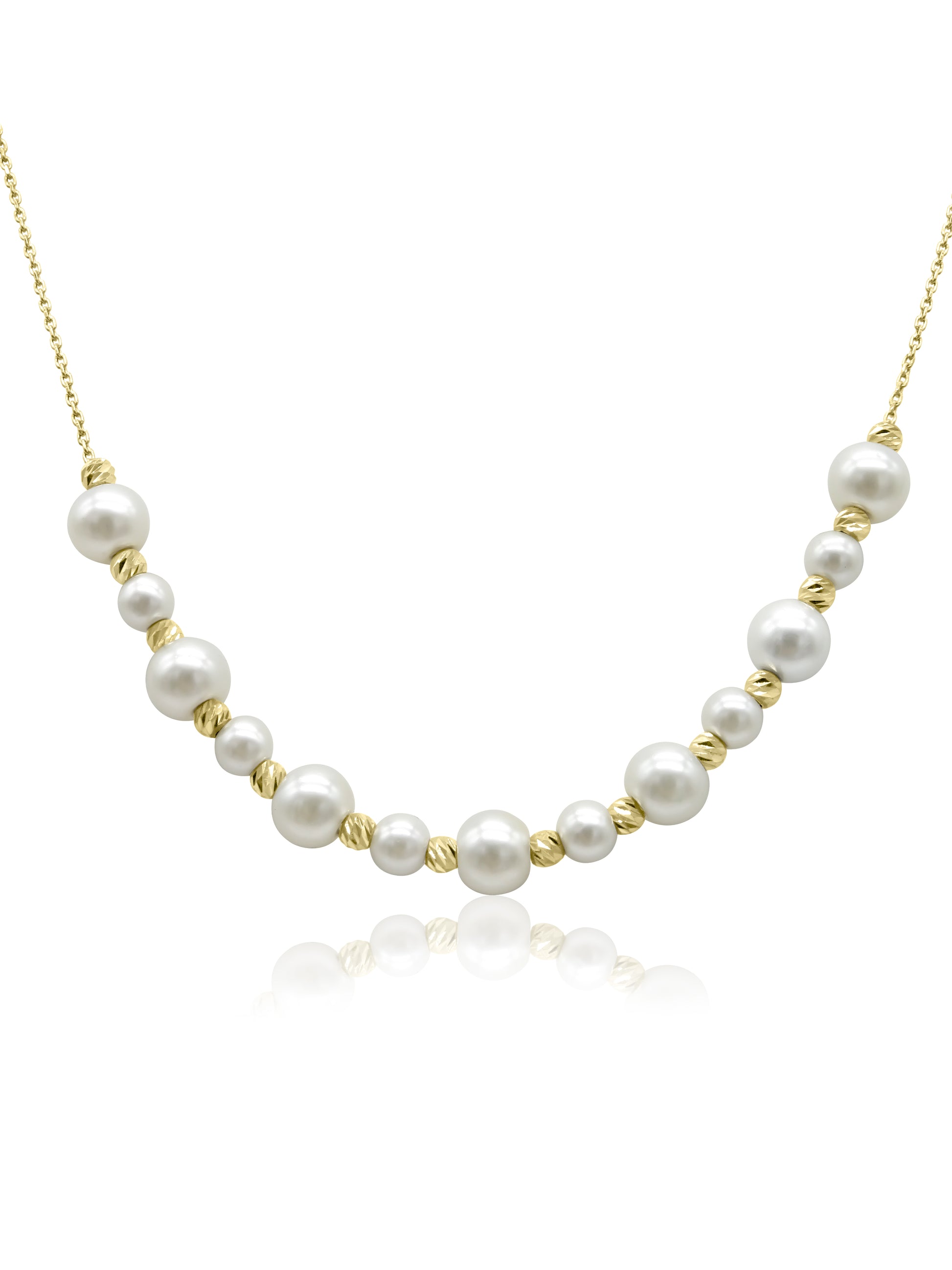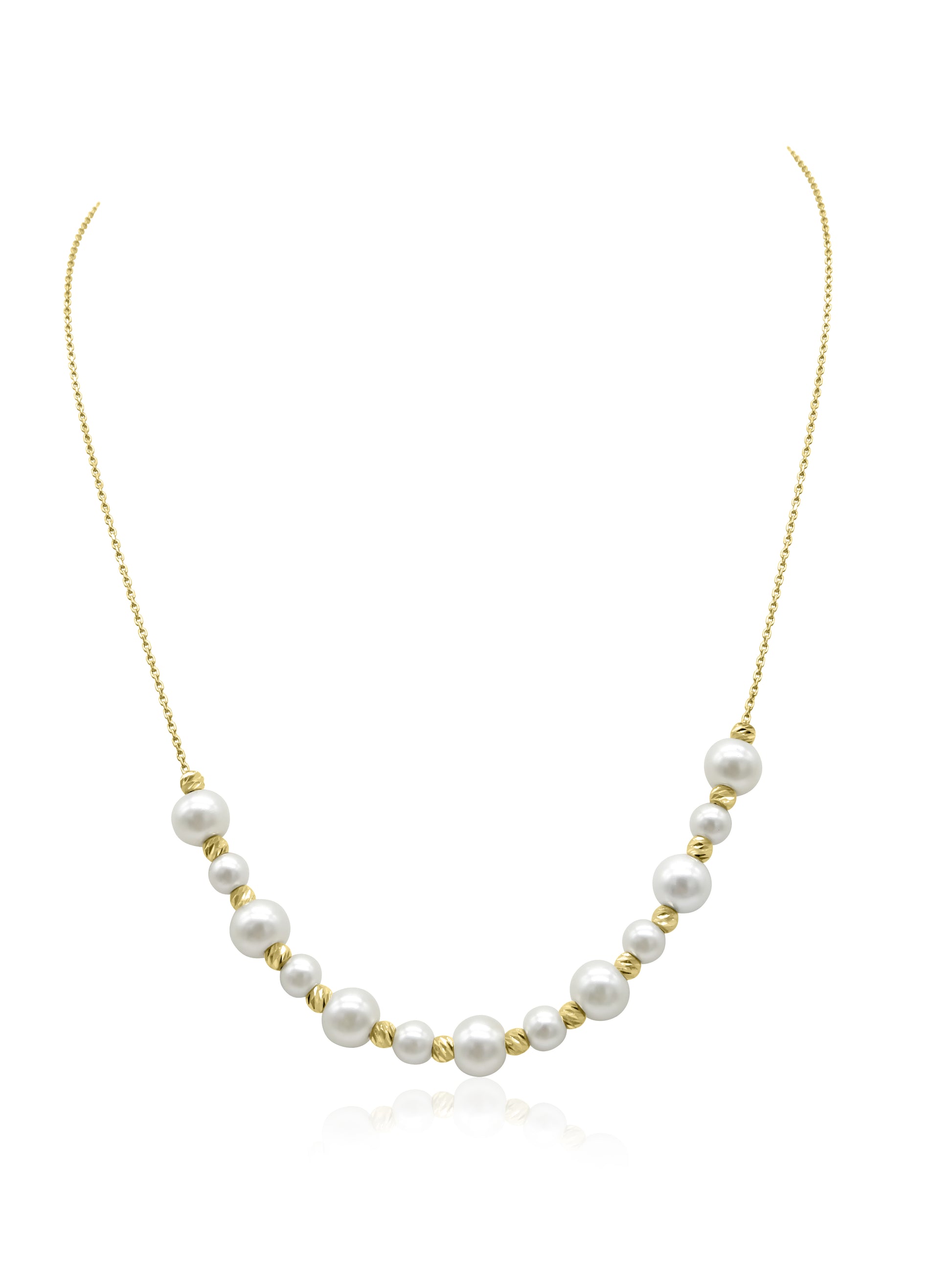 Mozafarian 18 karat gold necklace adorned with pearls along the front.
