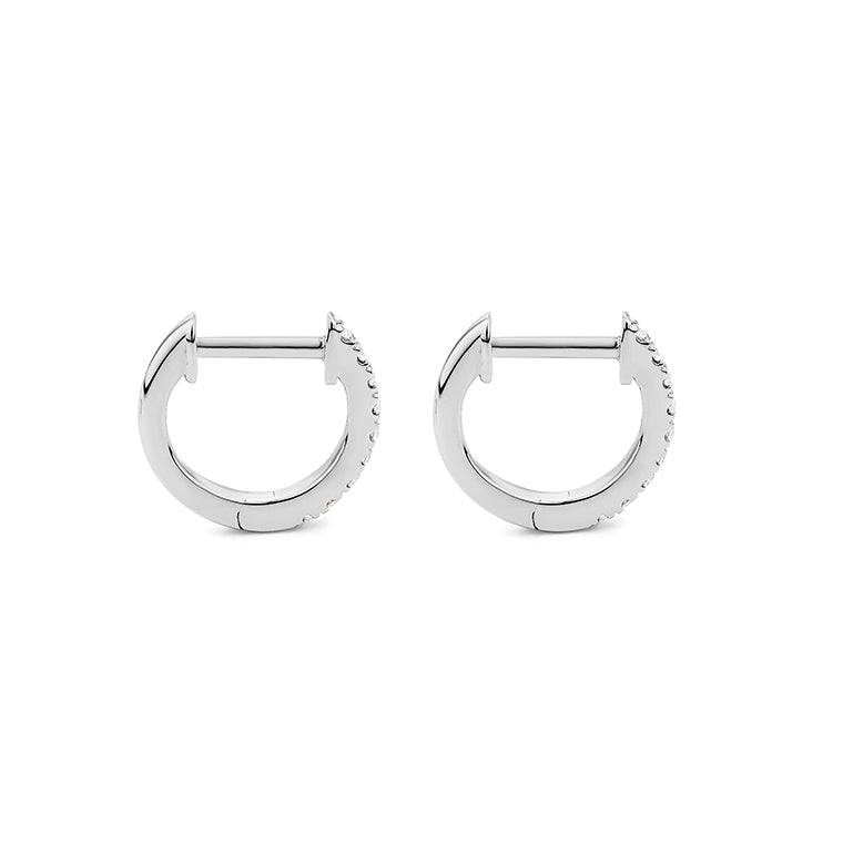 These timeless mini hoop earrings are crafted in 18k white gold and set with a line of brilliant-cut diamonds along the front edge. With a sleek silhouette and just the right amount of sparkle, they’re an effortlessly elegant everyday essential.
