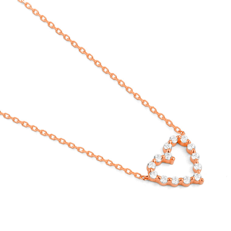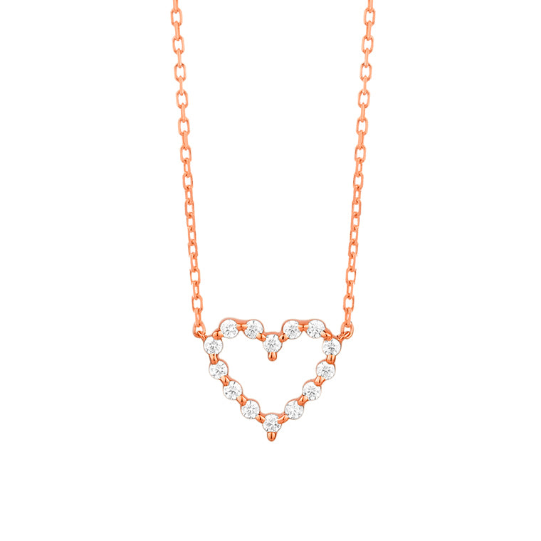 Delicate and expressive, this pendant is crafted in 18k rose gold and features a sculpted open heart traced with brilliant-cut diamonds. The soft warmth of the gold enhances the gentle sparkle of each stone, creating a modern yet timeless expression of love.