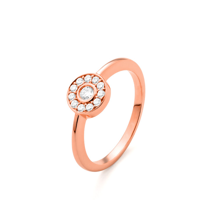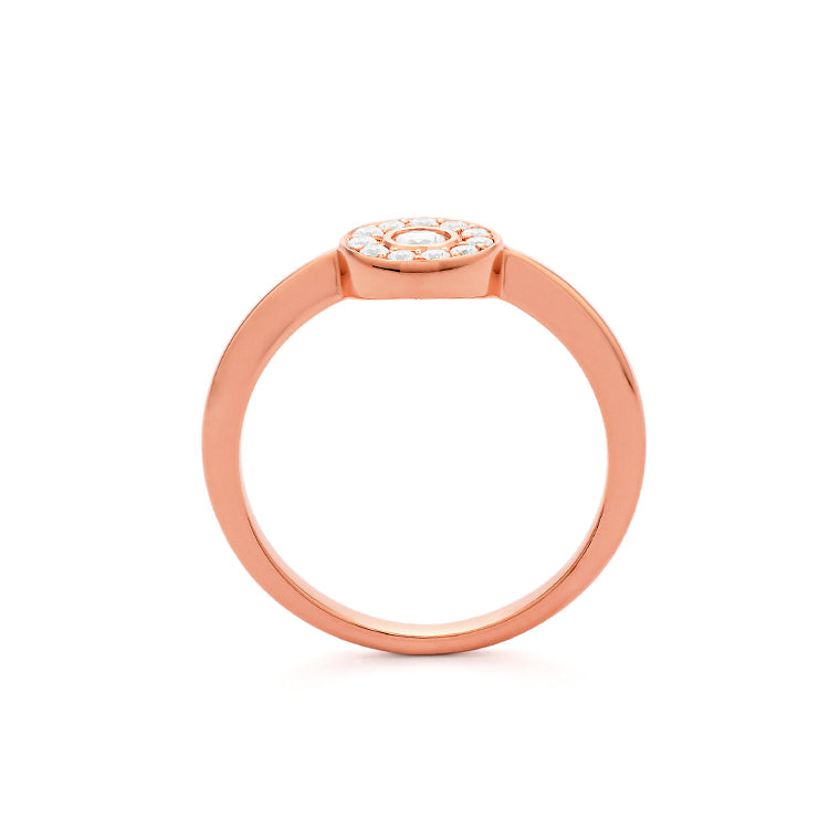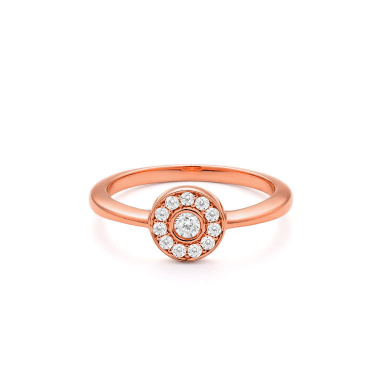 Crafted in 18k rose gold, this ring features a brilliant-cut diamond at its center, encircled by a radiant halo of smaller diamonds. The rounded bezel and warm rose gold band lend softness and balance, creating a piece that’s both refined and full of character.