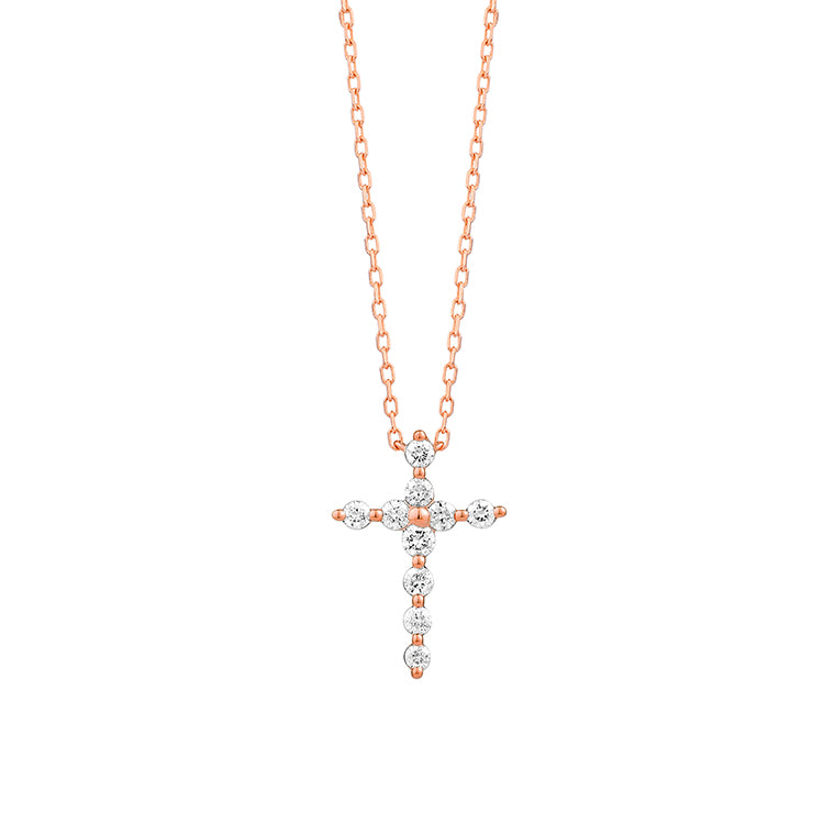 This delicate cross pendant is crafted in 18k rose gold and adorned with brilliant-cut diamonds that lend a soft, graceful sparkle. The warmth of the rose gold enhances the timeless silhouette, creating a piece that is both meaningful and refined.