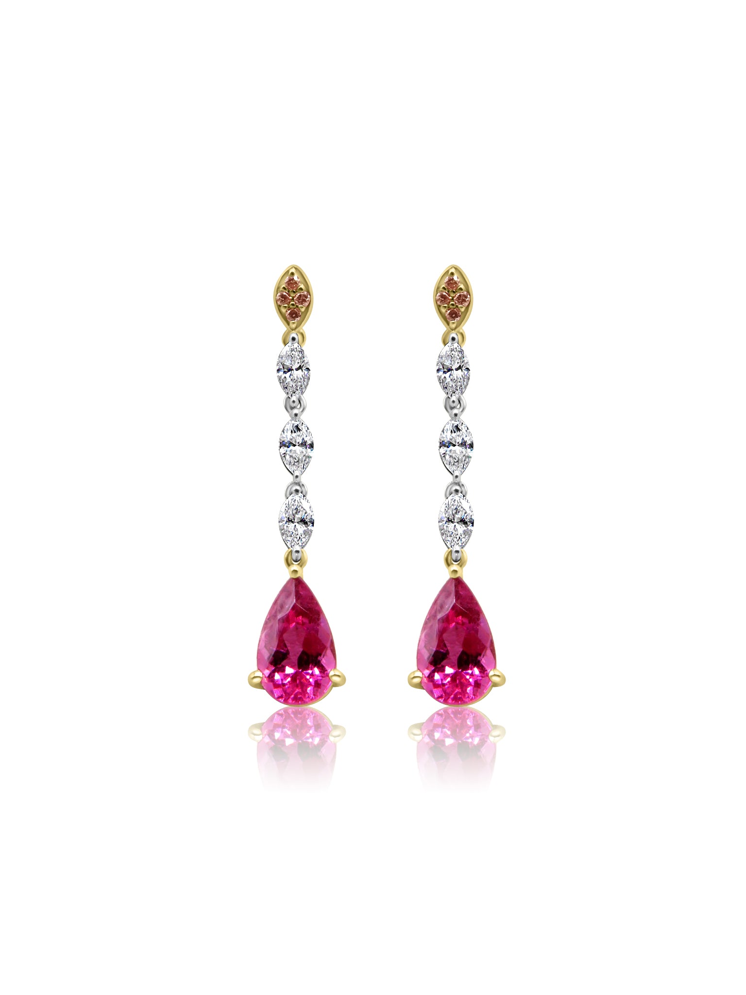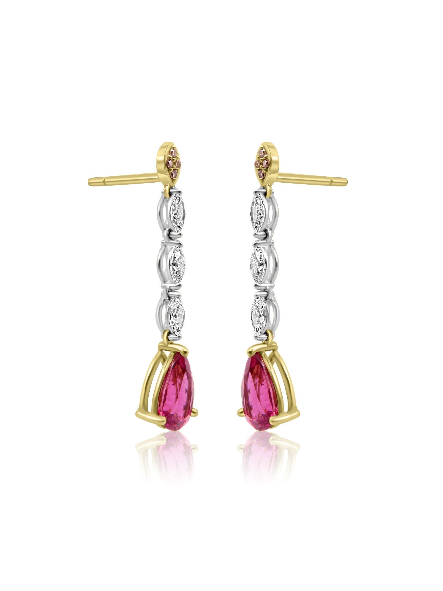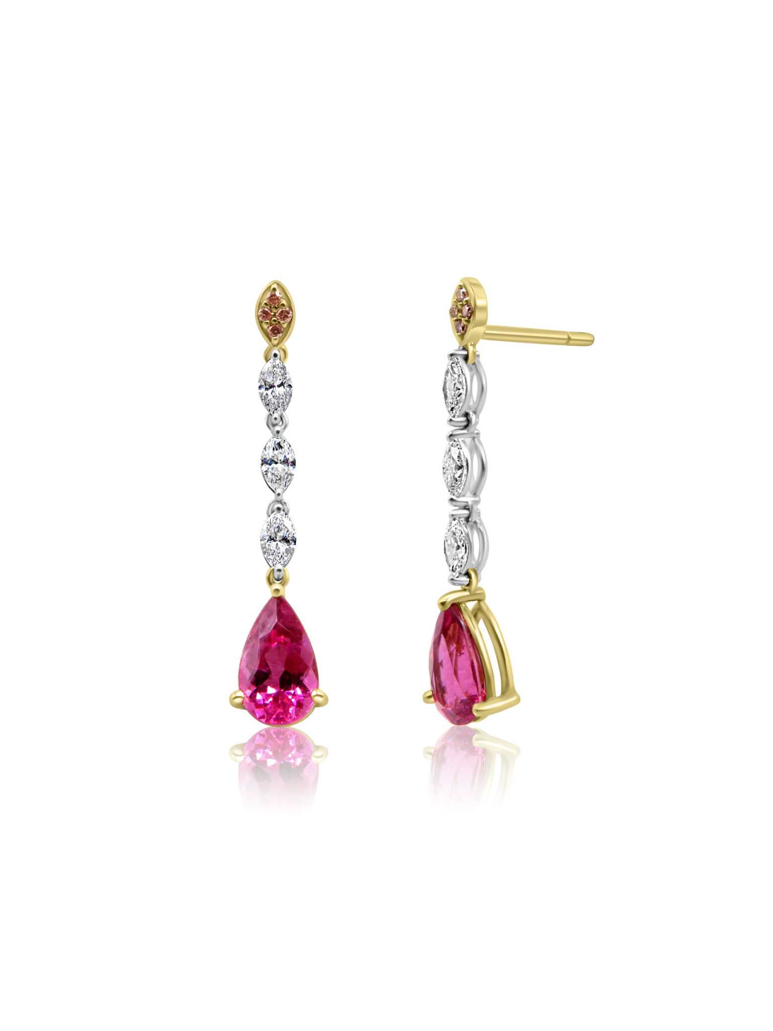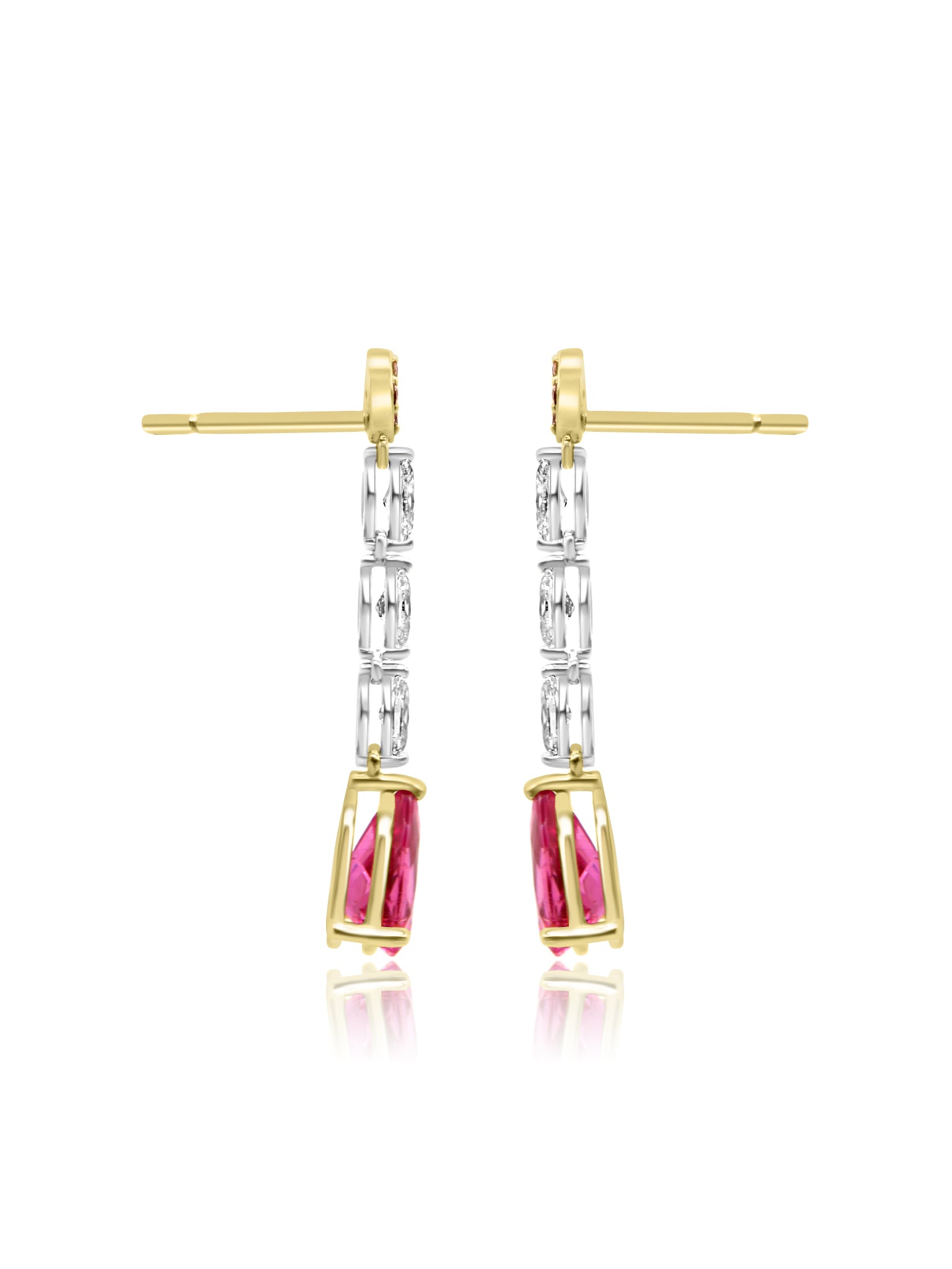Mozafarian drop earrings crafted with 18 karat gold and featuring striking rubylite and diamond accents.