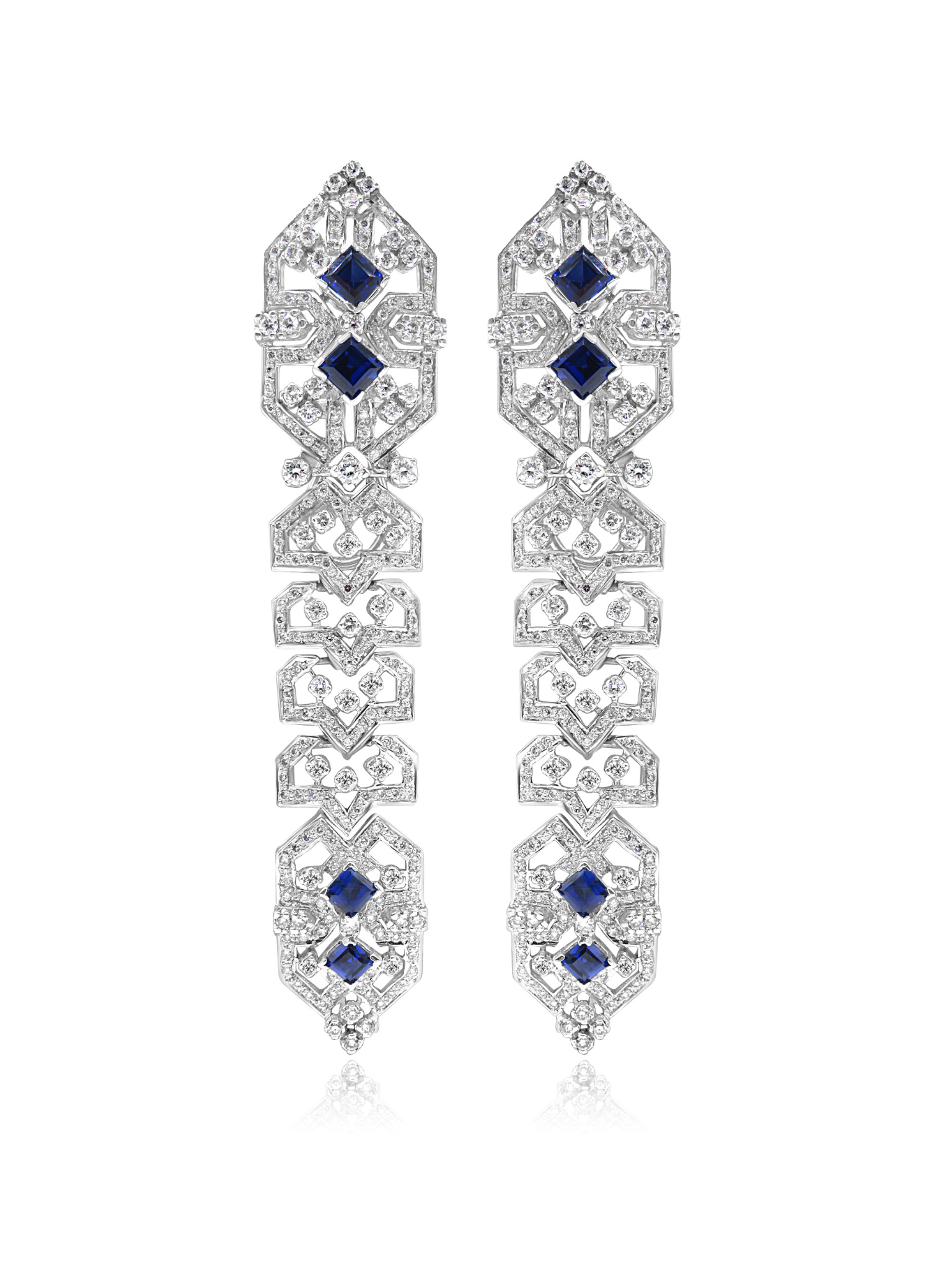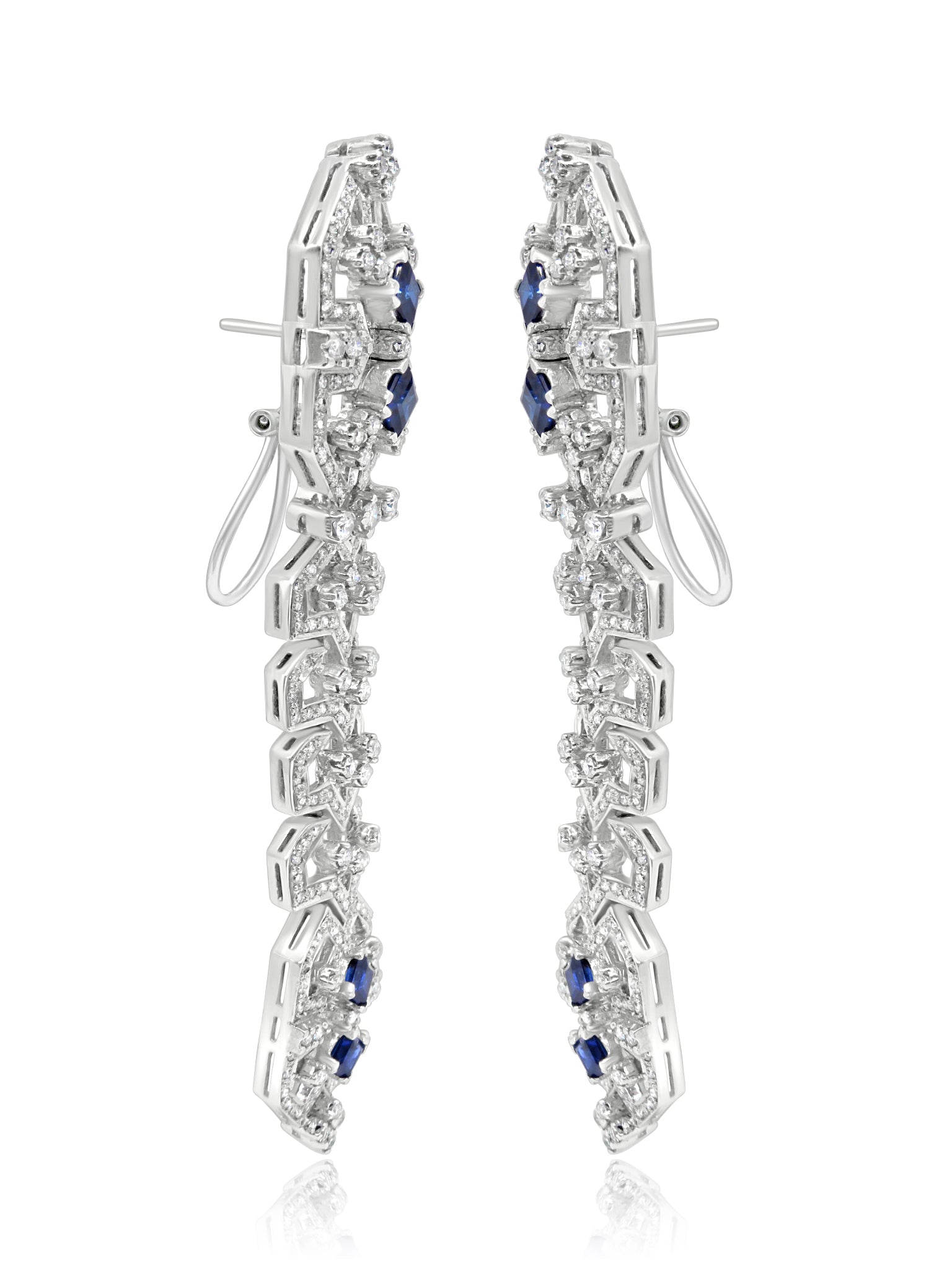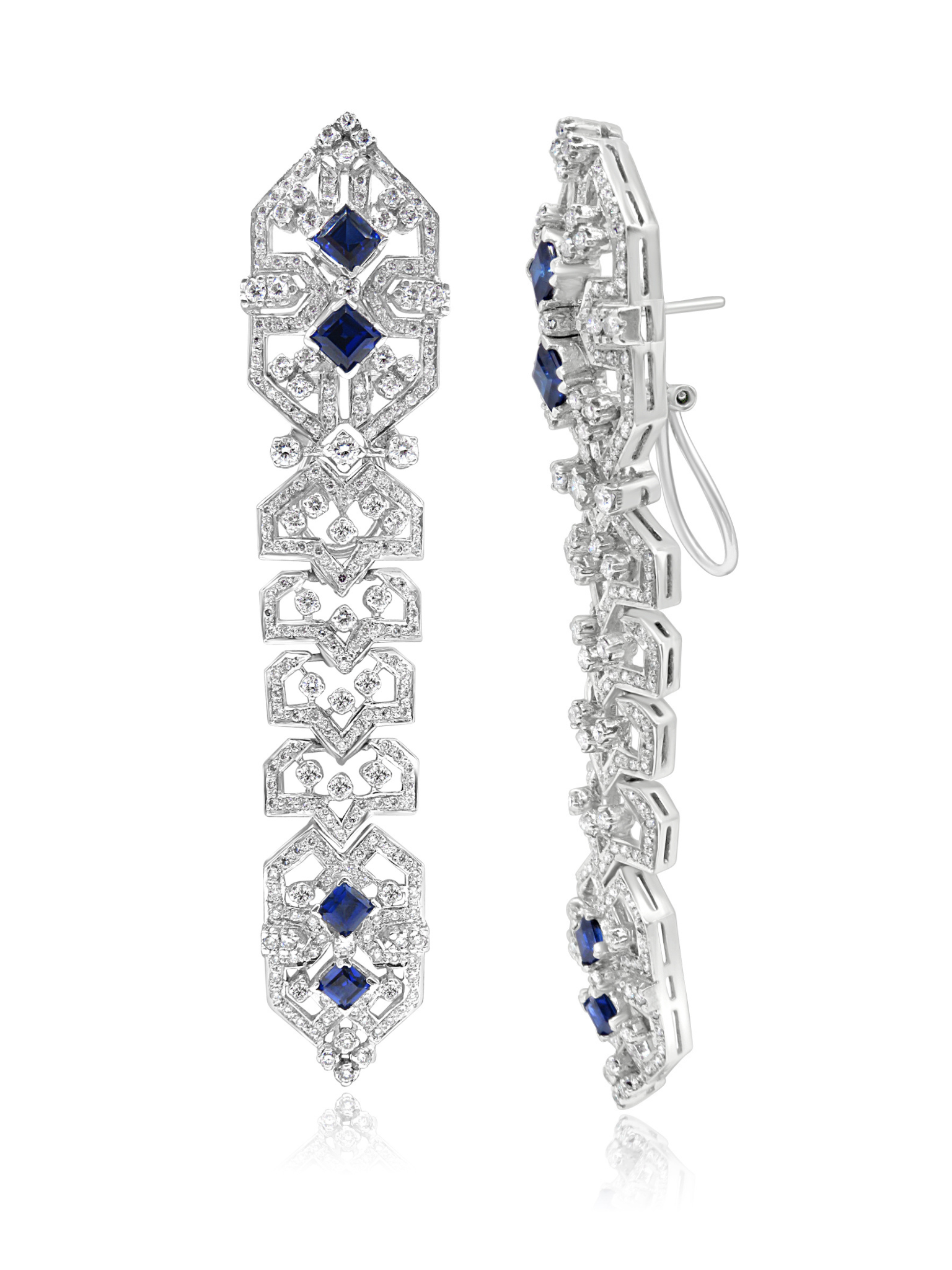 Stunning 18 karat white gold earrings adorned with diamonds and blue sapphires. The intricate design showcases a symmetrical pattern with princess-cut blue sapphires set in the centre, surrounded by sparkling diamonds. The geometric detailing adds a unique and luxurious touch, making these earrings a perfect statement piece for any elegant occasion.