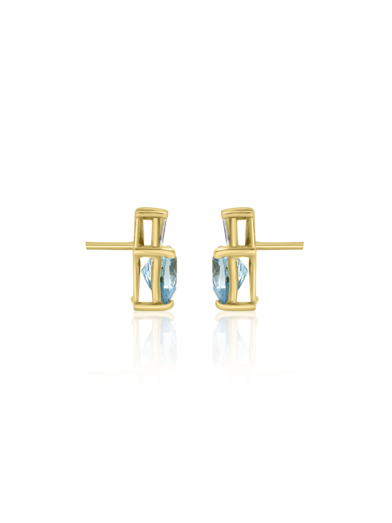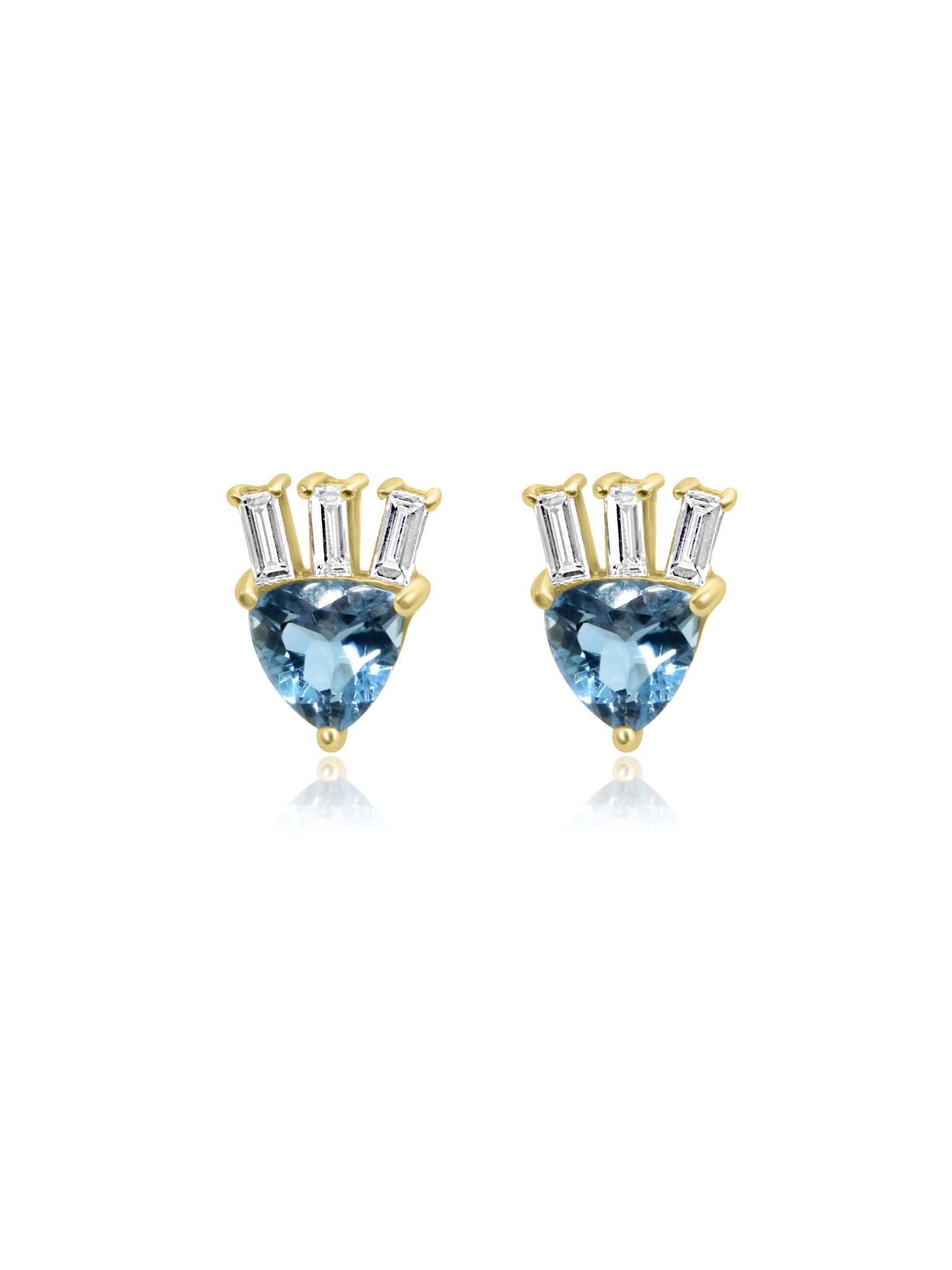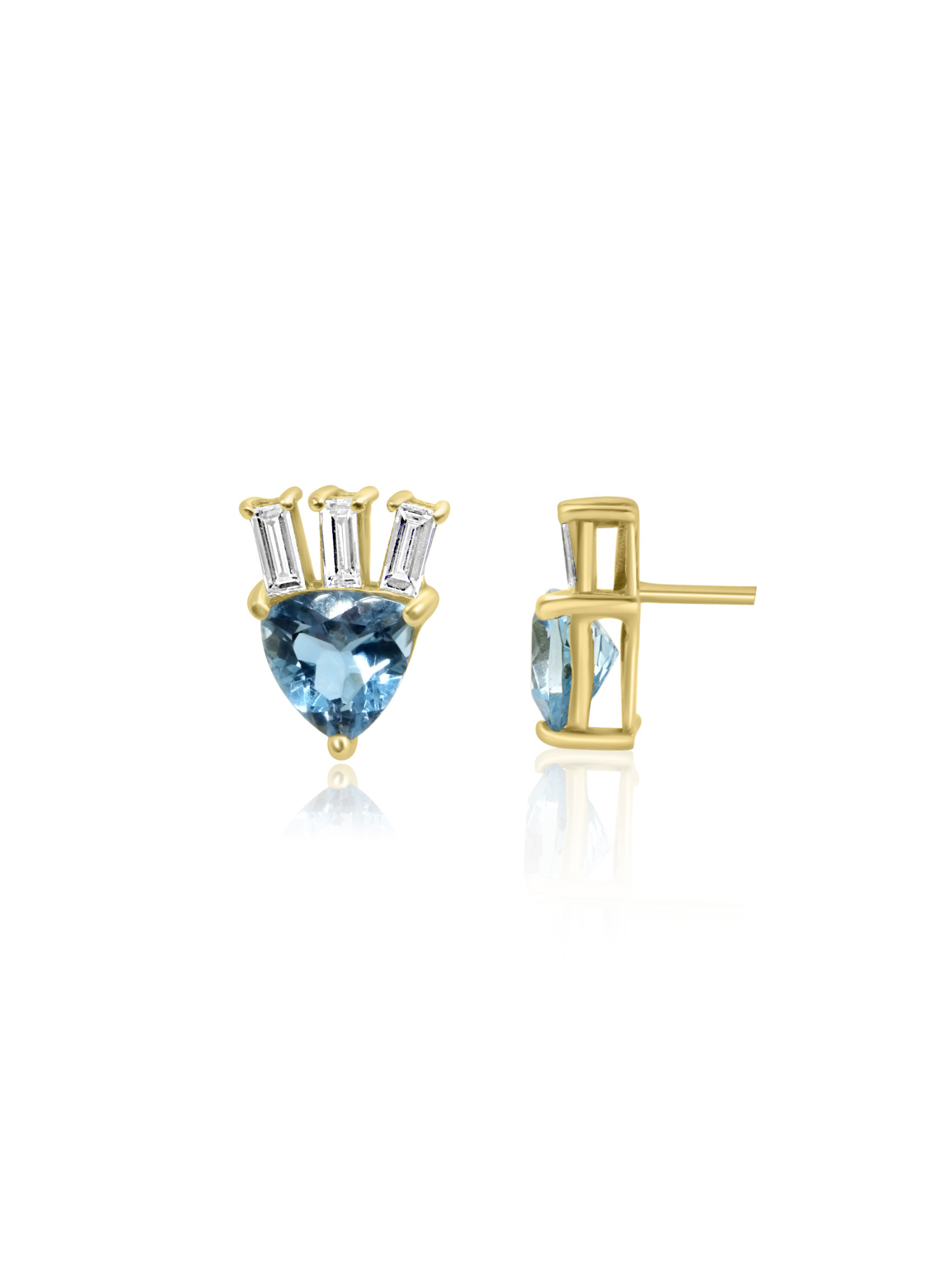 Mozafarian 18 karat gold aquamarine earrings adorned with diamonds along the top.