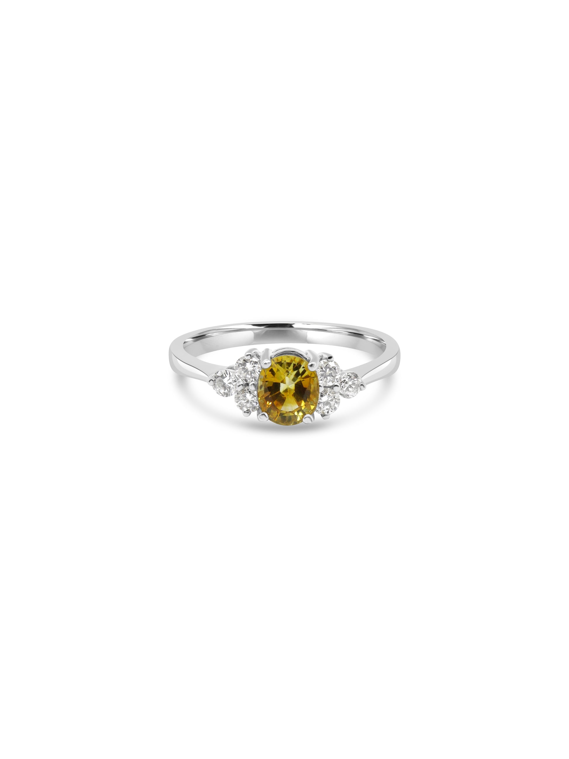 Mozafarian exquisite 18-karat white gold ring showcases a captivating yellow sapphire at its centre, complemented by six precisely positioned round diamonds—three flanking each side. A masterwork of refined craftsmanship and timeless elegance.