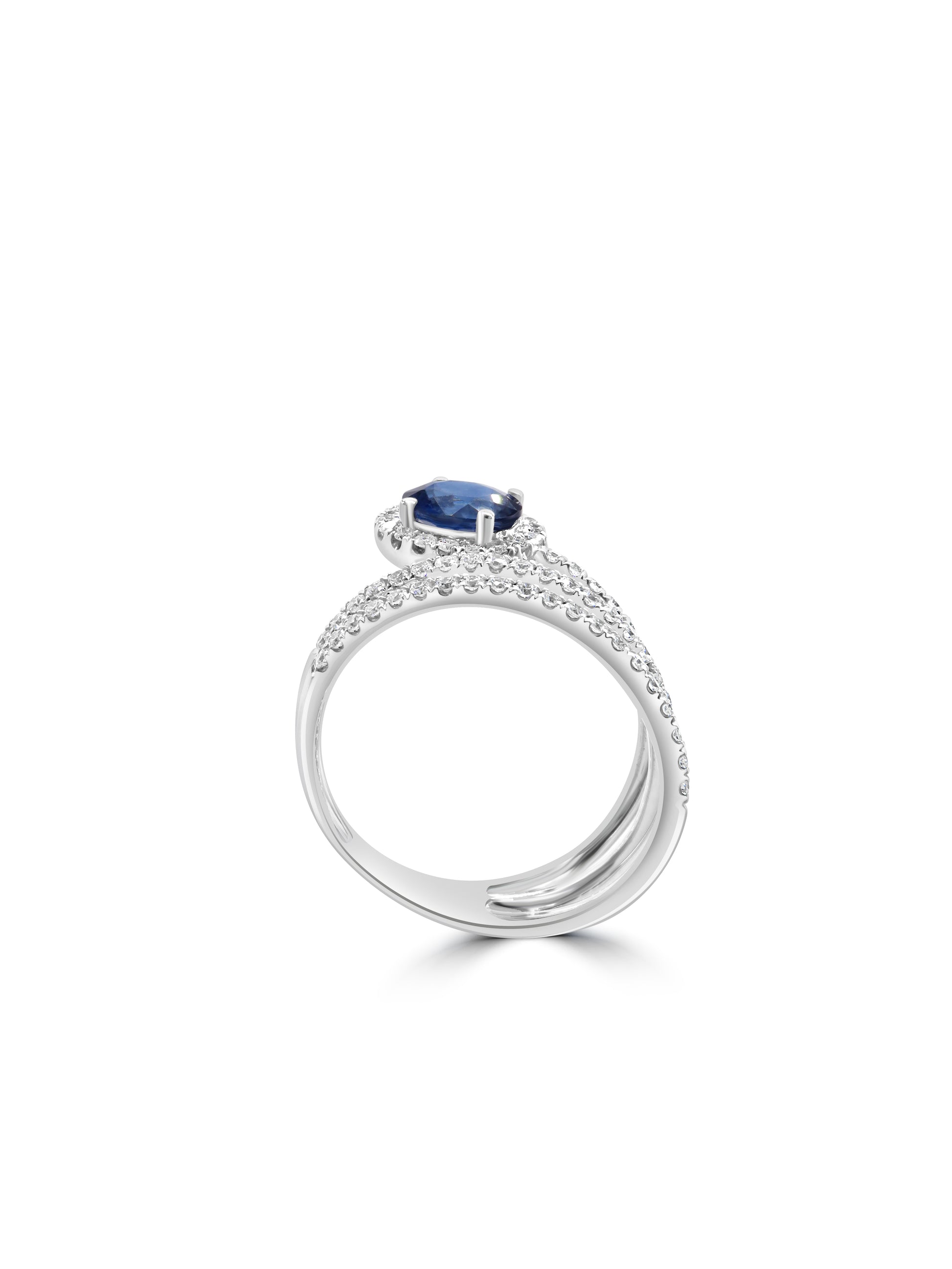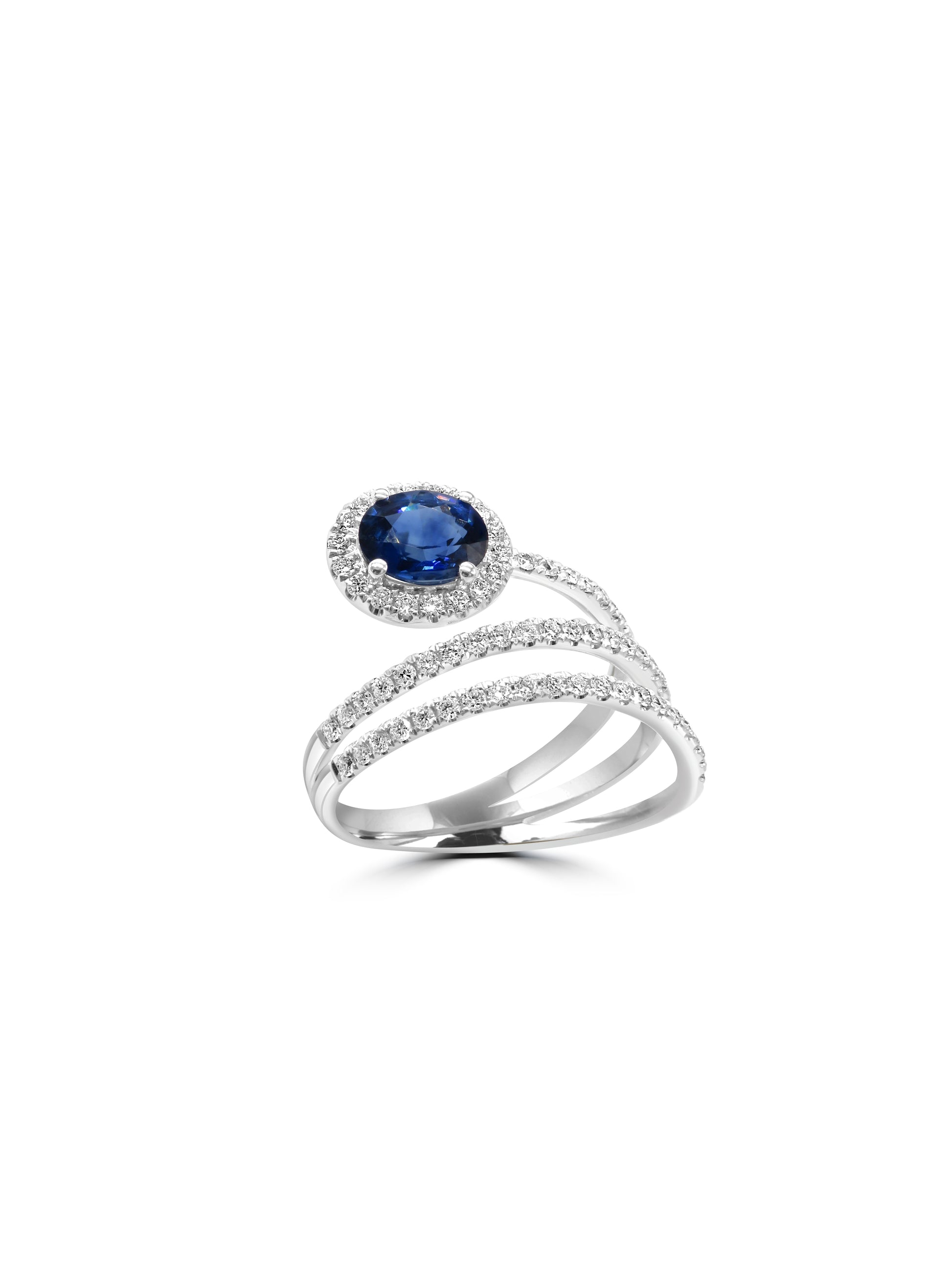 This 18 karat white gold ring by Mozafarian features a captivating blue sapphire at its centre, accented by a spiral arrangement of shimmering diamonds.