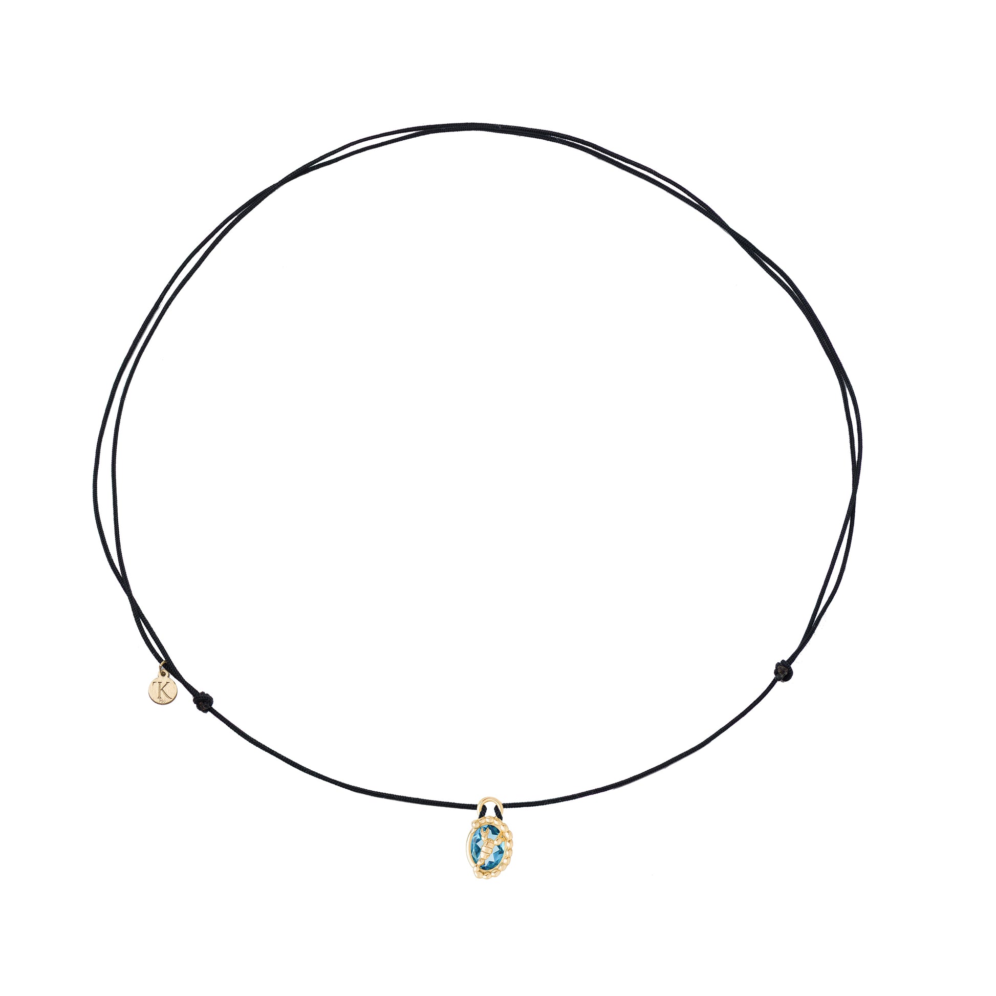 The pendant comes with a black adjustable chord with an 18k gold logo.