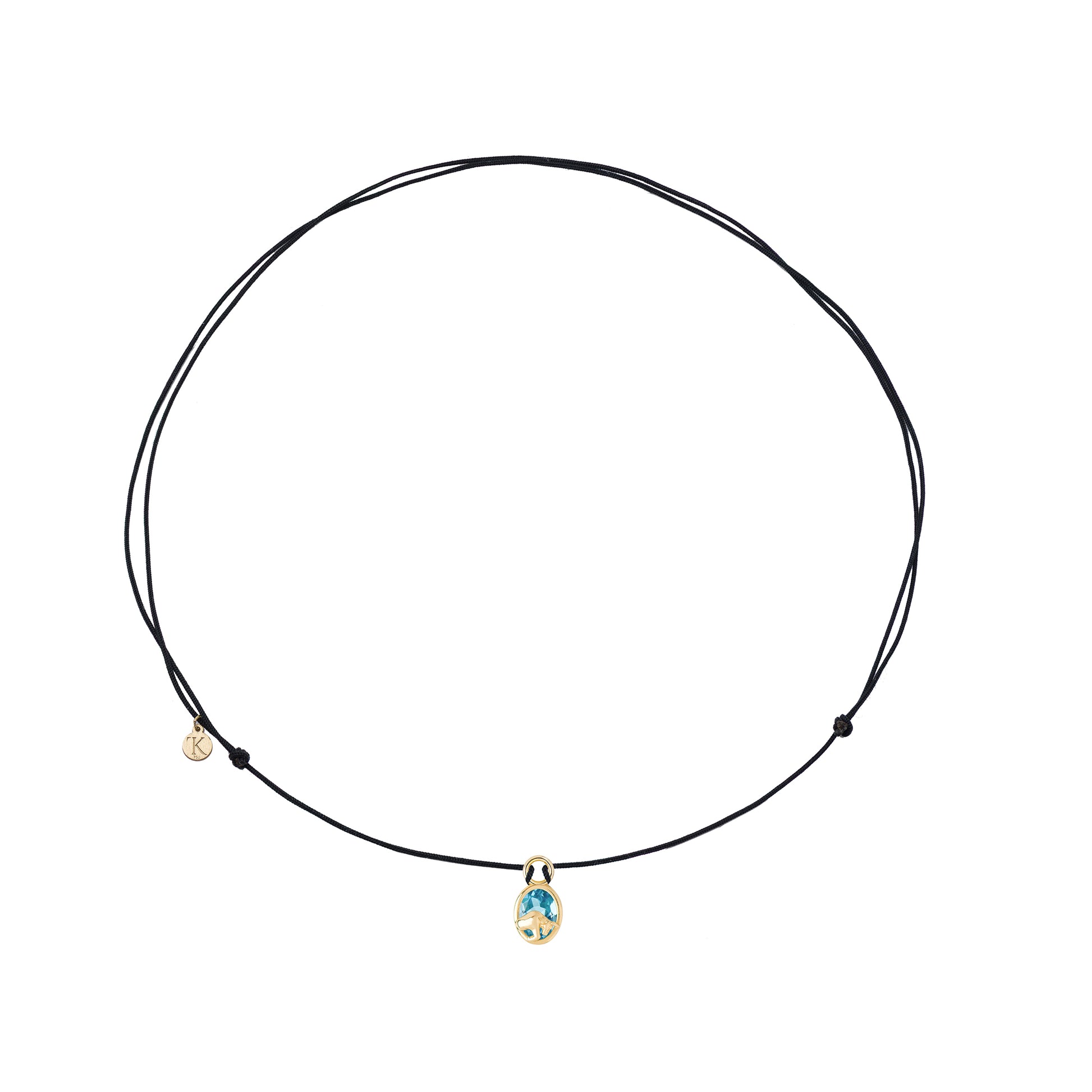 The pendant comes with a black adjustable chord with an 18k gold logo.
