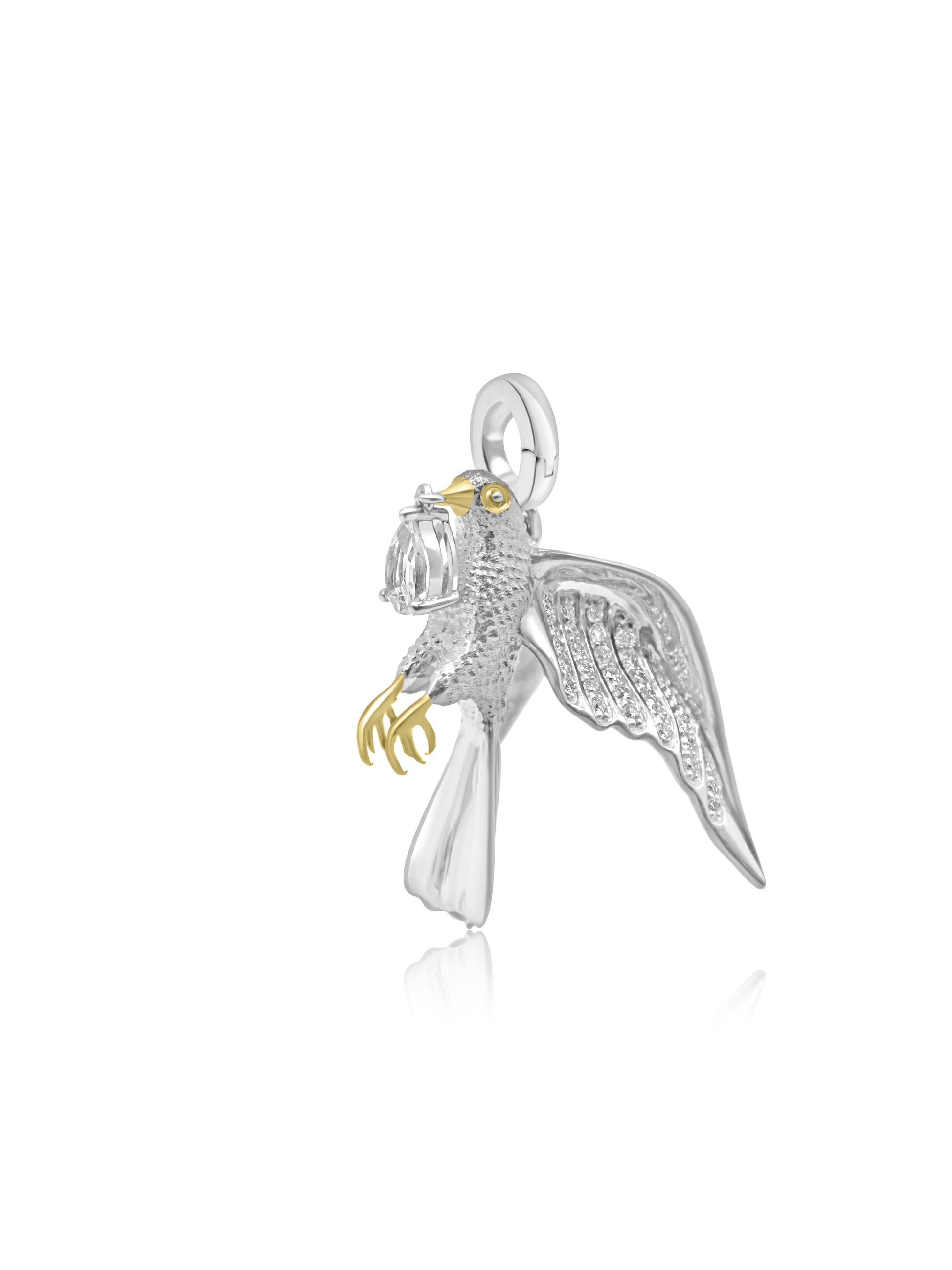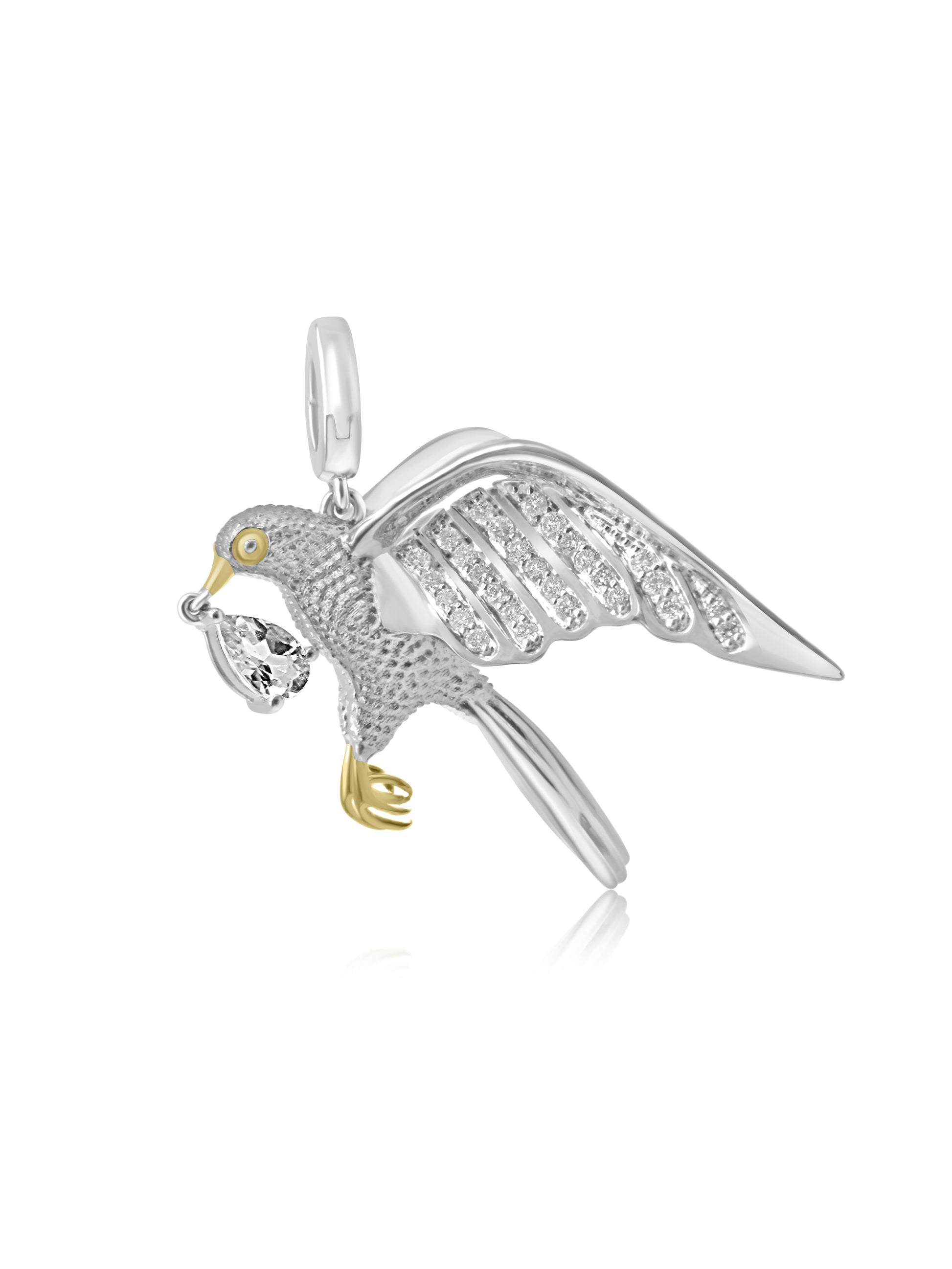 Unique Mozafarian bird charm crafted from 18 karat white and yellow gold, featuring rows of shimmering diamonds along the inner wings and a prominent diamond pendant from its beak.