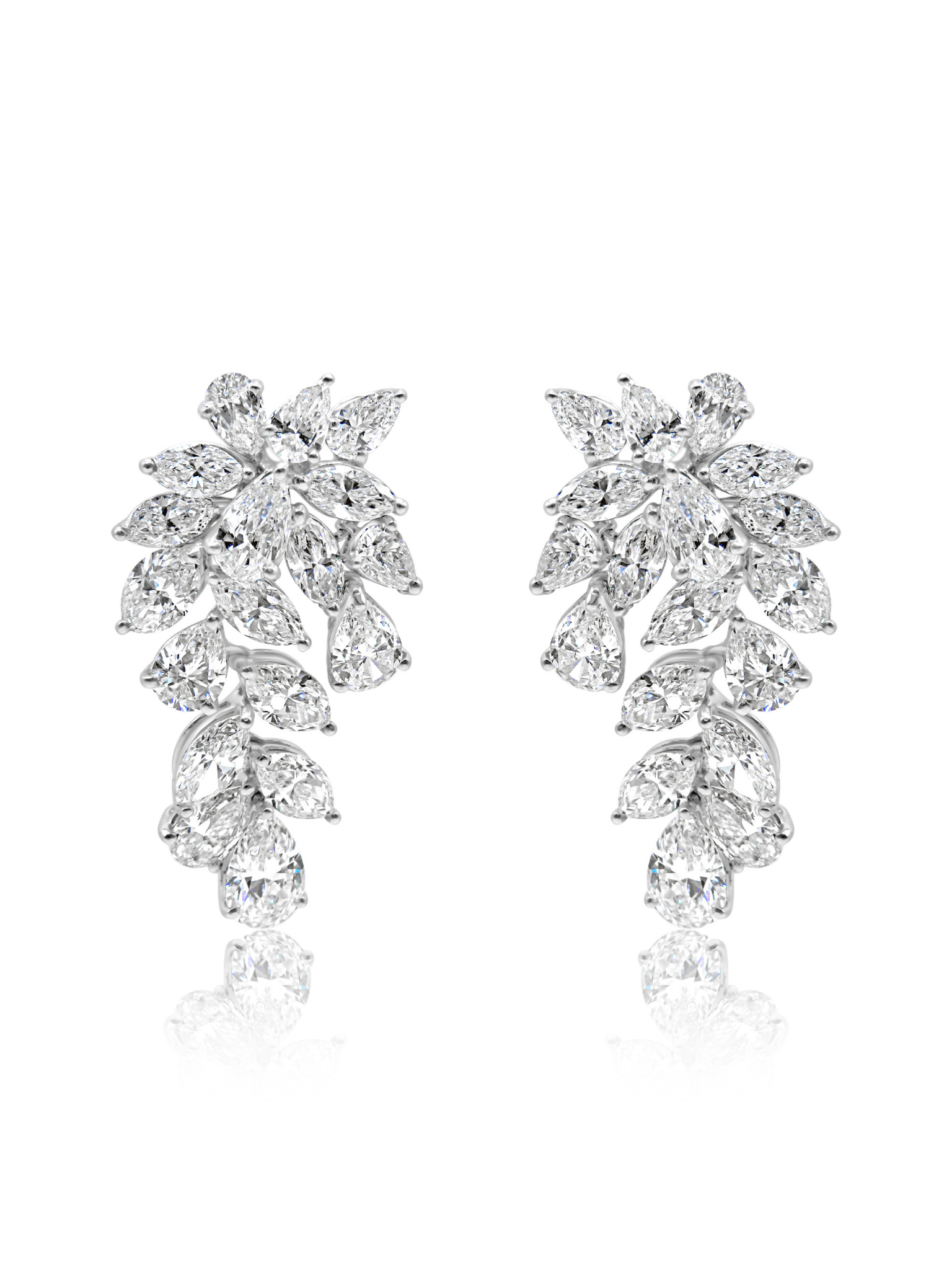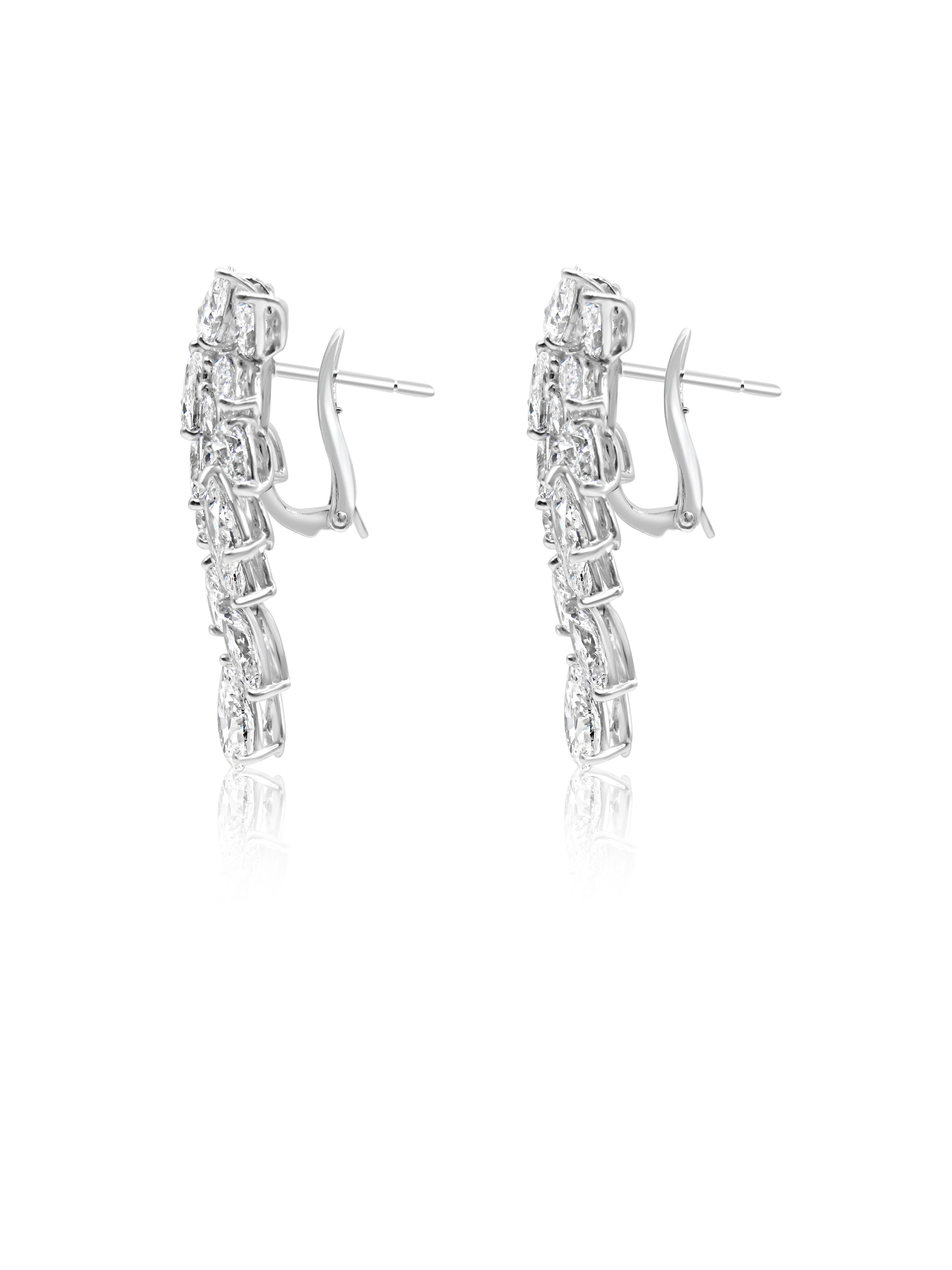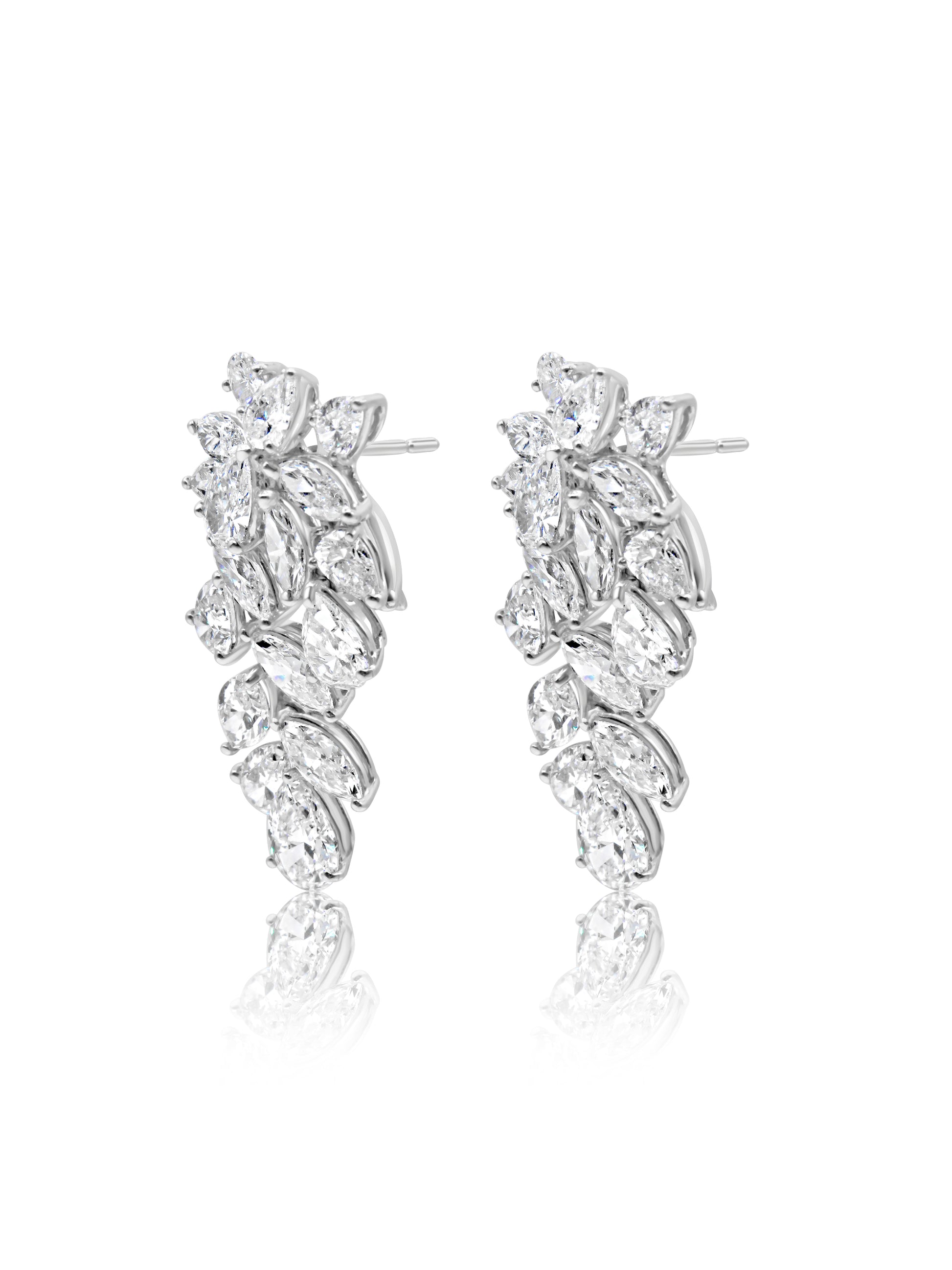 Exceptional Mozafarian 18-karat white gold drop earrings featuring a design that elegantly flows along the ear, adorned with marquise and pear-shaped diamonds of significant brilliance.