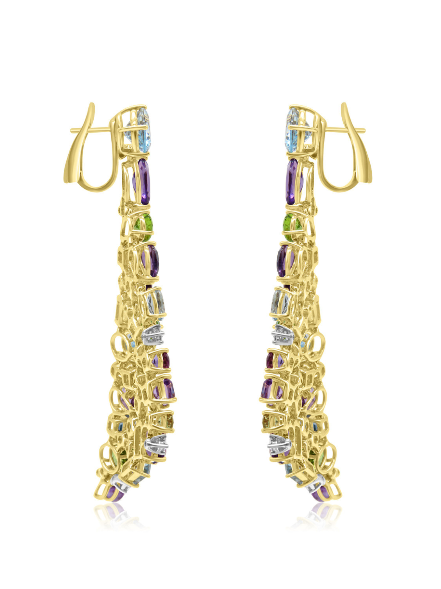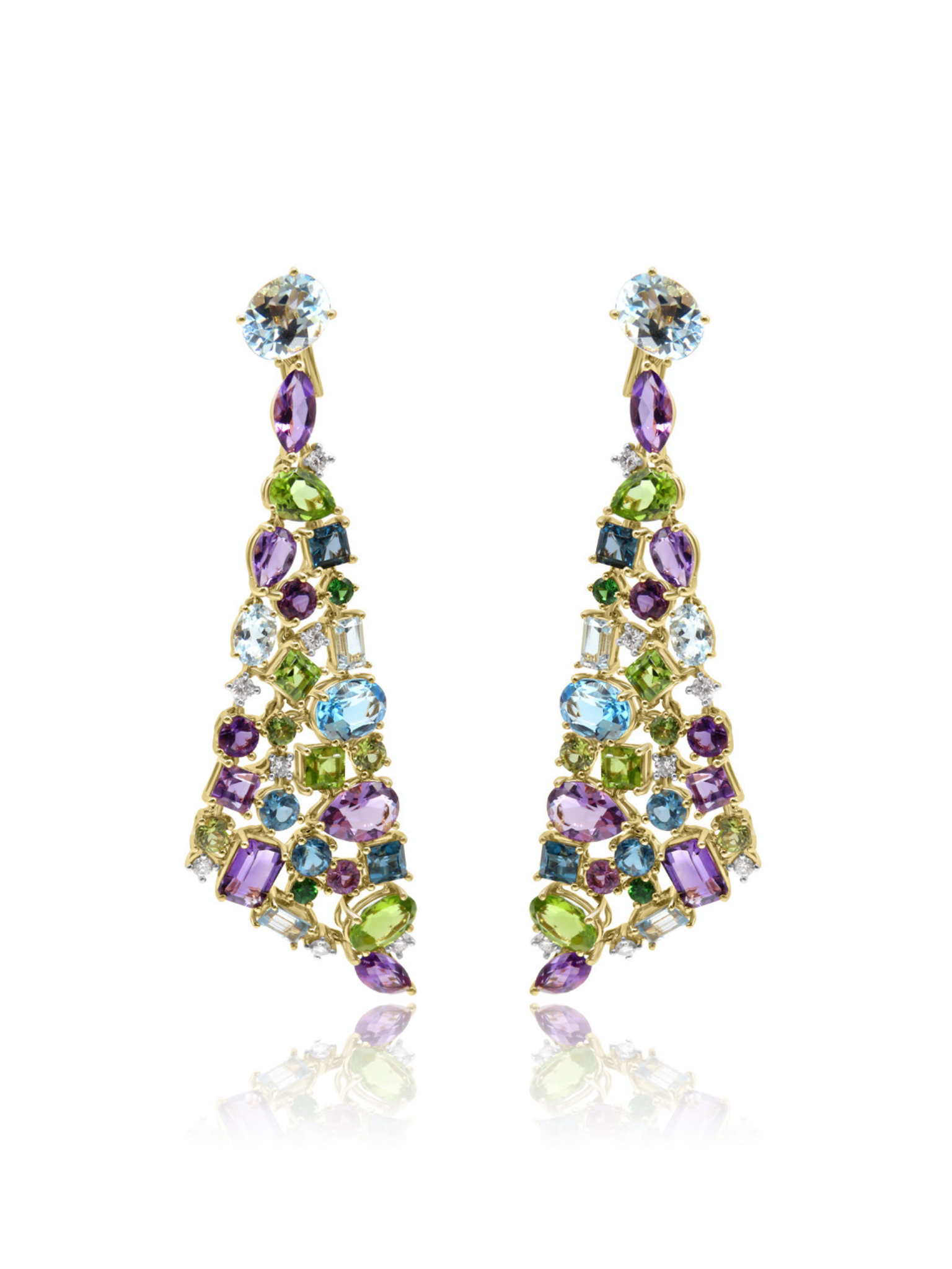 Magnificent Mozafarian 18 karat gold chandelier earrings adorned in an array of vibrant gemstones, including purple amethysts, green peridots, bright blue aquamarines, sapphires and of course, dazzling diamonds to complete the colourful look.